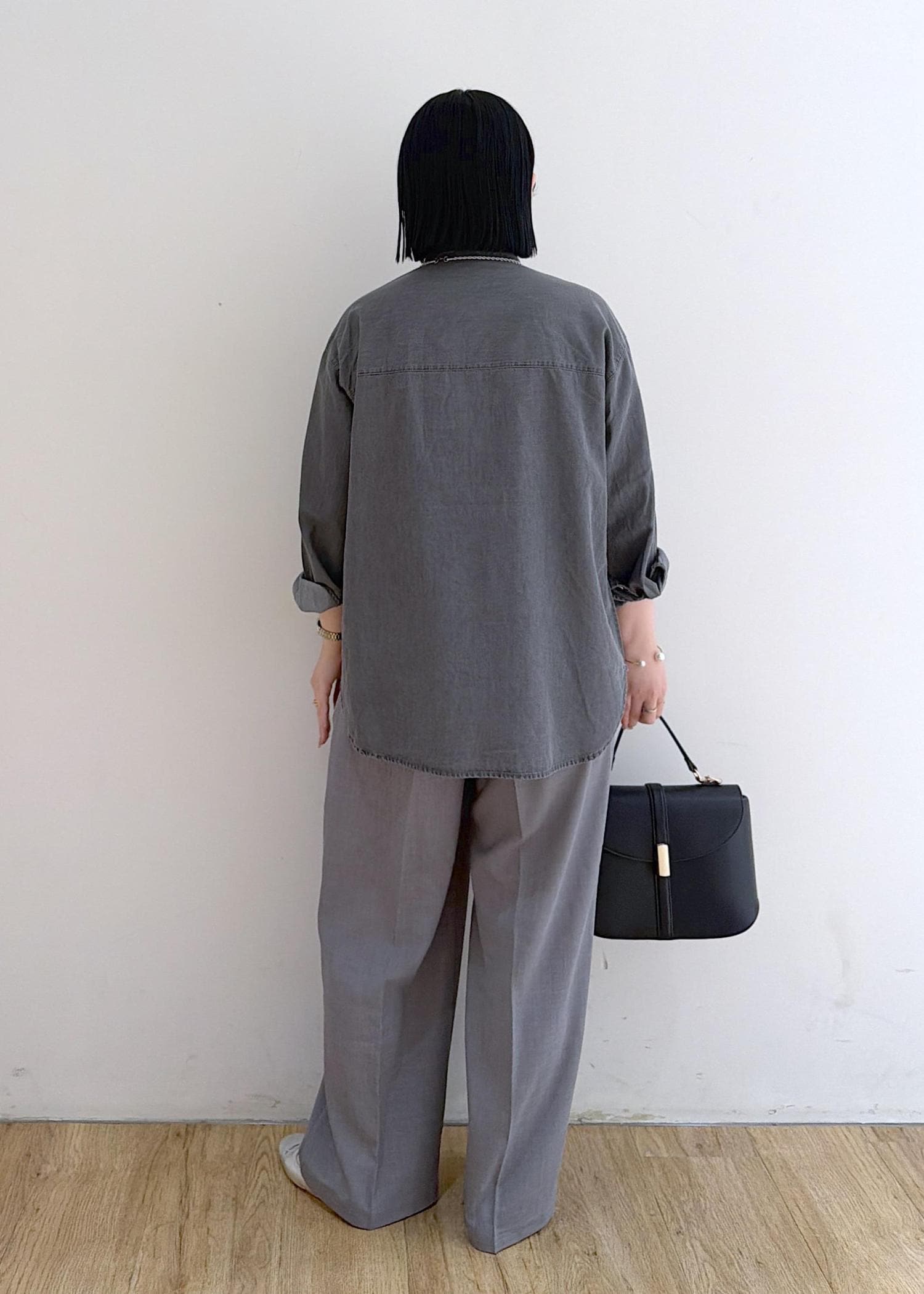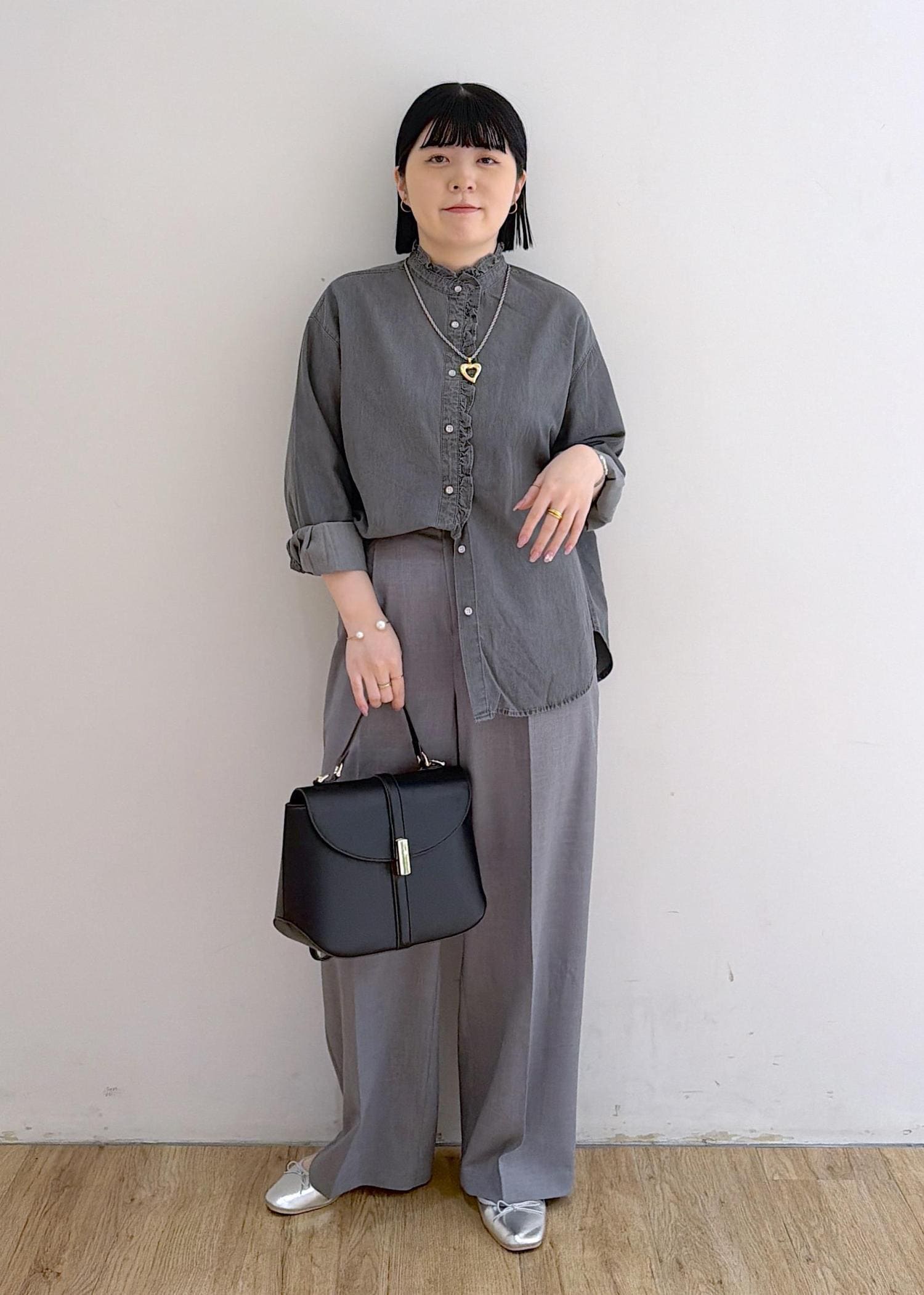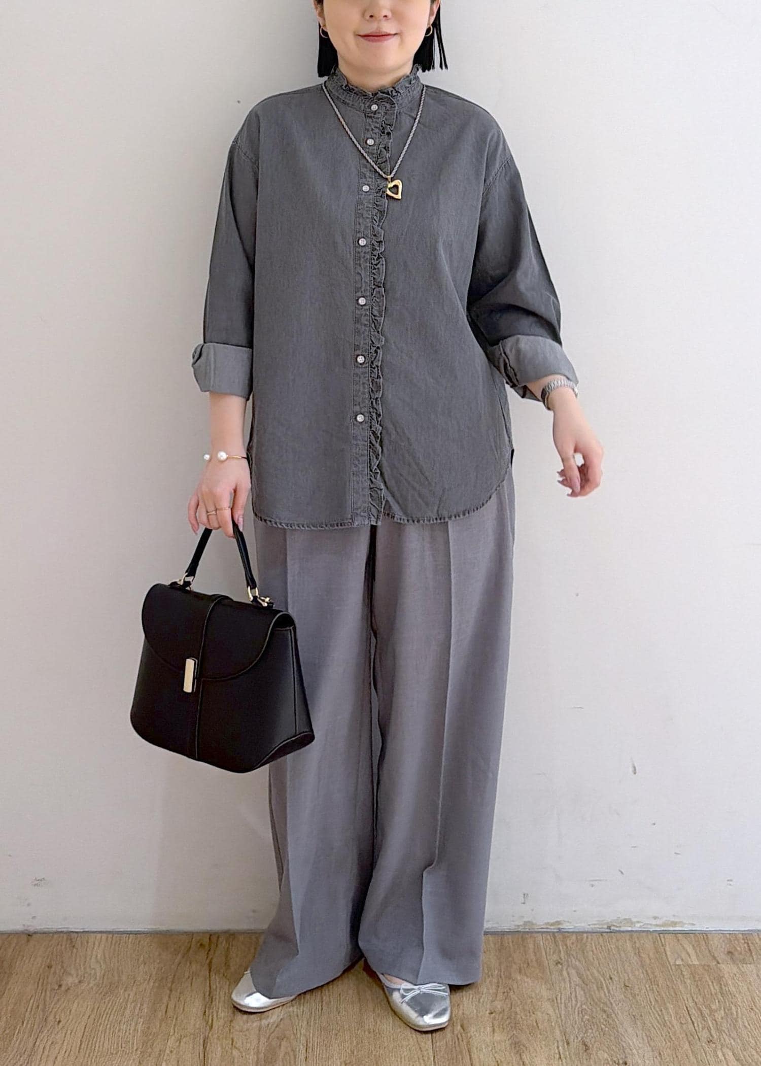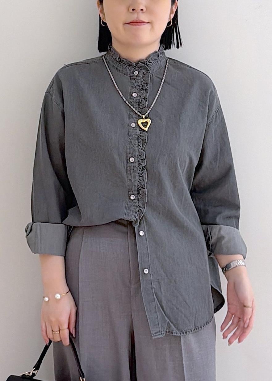 ROPÉ PICNICシャンブレーフリルシャツ/イージーケアチャコール / F¥5,995レビューデニムライクなフリルシャツです☺︎156cmでヒップが隠れる着丈。柔らかい素材で1枚でもヘルシーに着用頂けます◎骨ストさんは首元が詰まるので開けて着るのがおすすめです☺︎