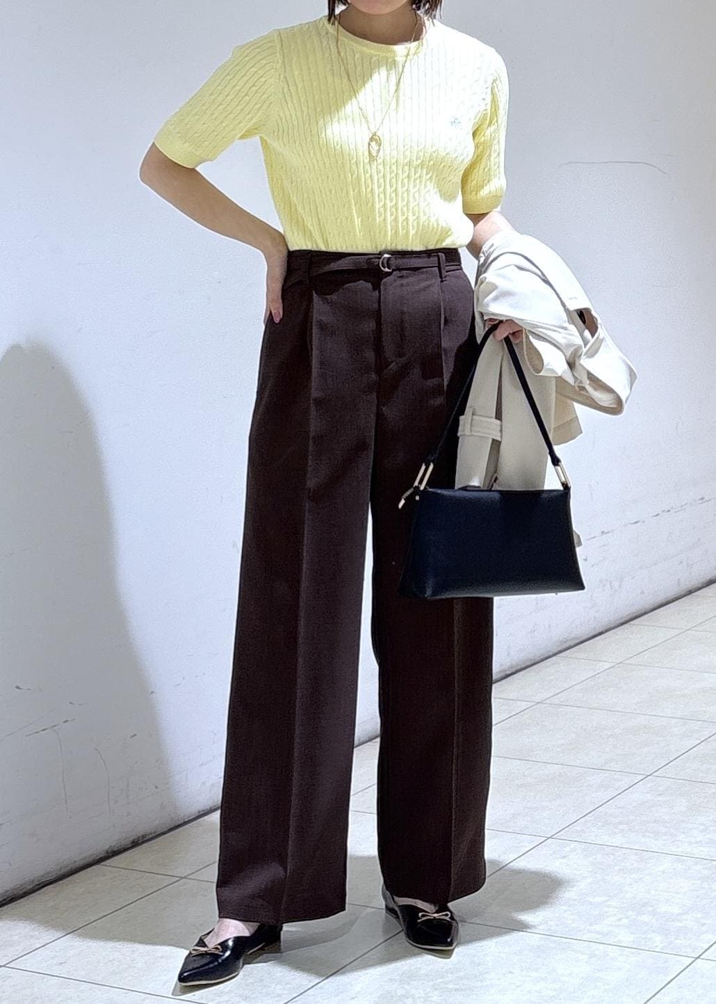ブラウンのワイドパンツを合わせた大人カジュアルコーデ。