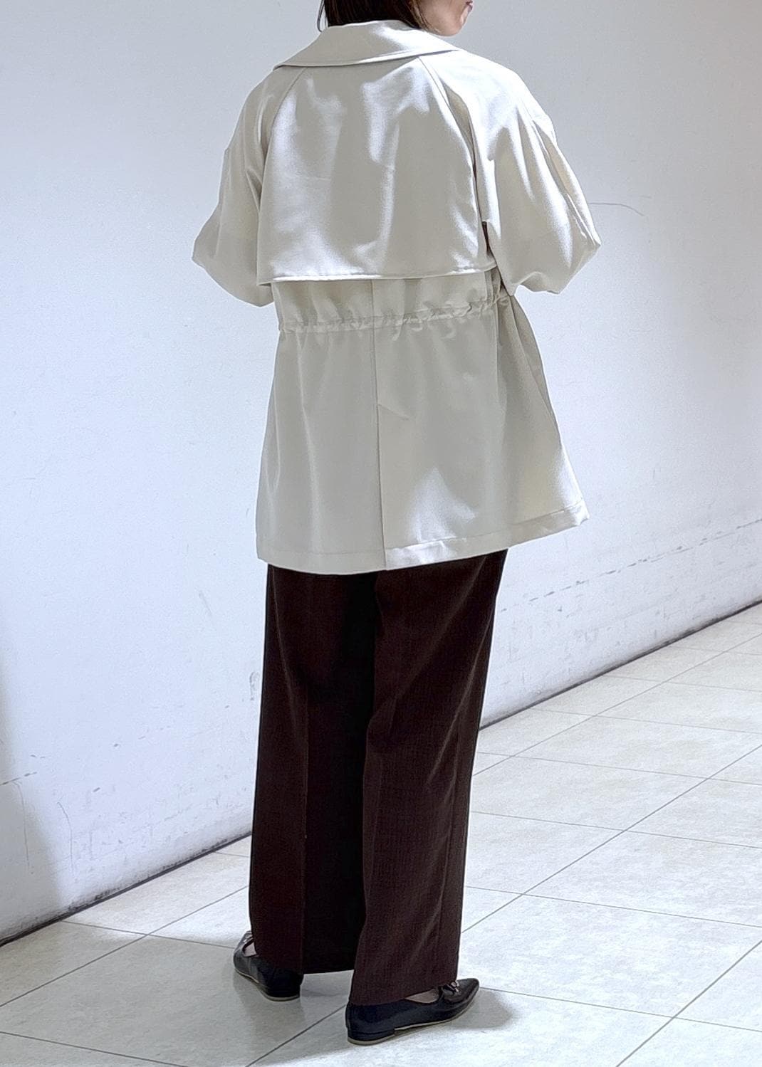 肩まわりはゆとりがありインナーに重ね着をしても腕を通しやすいサイズ感です。 -