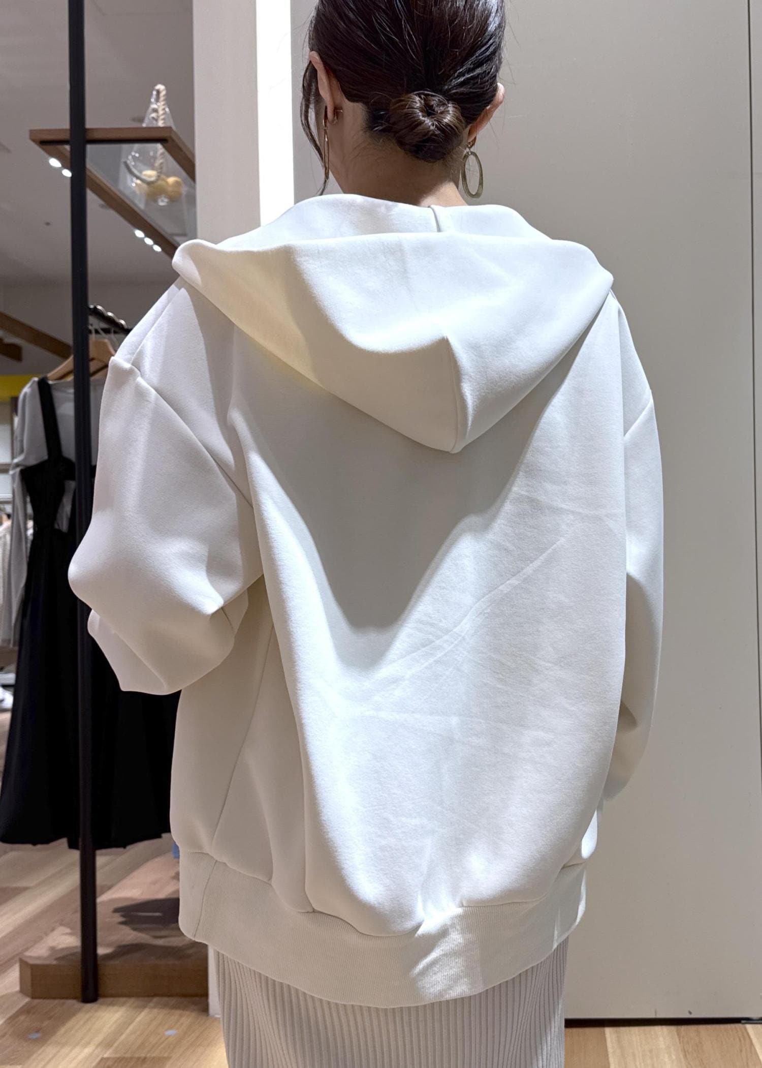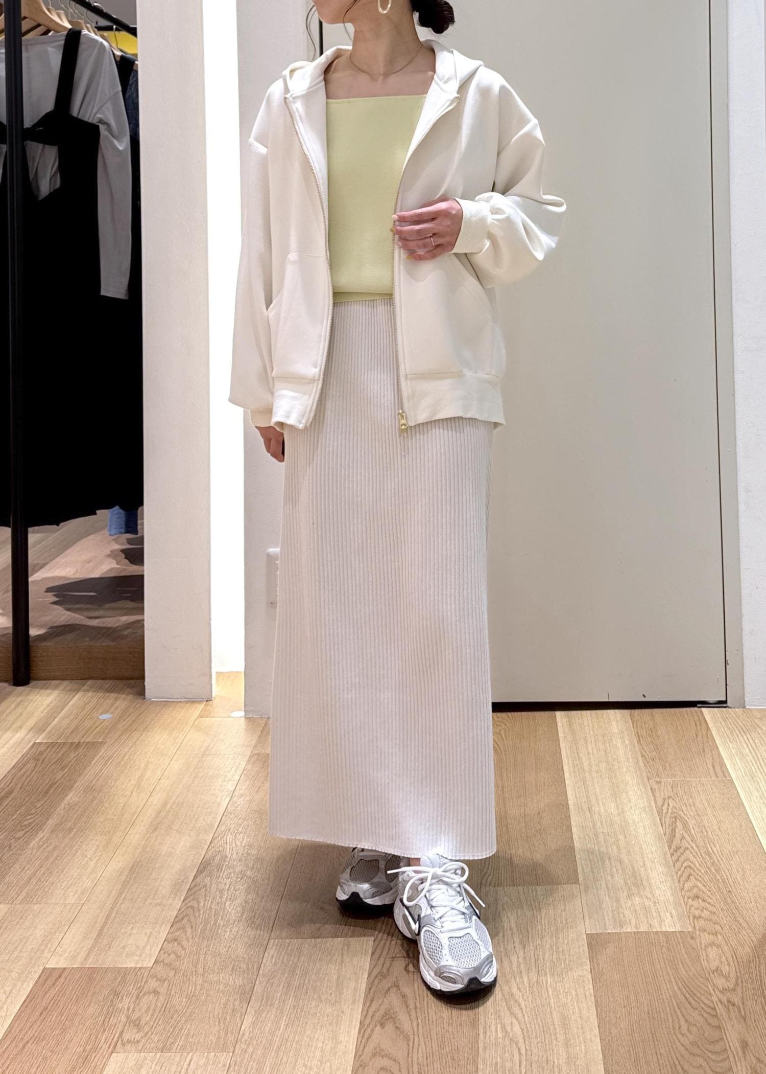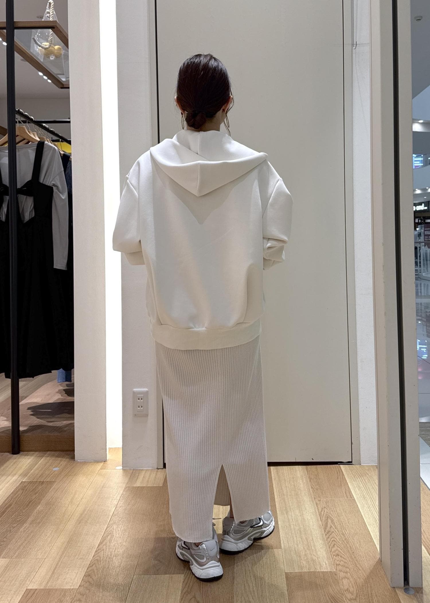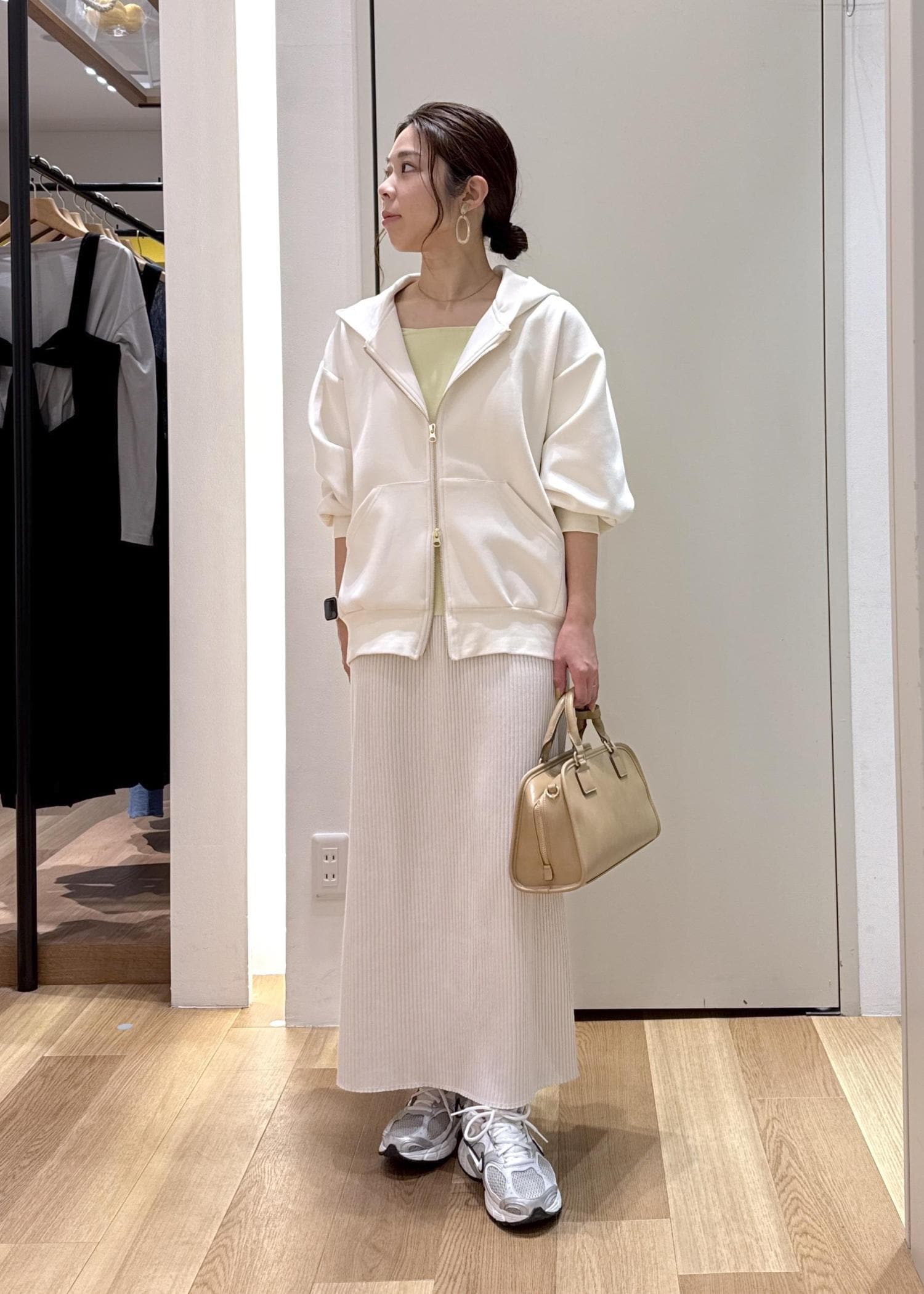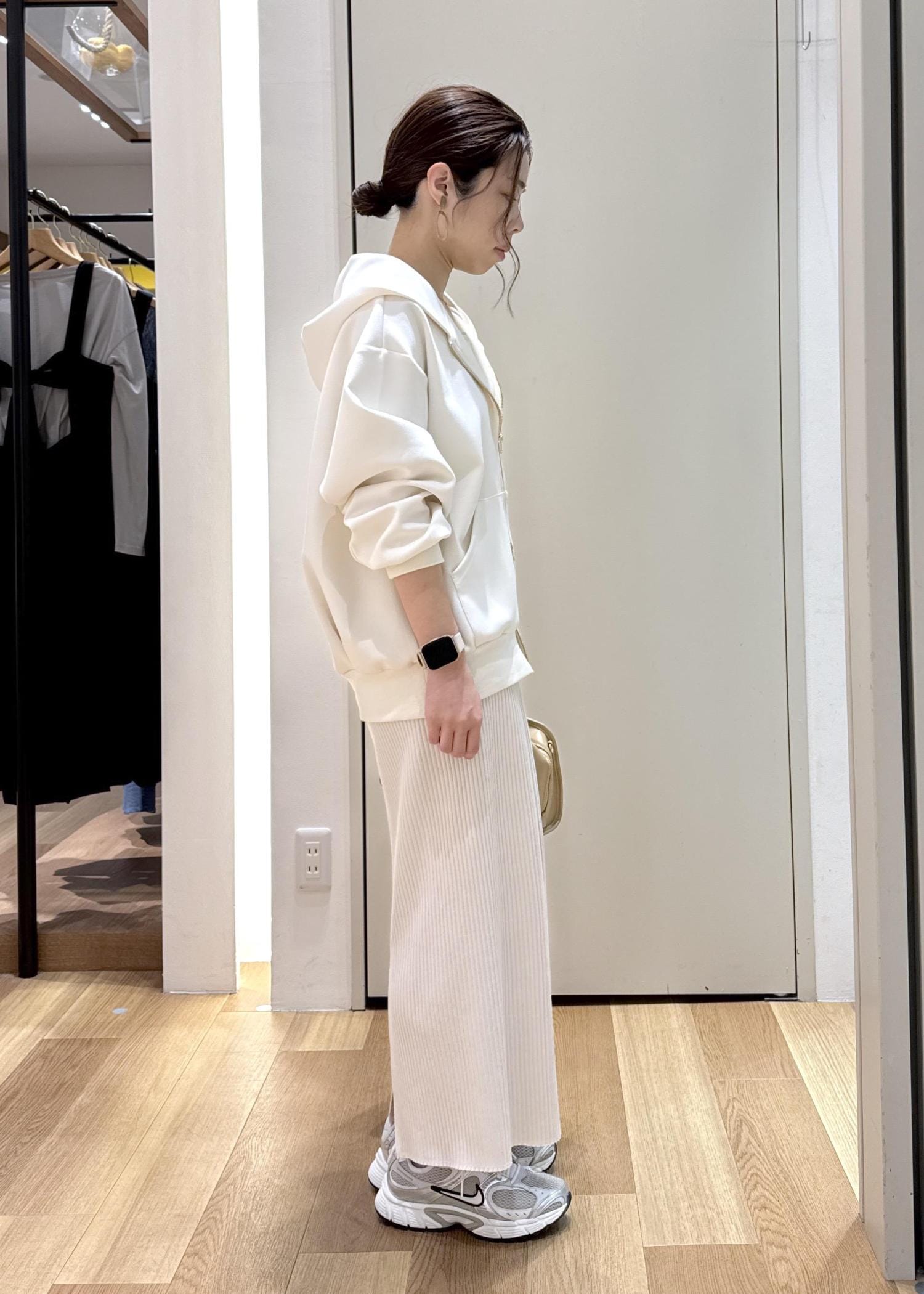 白のフーディに白のスカートを合わせた今年トレンドのオールホワイトコーデにしてみました!