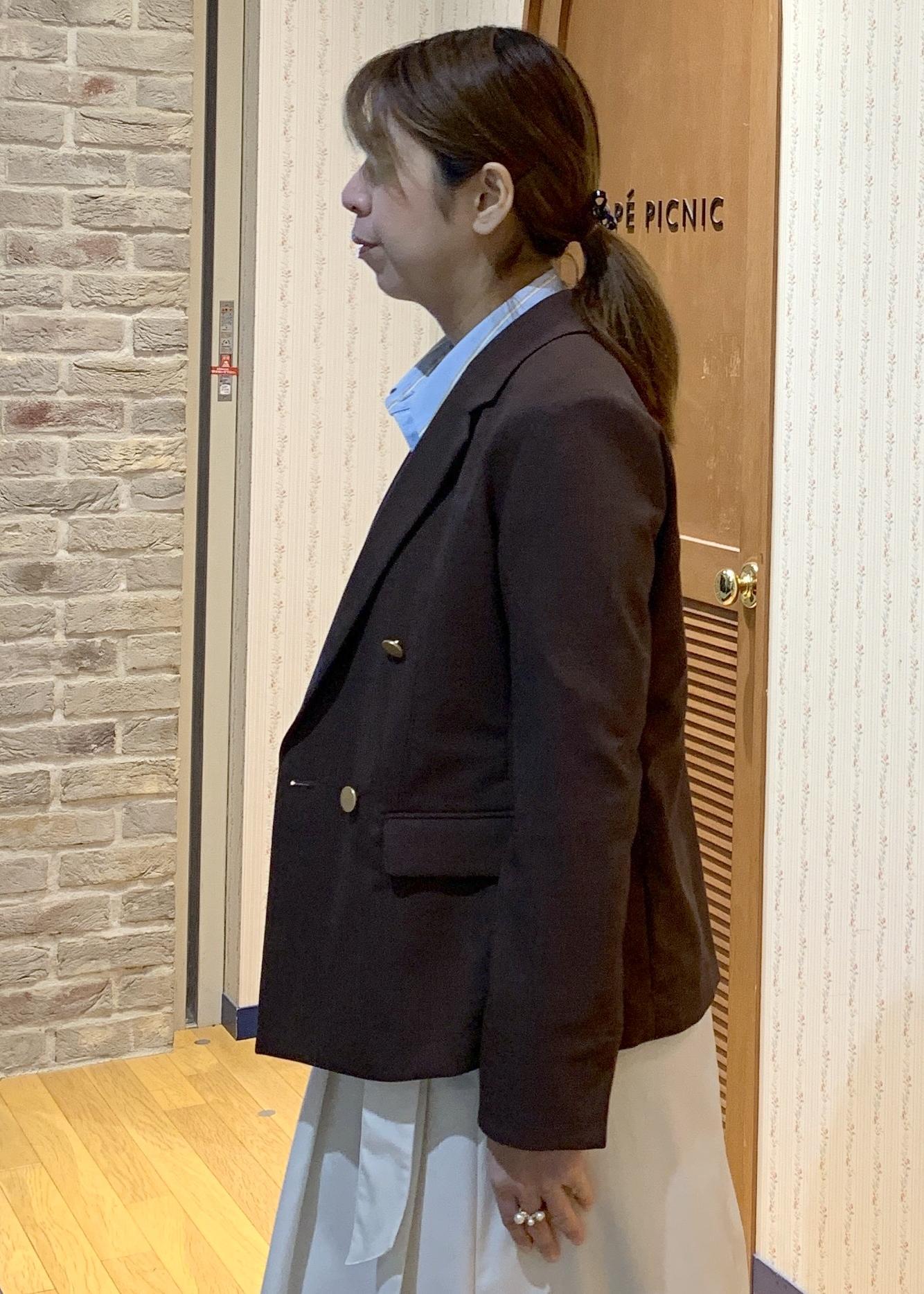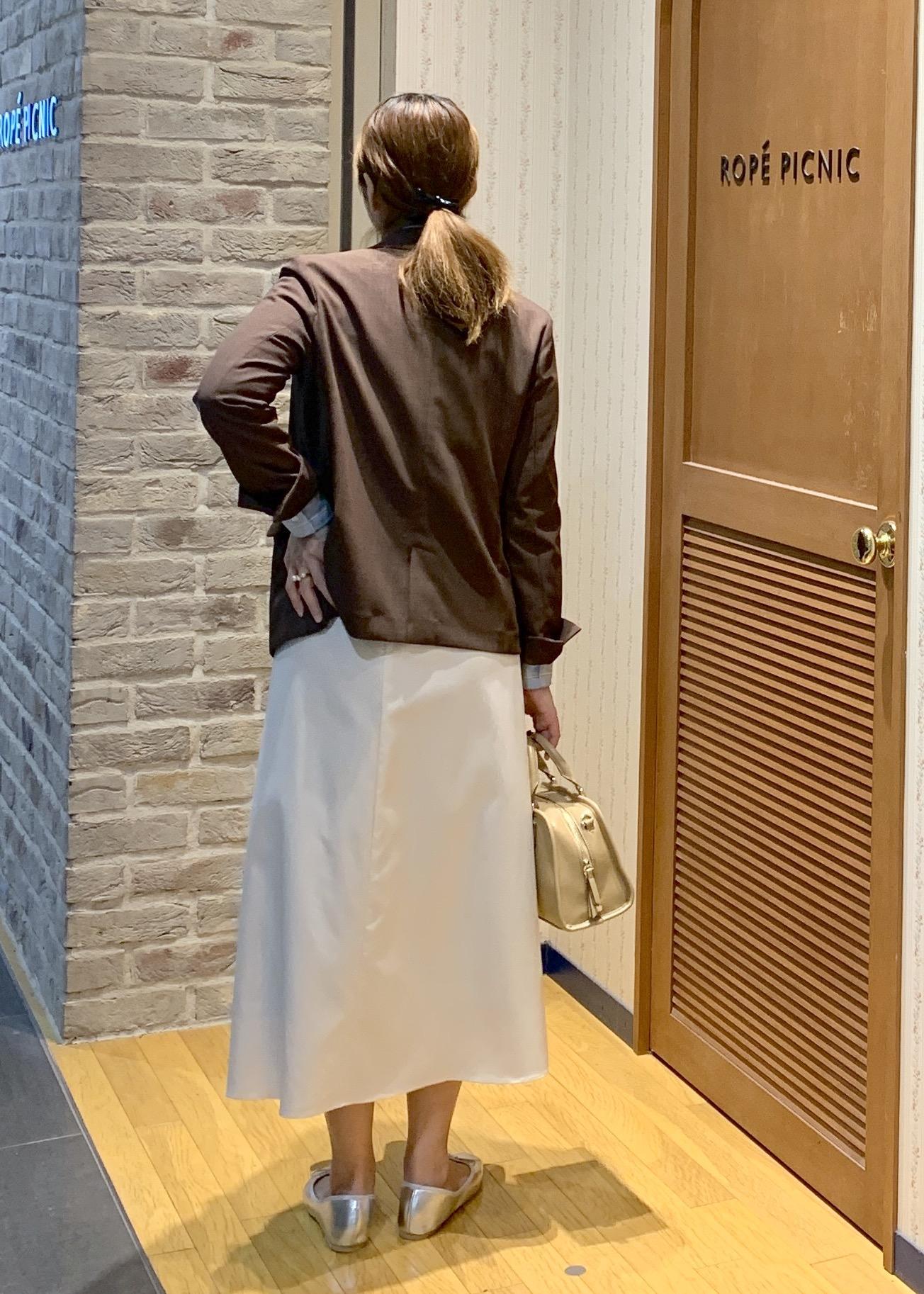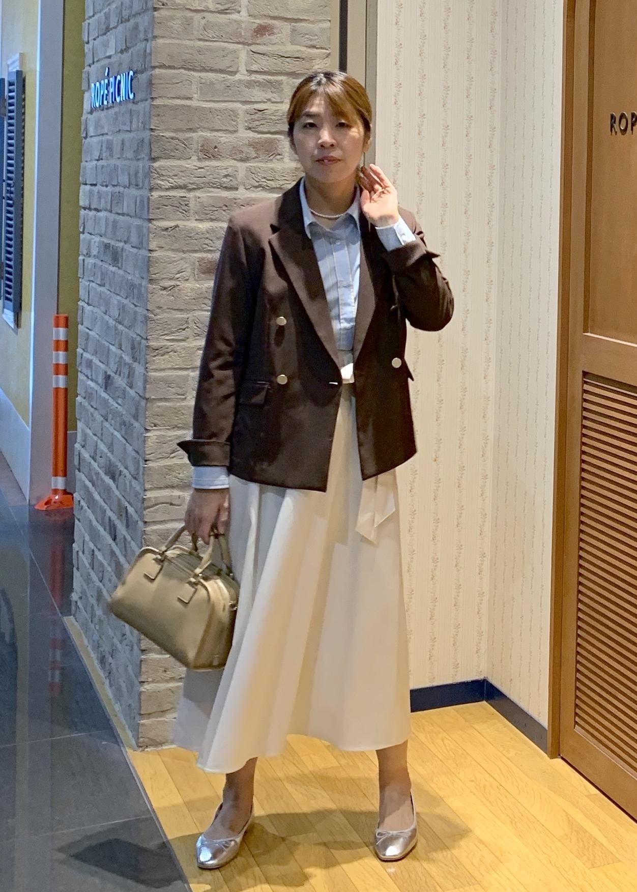 ご好評いただいているカナパ金釦ジャケットのブラウンに白のフレアスカートを合わせて上品で爽やかなオフィスカジュアルスタイリングです。