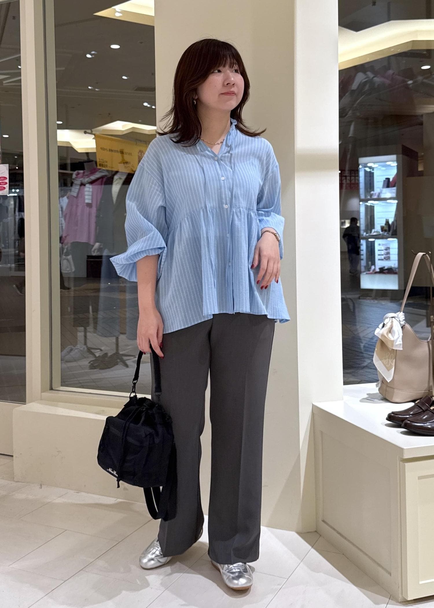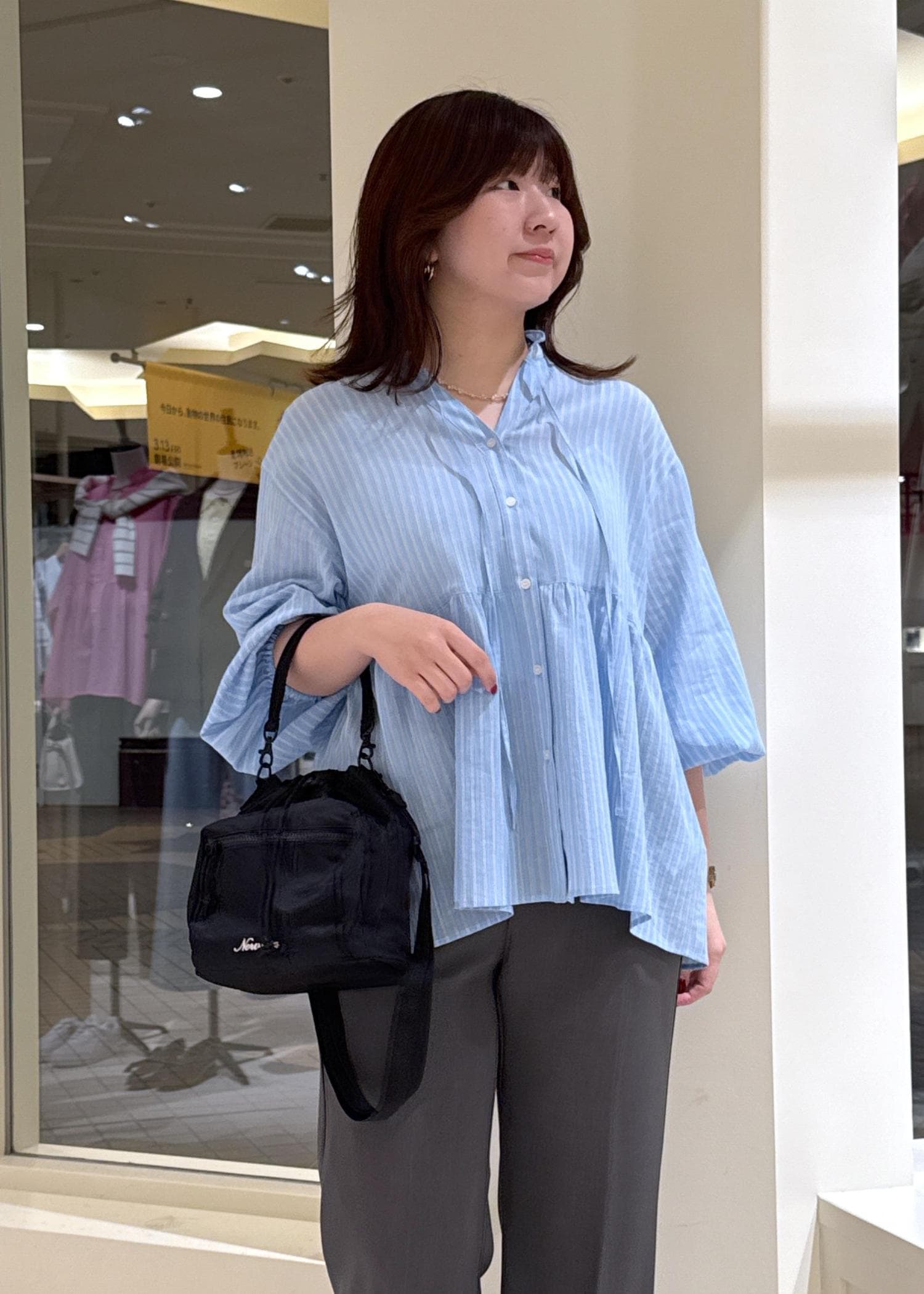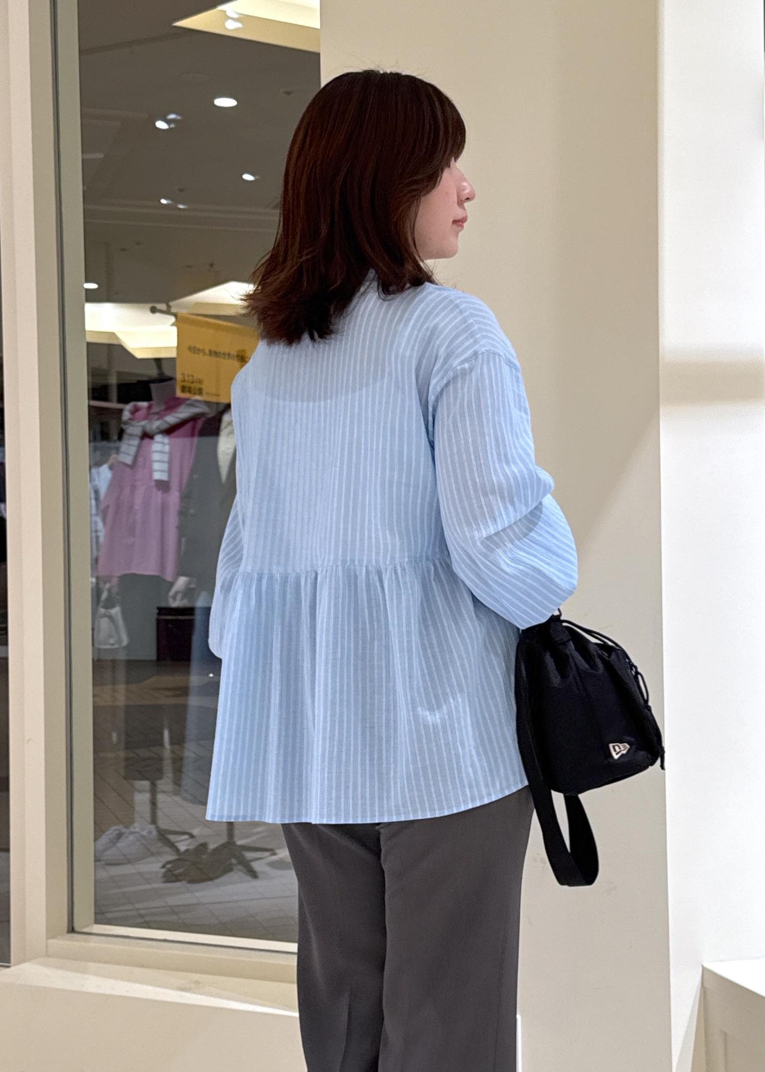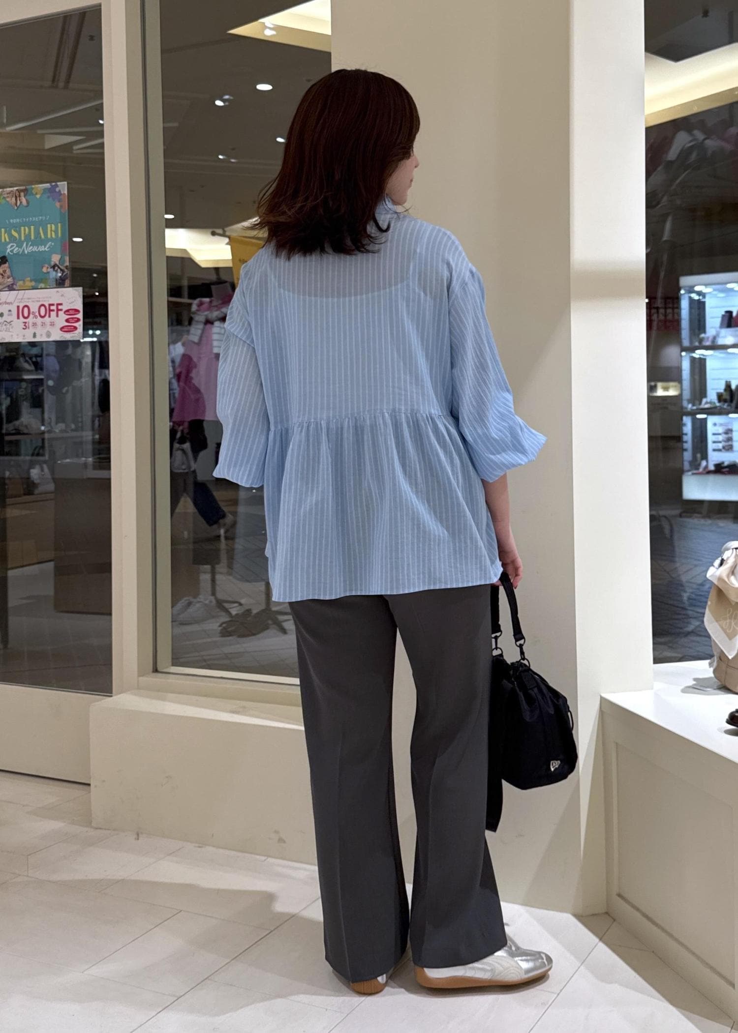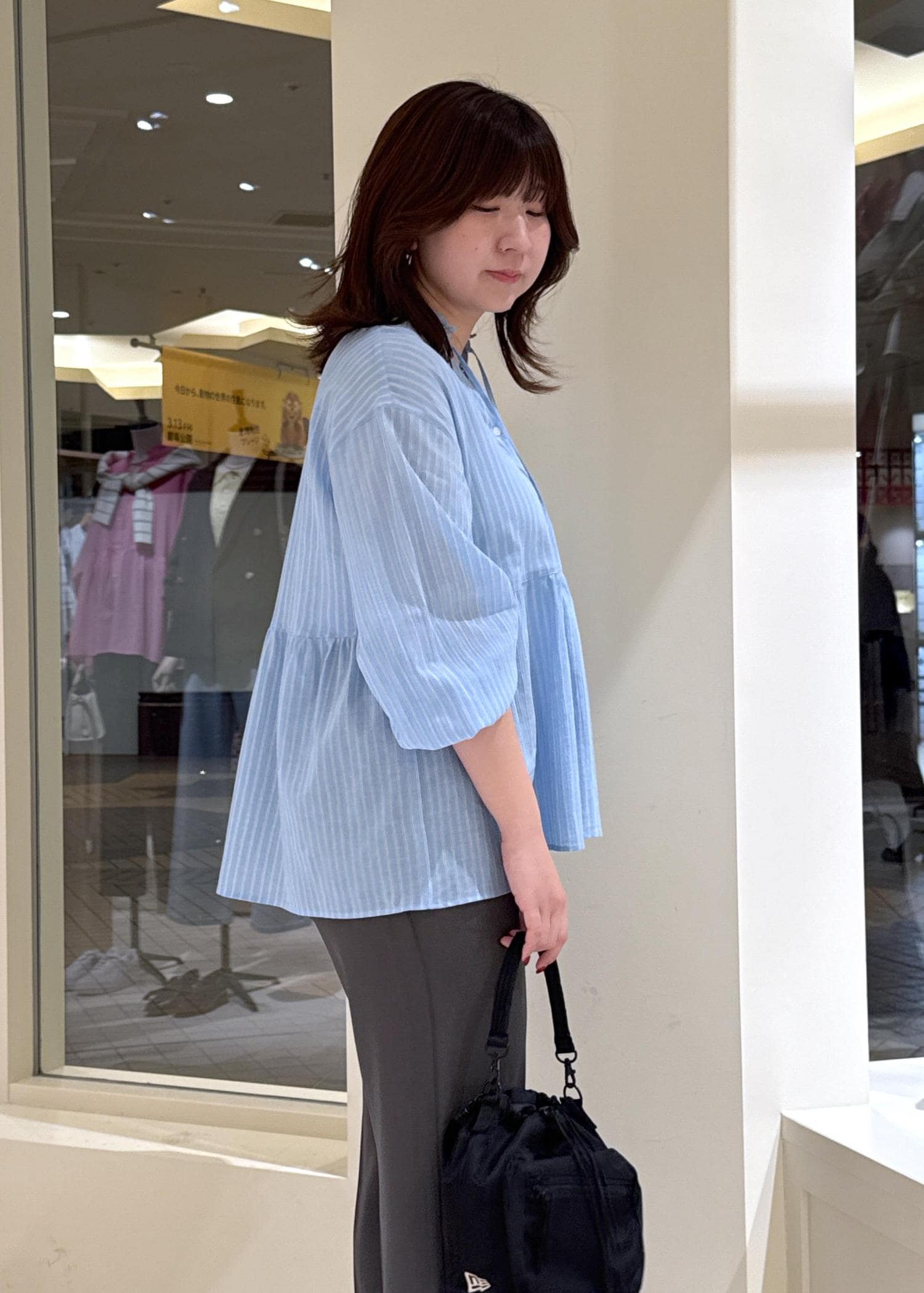 ROPÉ PICNICお着軽シャツシリーズ コットンボイルスタンドフリルシャツ/接触冷感・通気性ブルー系 / F¥4,994レビューたっぷりとしたデザインですが、顔周りのVネック、ウエスト切り替えでスッキリとした印象に。