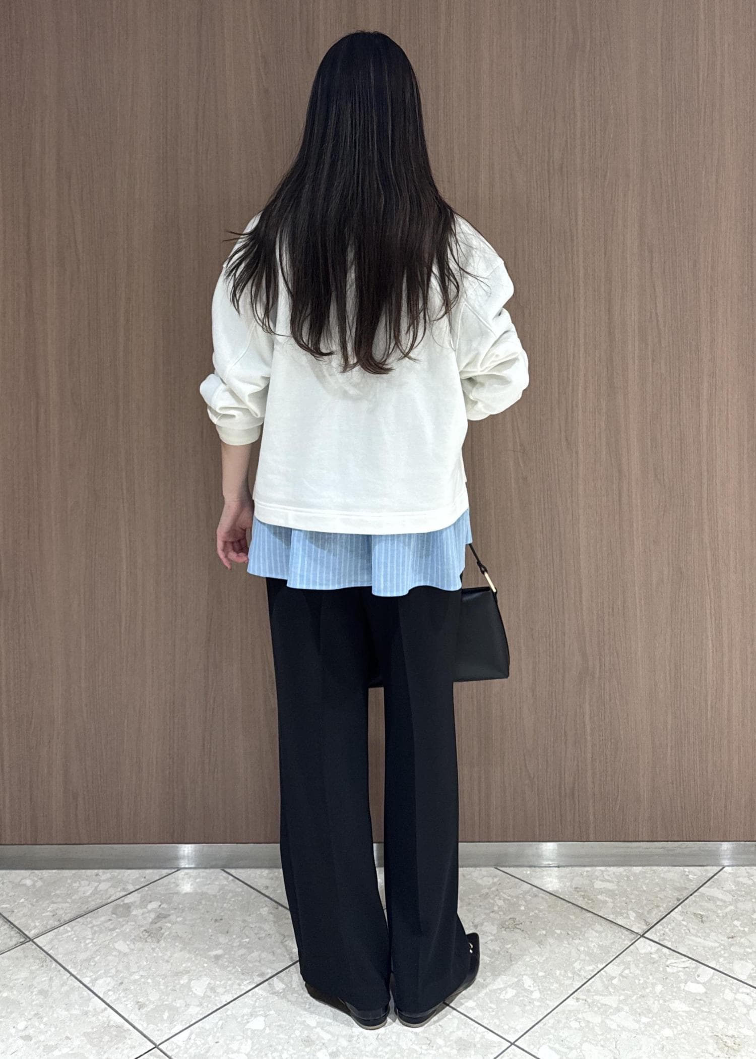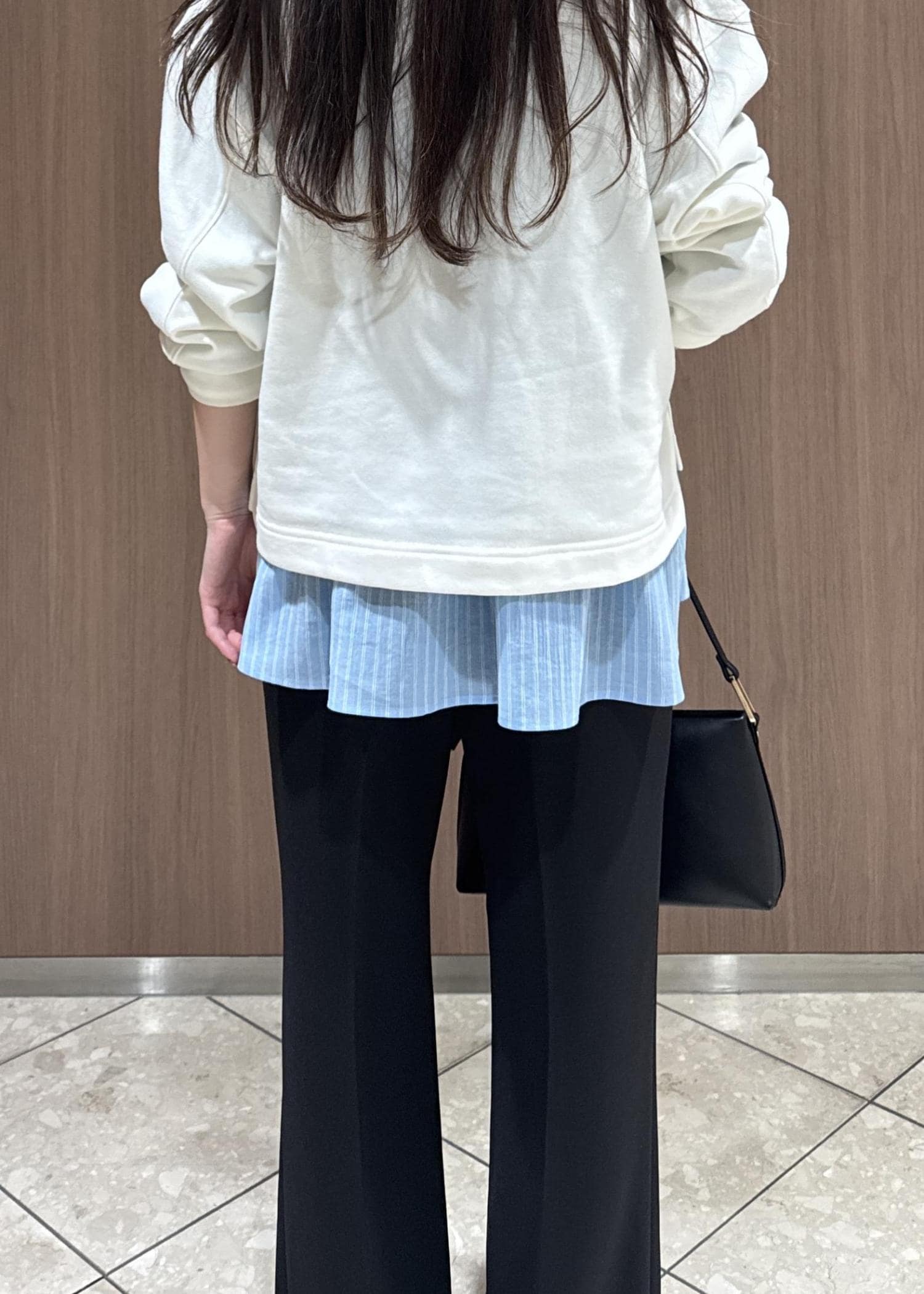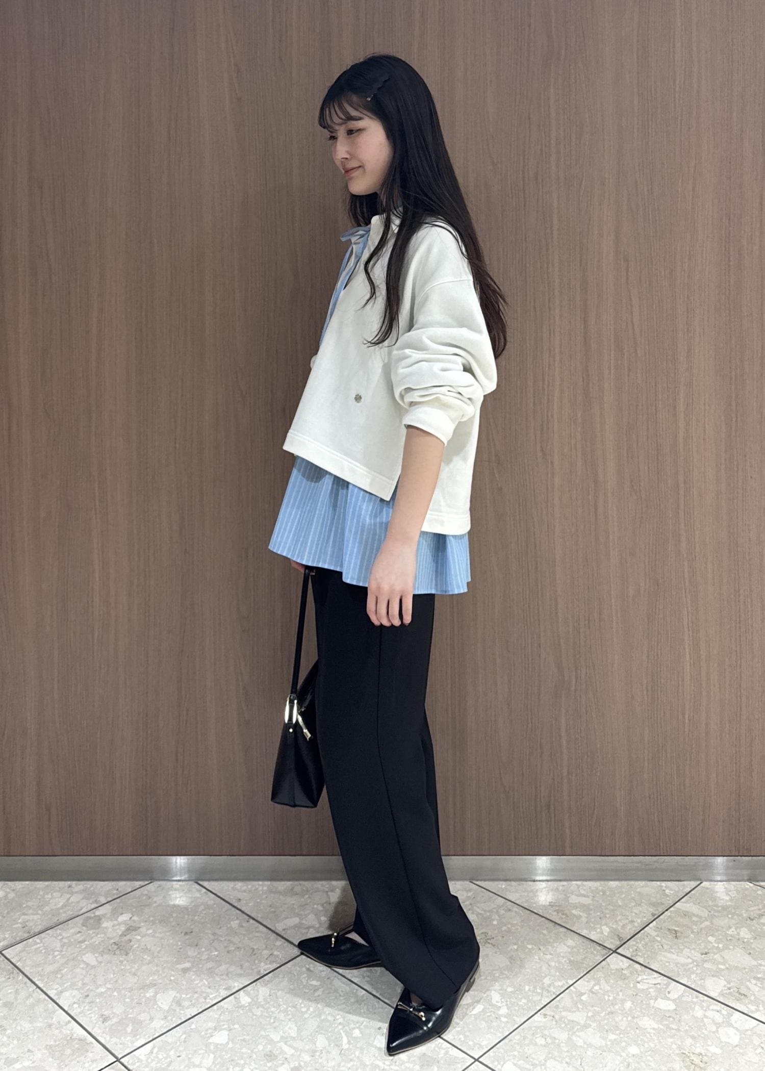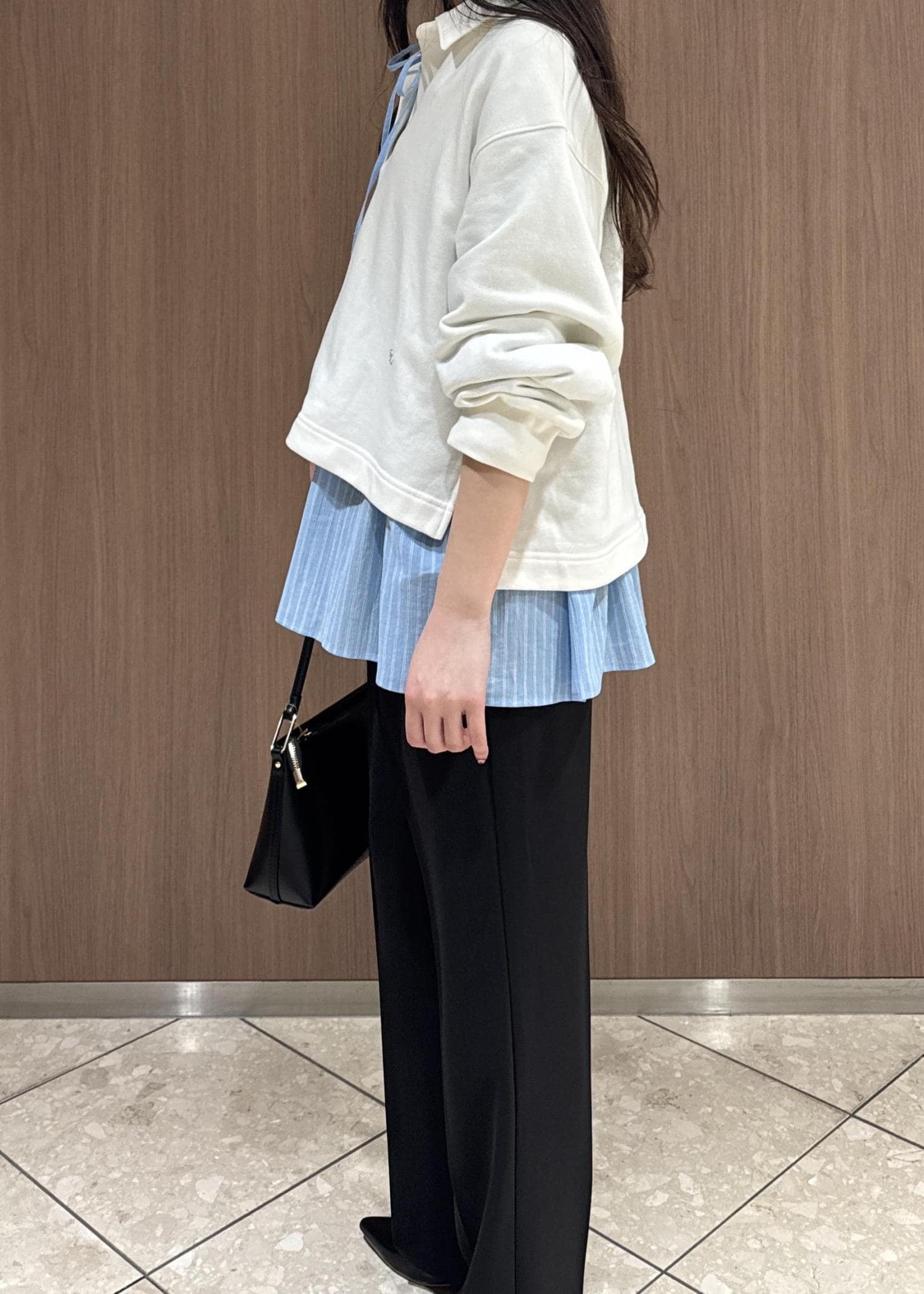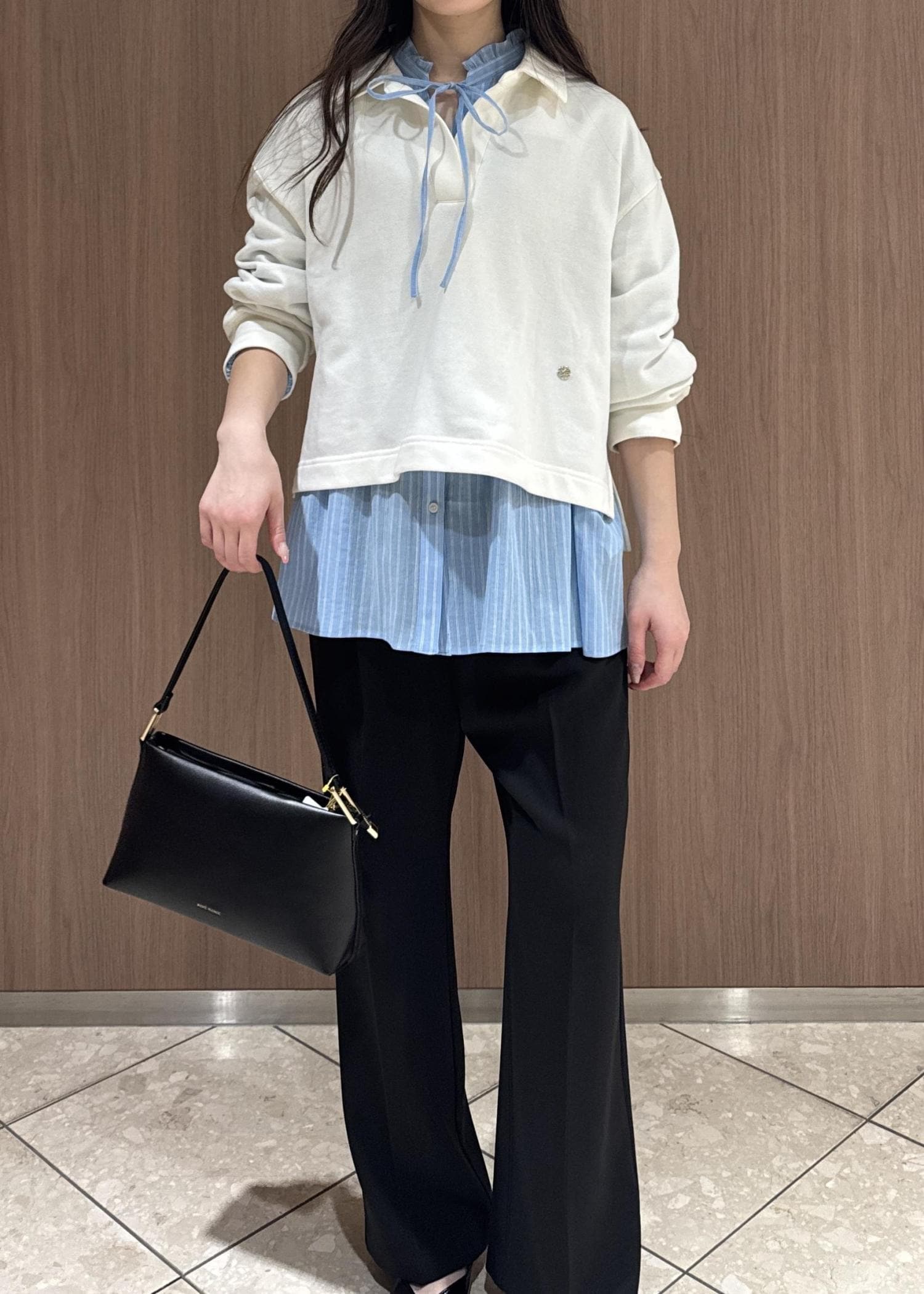 スキッパースウェットでカジュアルにしつつ、インナーにシャツを着てパンツは幅が広すぎない黒のフレアで綺麗目に。