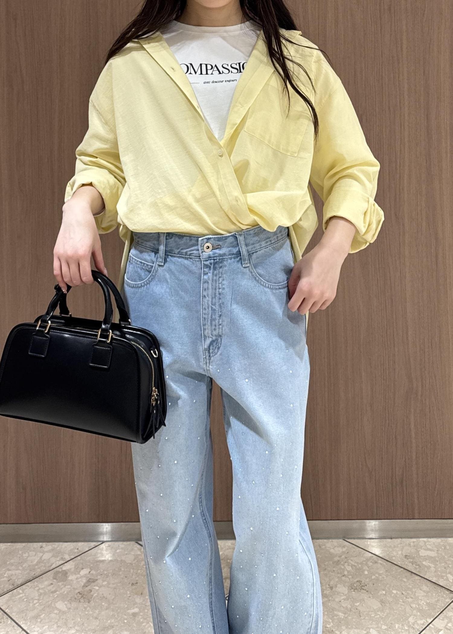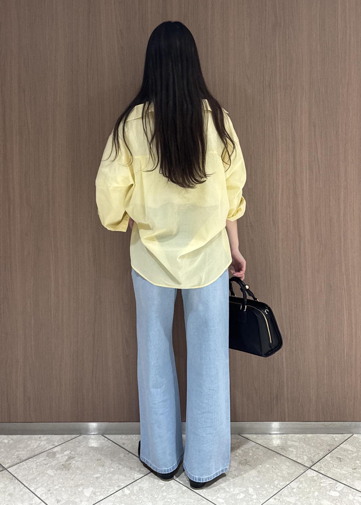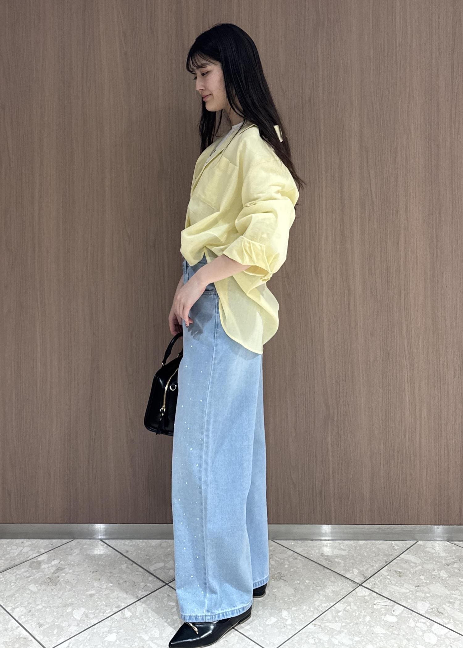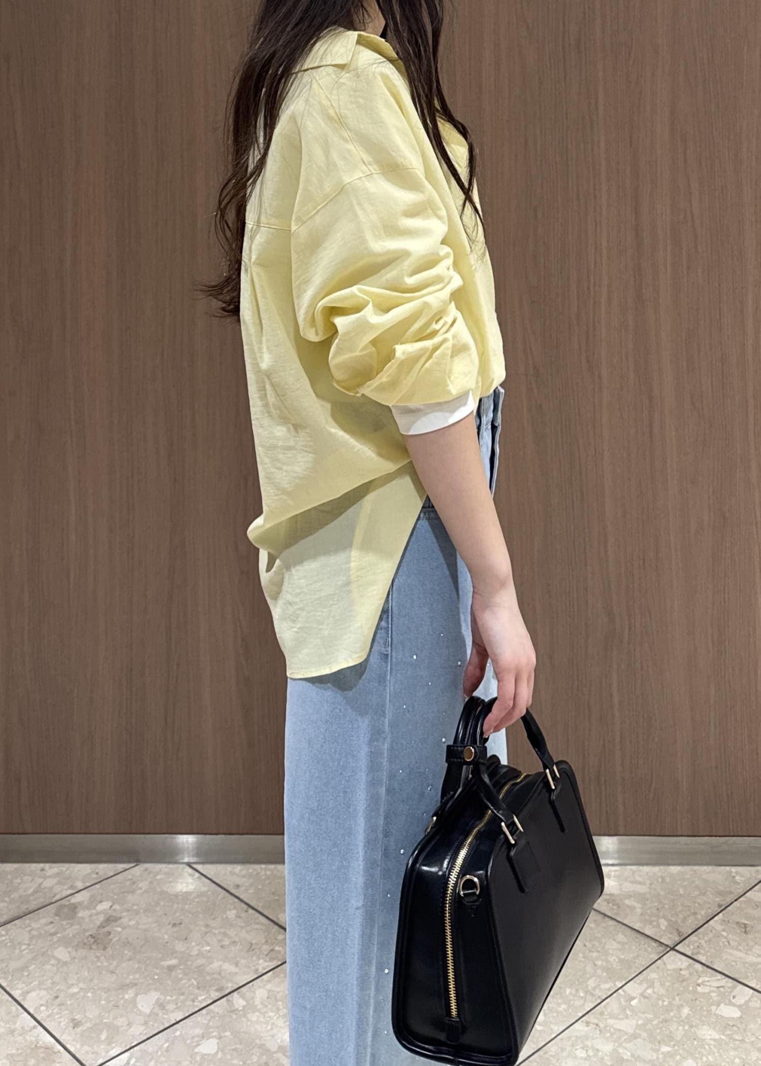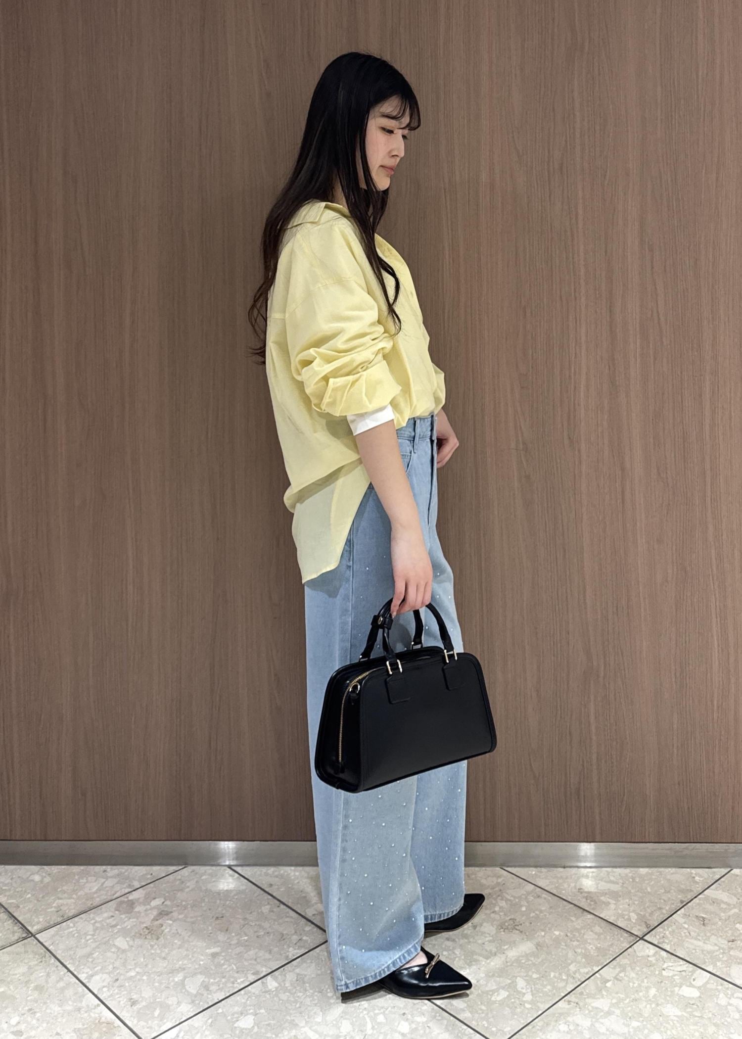 黄色の綿シャツとブルーデニムで春っぽさ全開のスタイリングにしてみました。