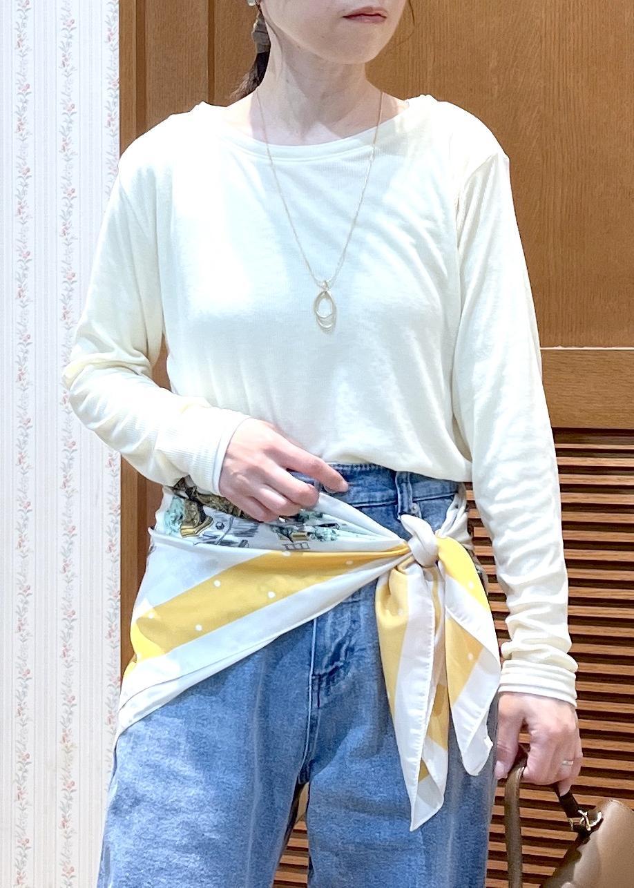 シンプルなスタイリングなのでストールをワンポイントにしました。