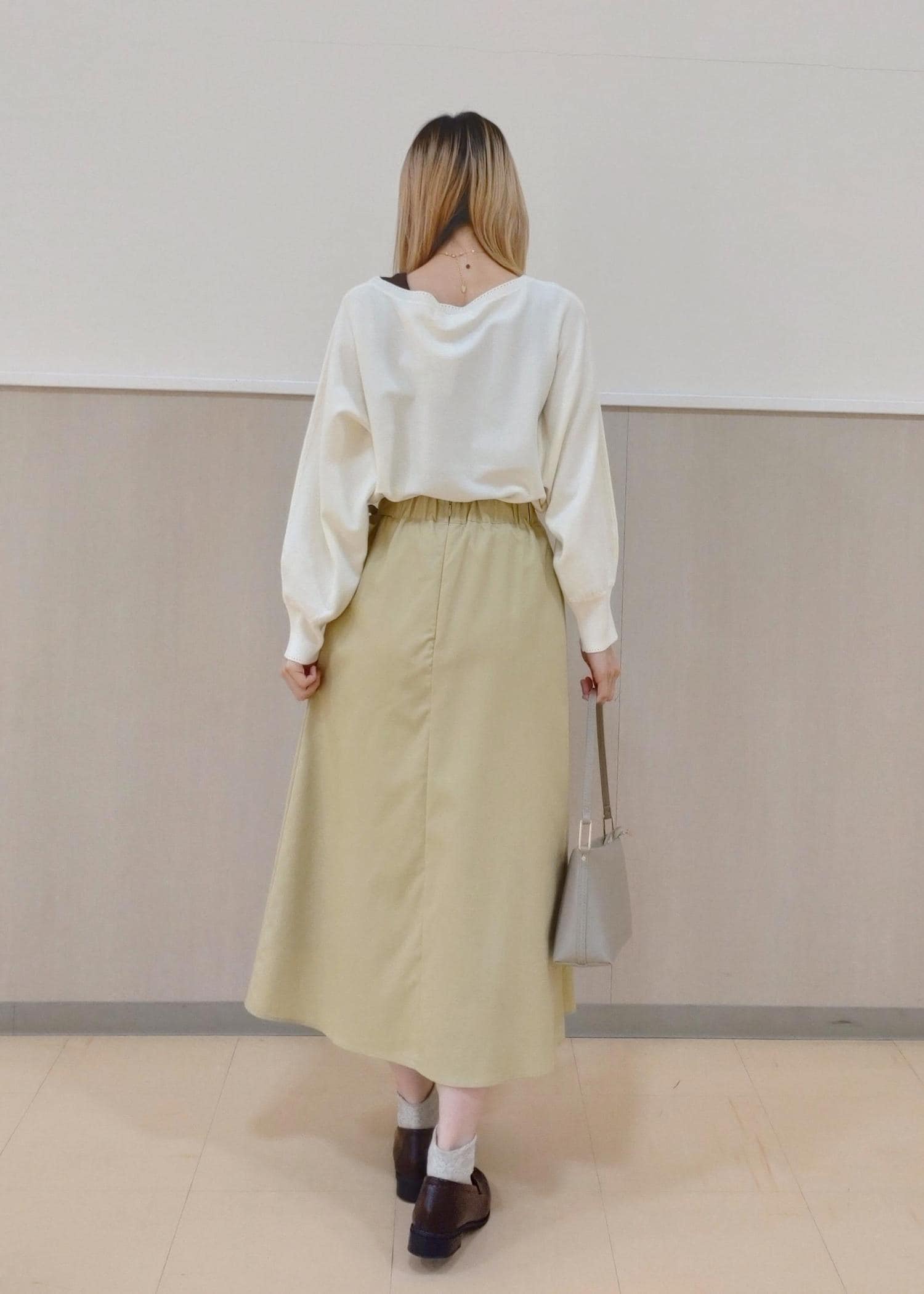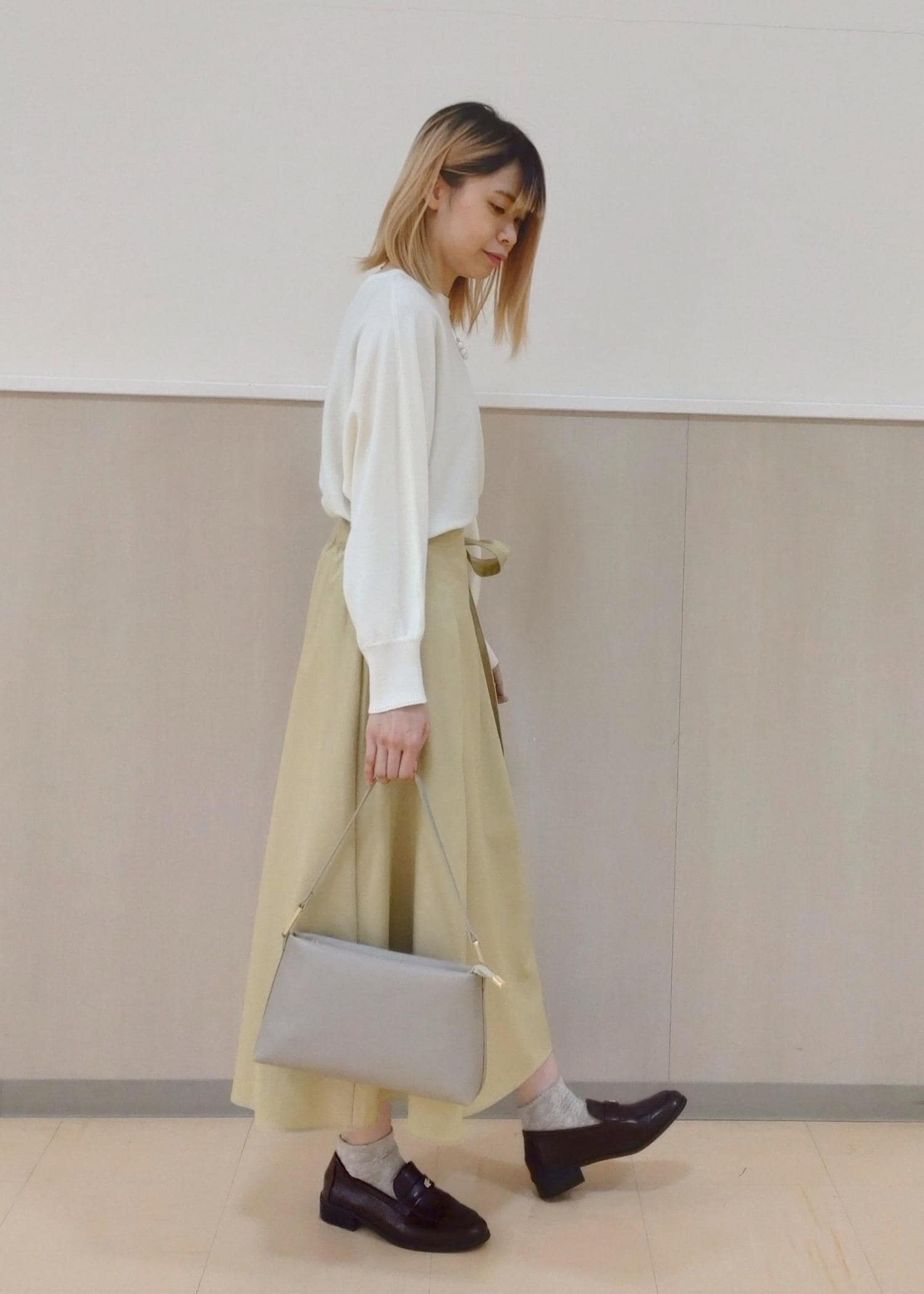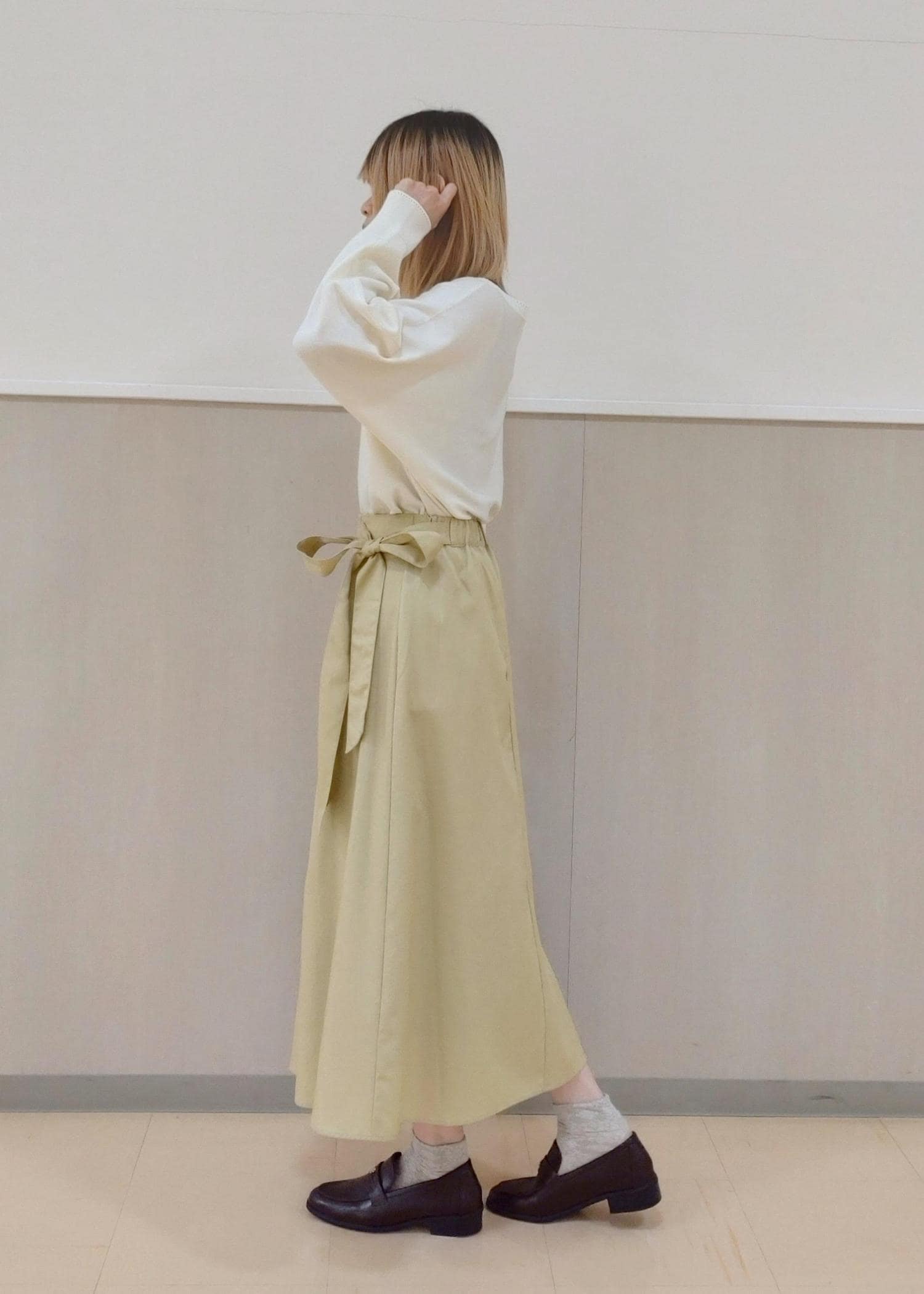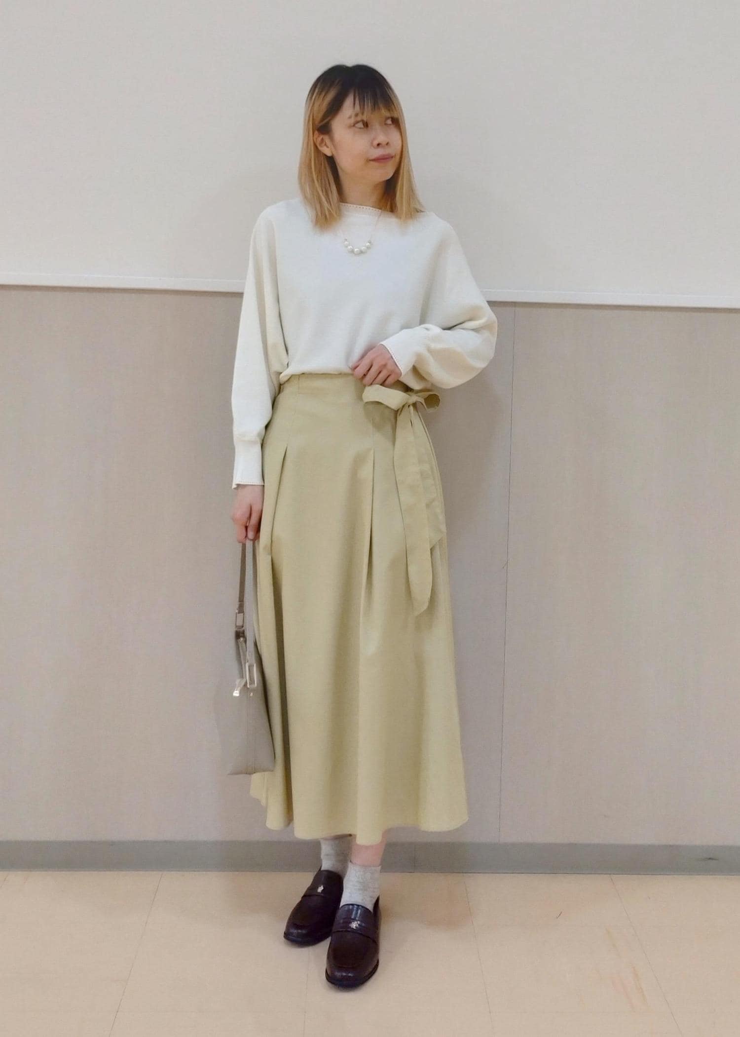 骨格ウェーブさんがお得意のフレアスカートを主役にやわらかいいろで合わせた春カラーコーディネートです