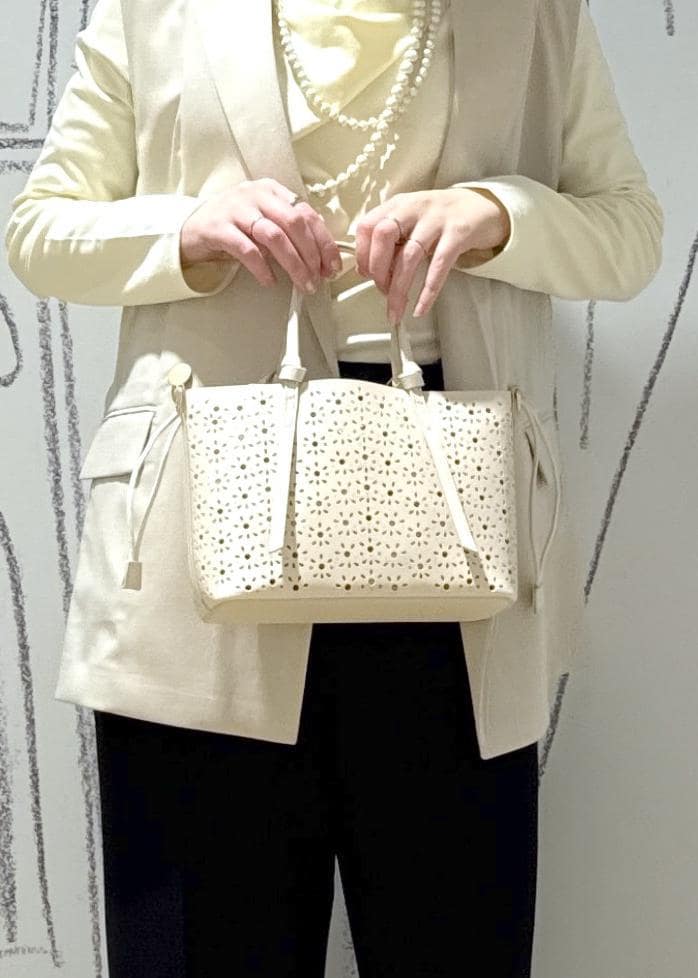 ROPÉ PICNIC PASSAGEフルーレットパンチングレースミニショルダーバッグ/2WAYオフホワイト / F¥6,490レビュー巾着付きなので中身が丸見えにならないので安心。花模様のパンチングが女性らしさを引き立たせます。必要最低限の荷物が入るサイズ感です。