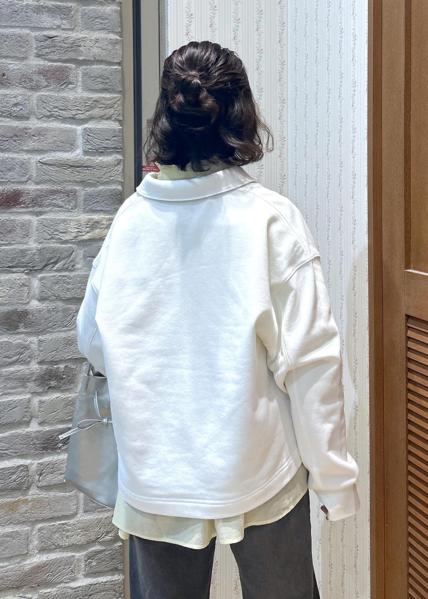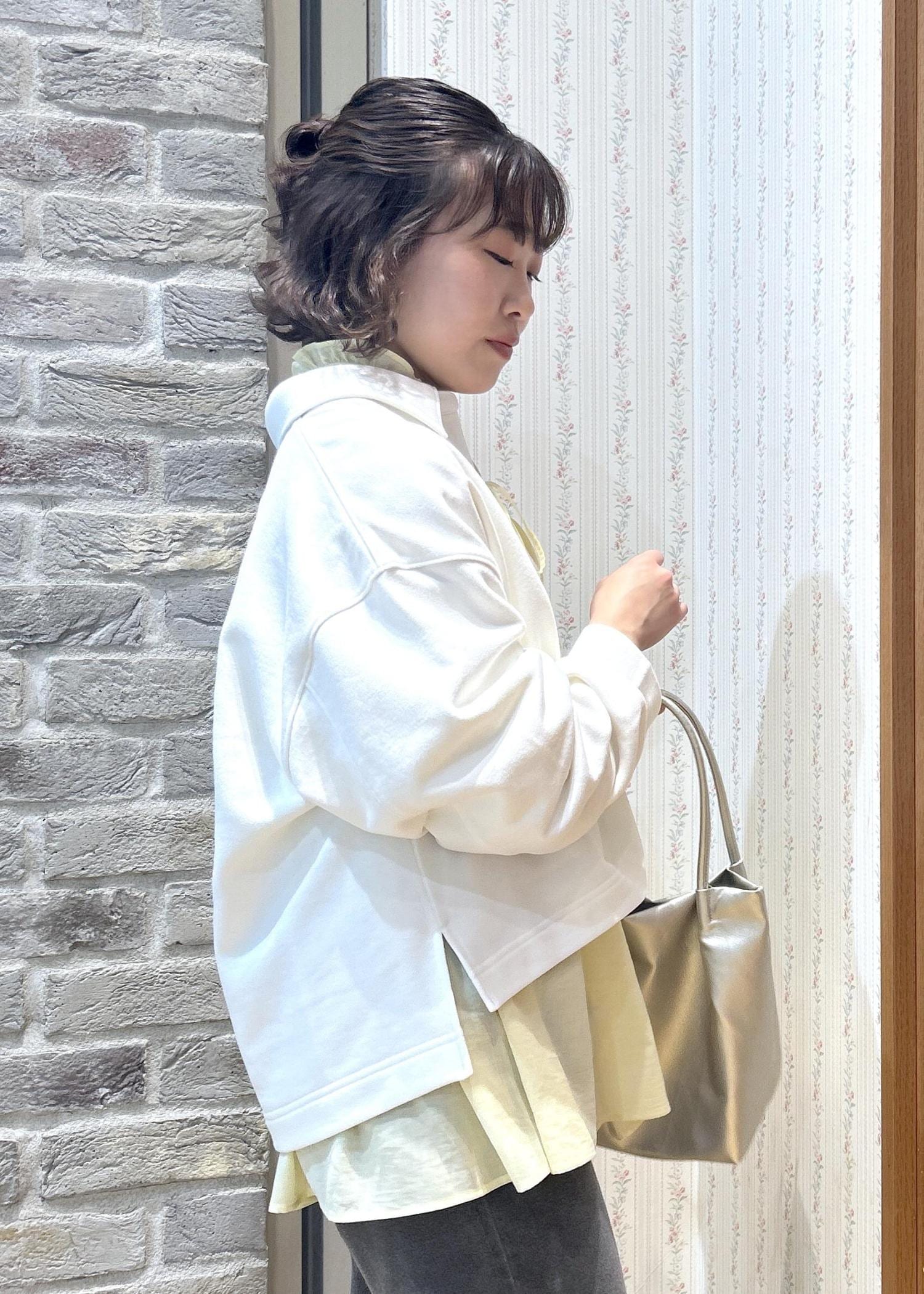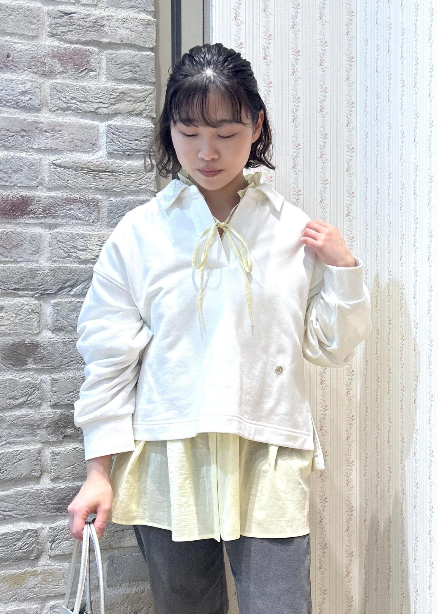 お気軽シャツのスタンドフリルシャツに、スウェットを重ね着してみました!シャツはカラーバリエーションが豊富なので、お気に入りカラーを探してみてくださいね!