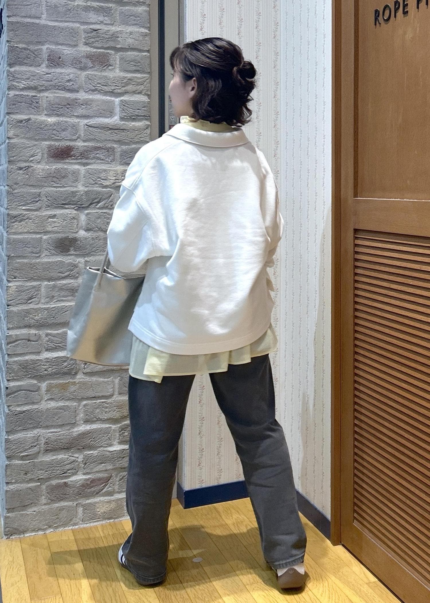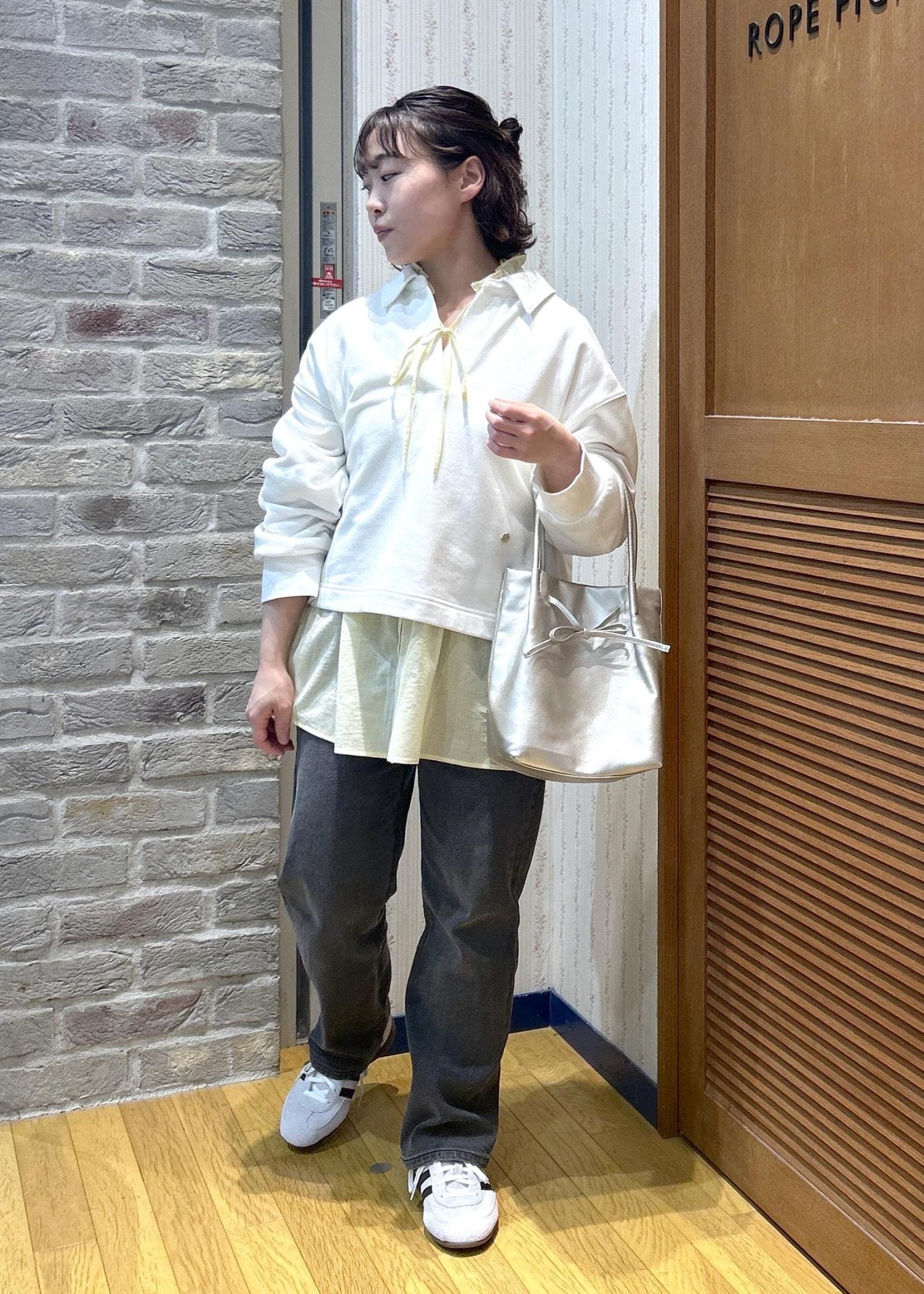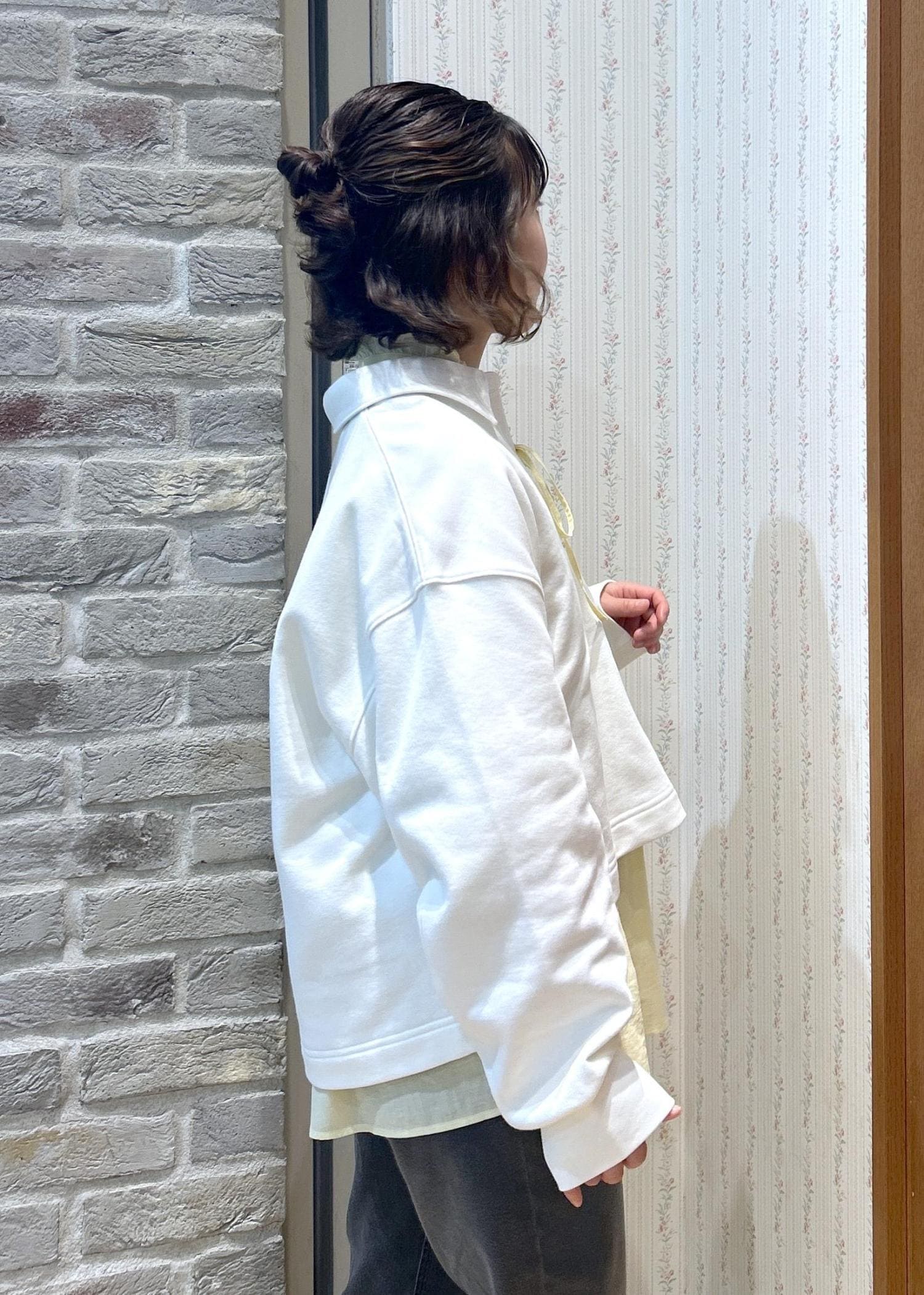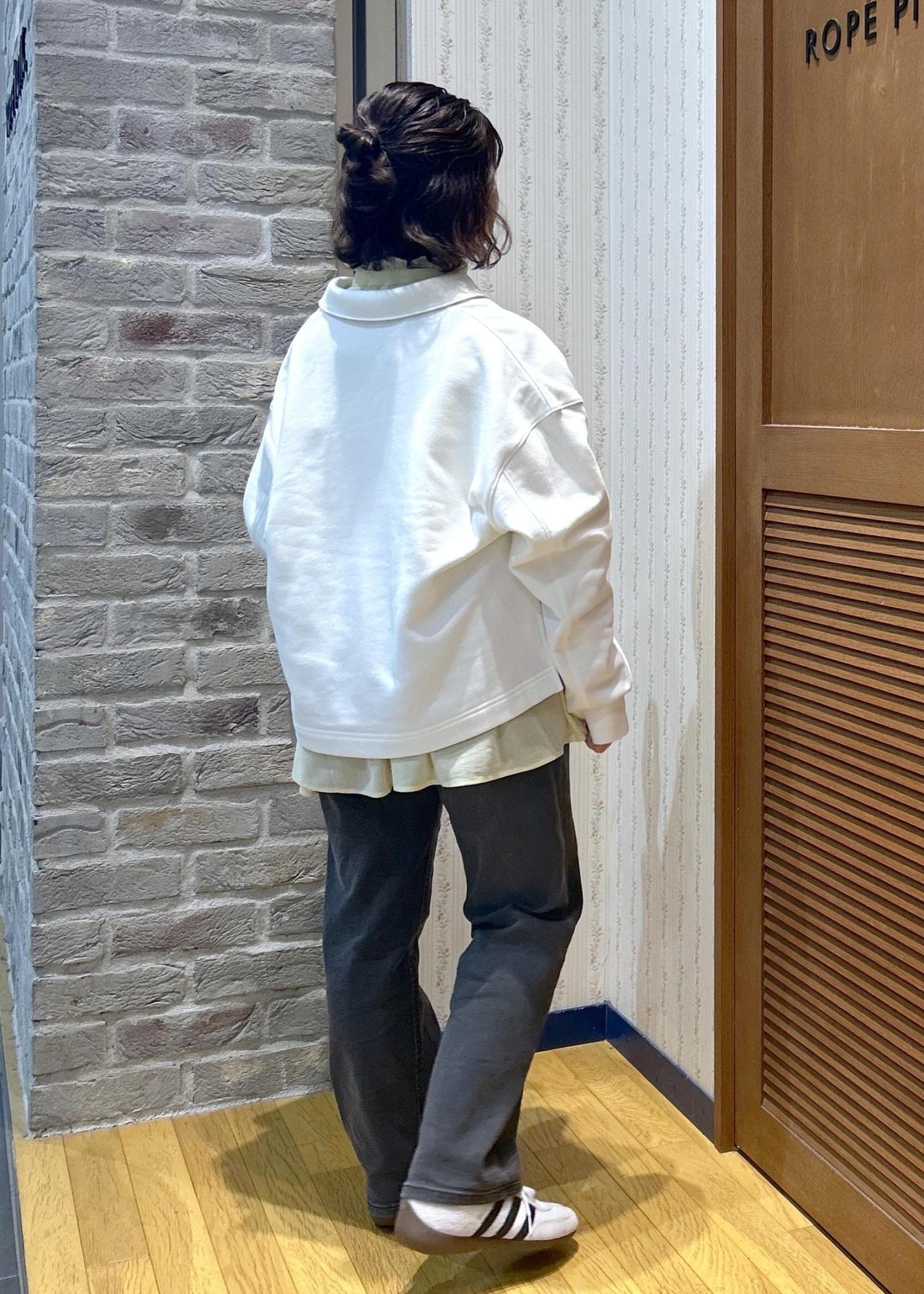 お気軽シャツのスタンドフリルシャツに、スウェットを重ね着してみました!シャツはカラーバリエーションが豊富なので、お気に入りカラーを探してみてくださいね!