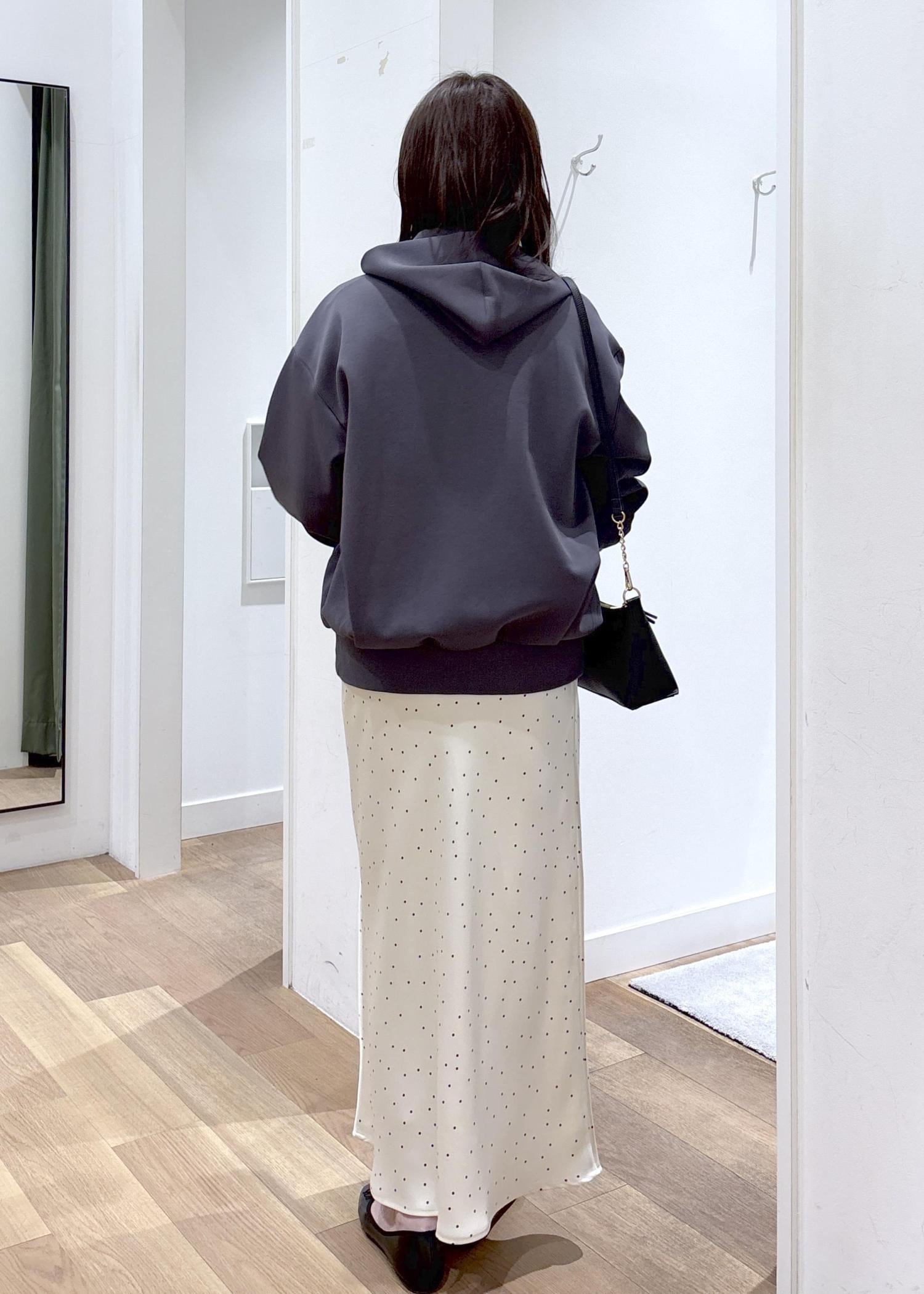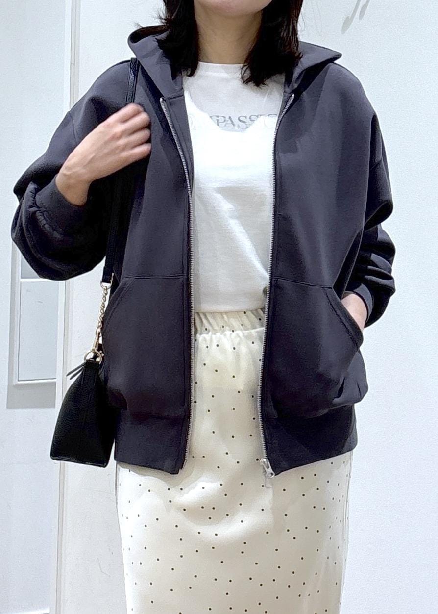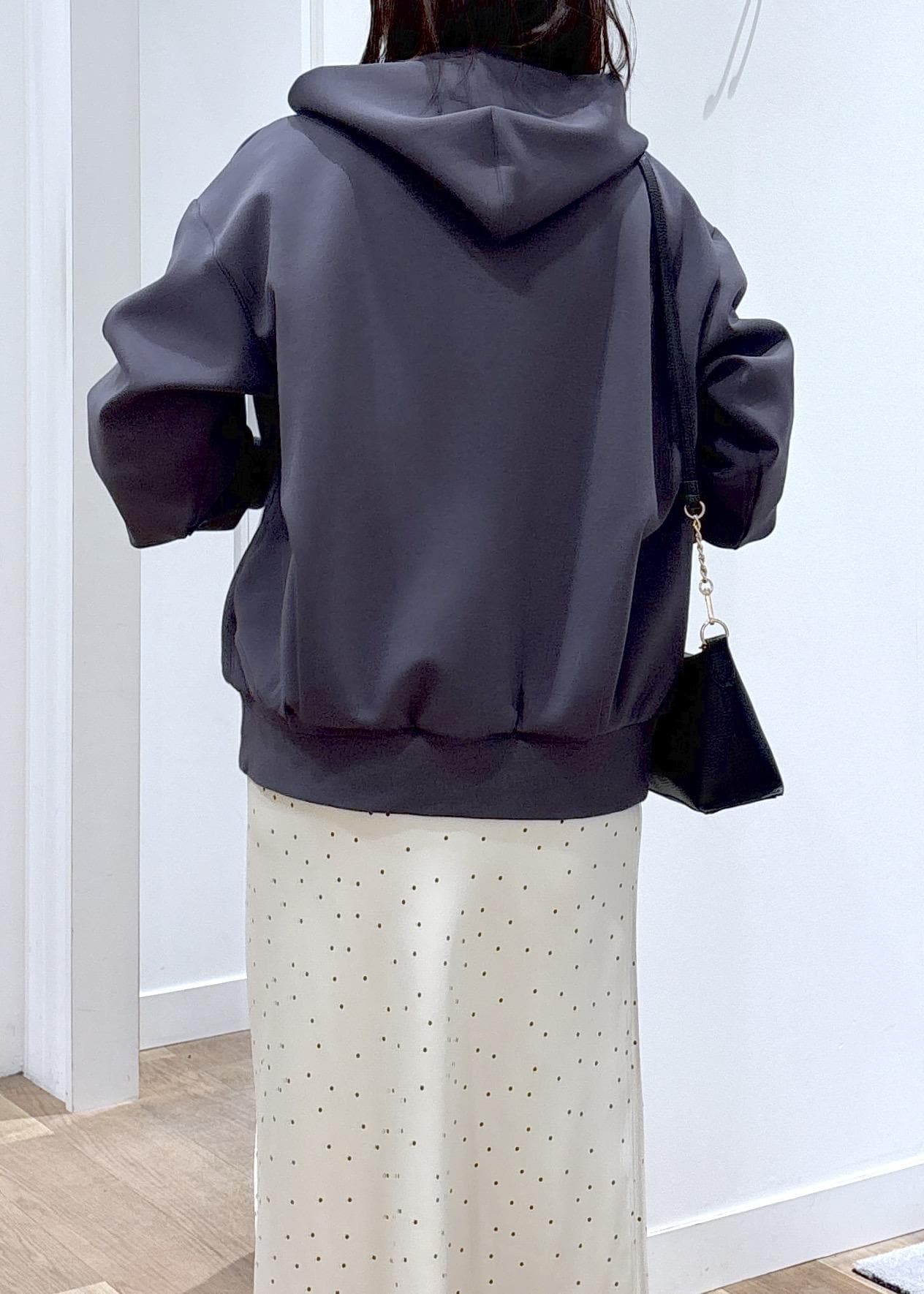ROPÉ PICNICコクーンシルエットダブルジップフーディチャコール / F¥6,490レビュー程よくゆとりとハリのあるダンボール素材なので、アウター代わりにも使いやすいデザインです。裾にタックが入っているので立体感があり、ふんわりしたシルエットがスポーティーになりすぎないです。