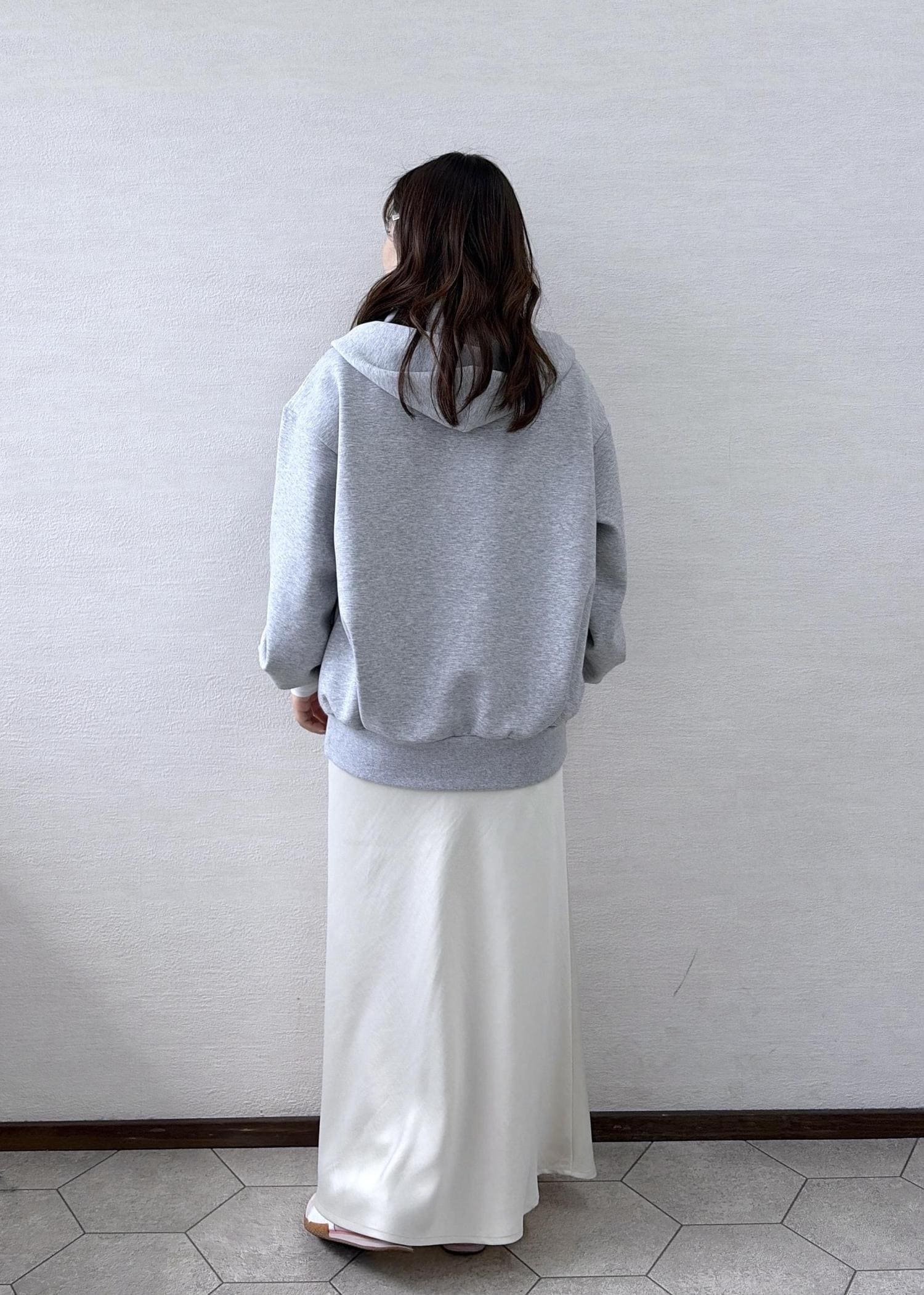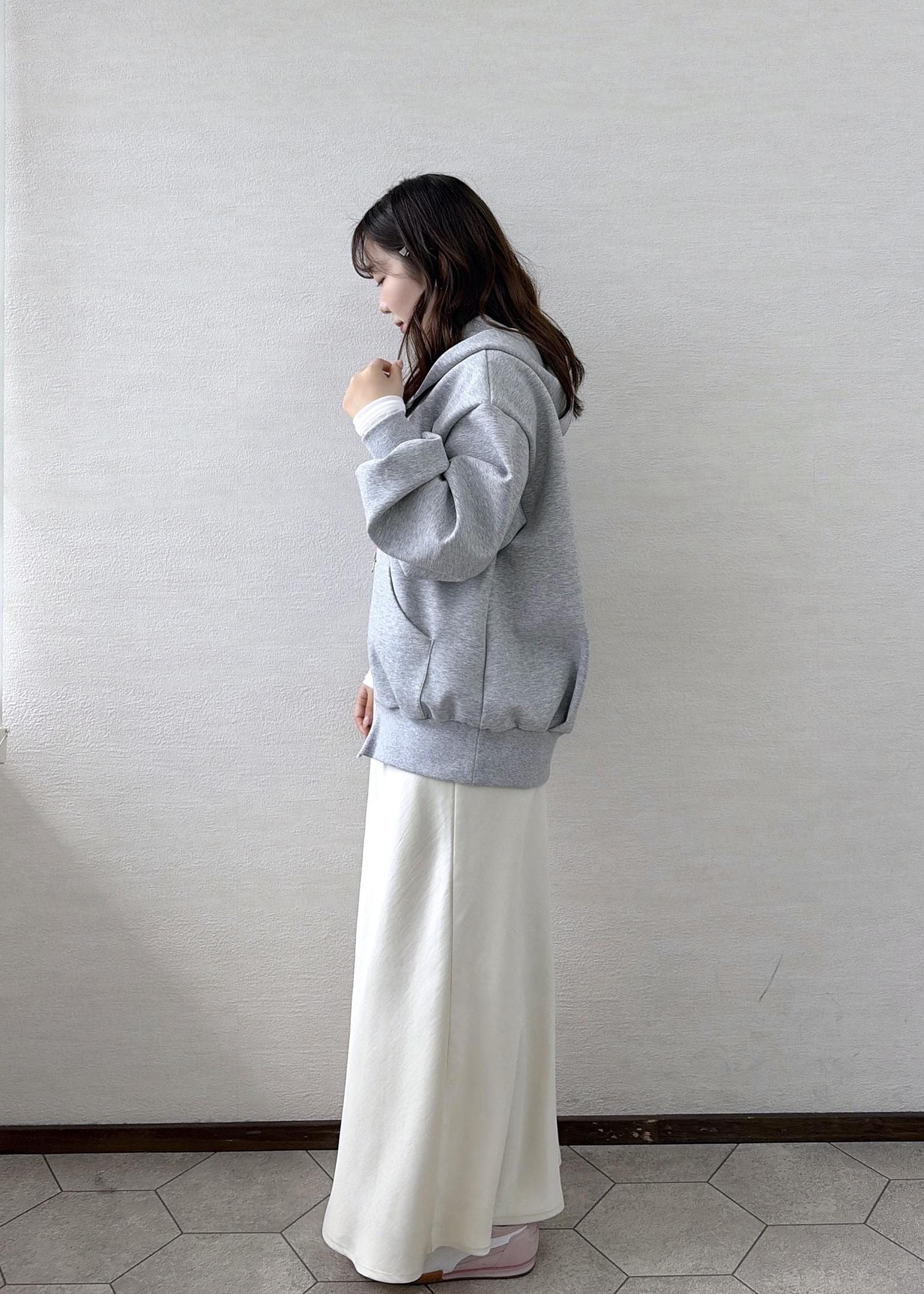 スウェットライクな生地のダブルジップフーディーに上品なサテンスカートを合わせました!