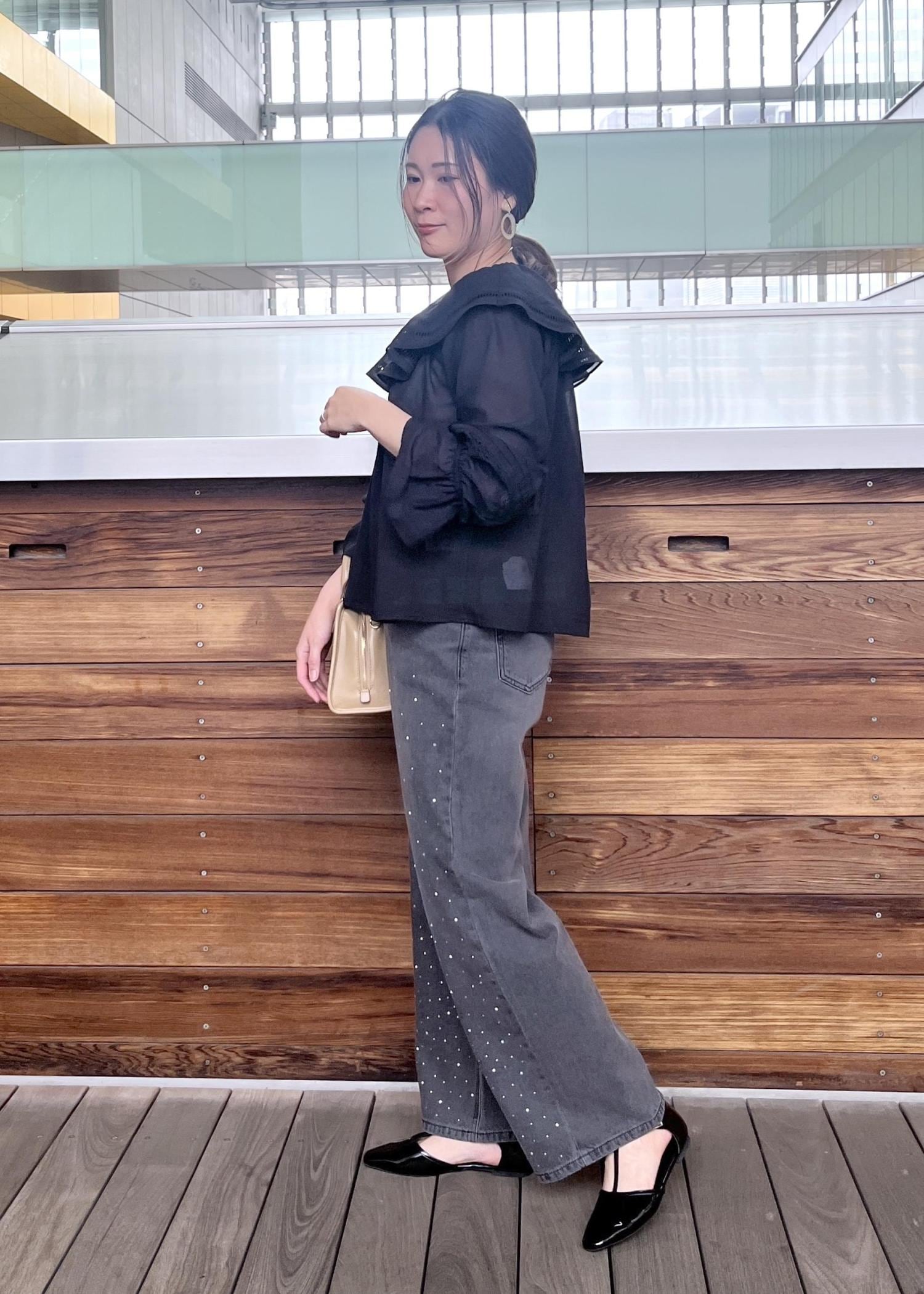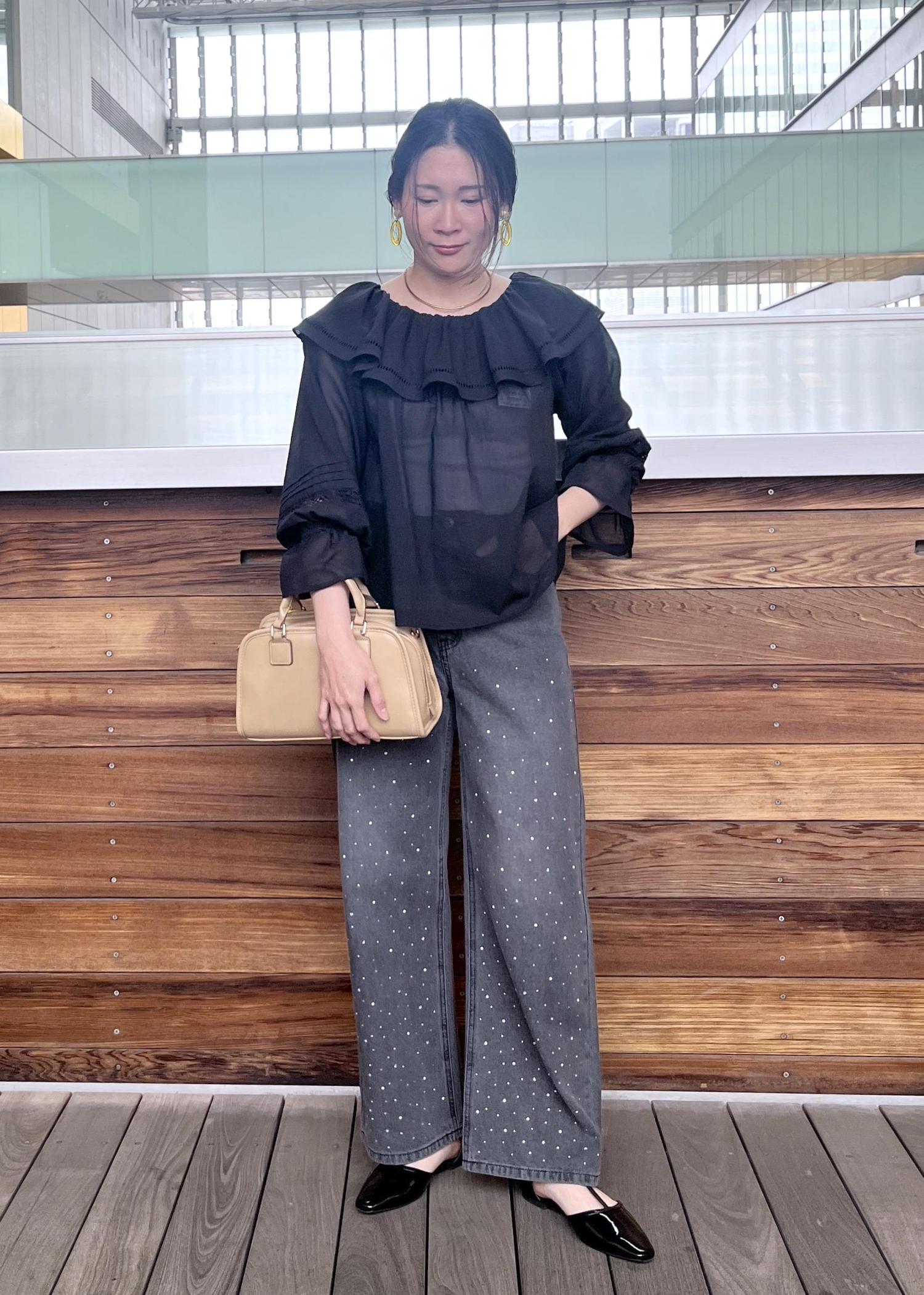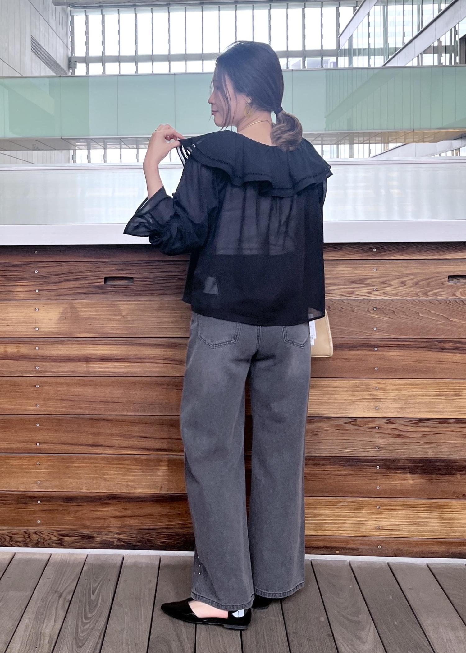 透け感のある素材と少しグレーがかったデニムで合わせ軽さのあるブラックコーデに。