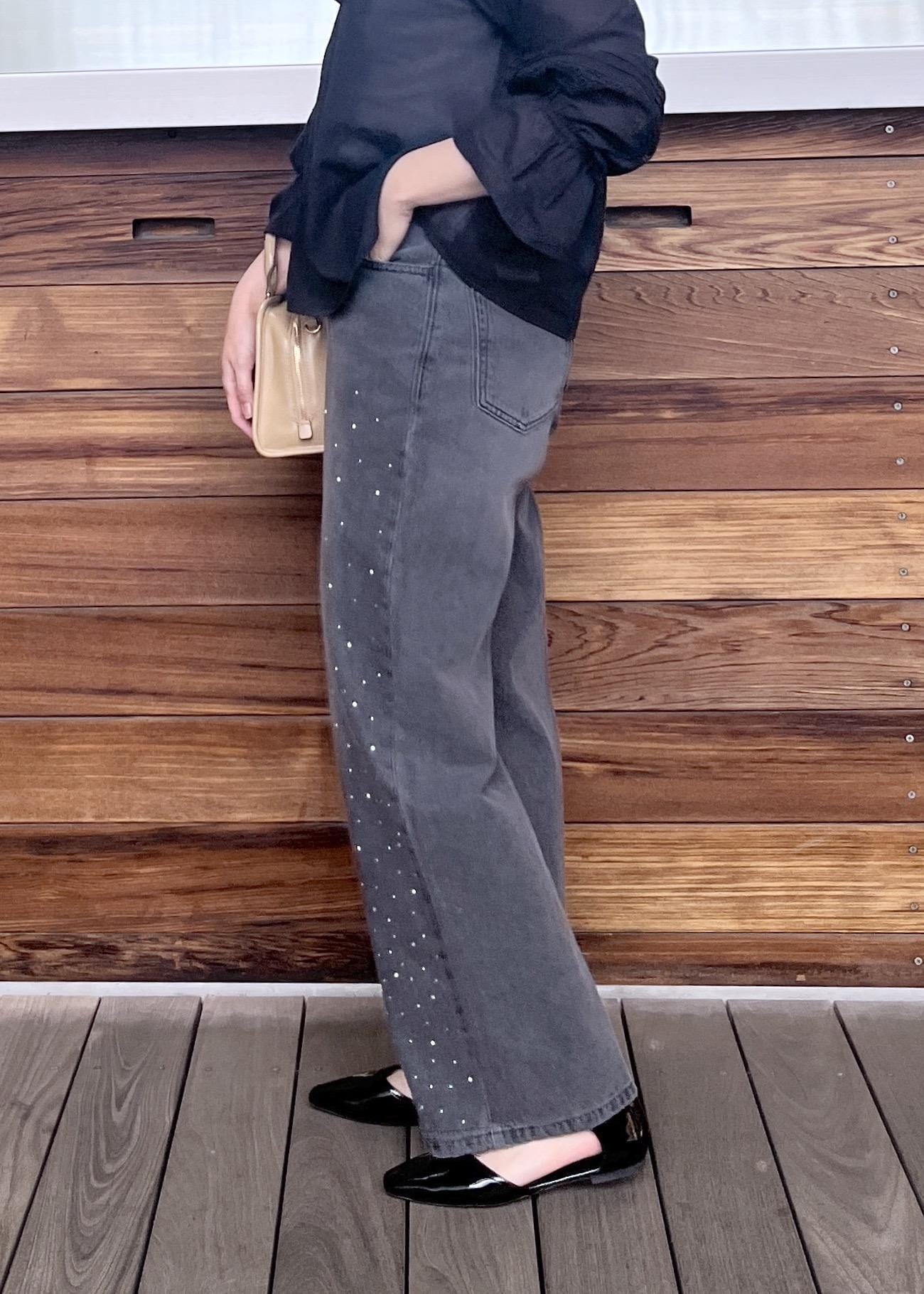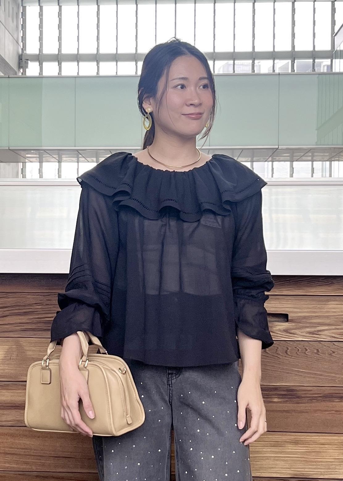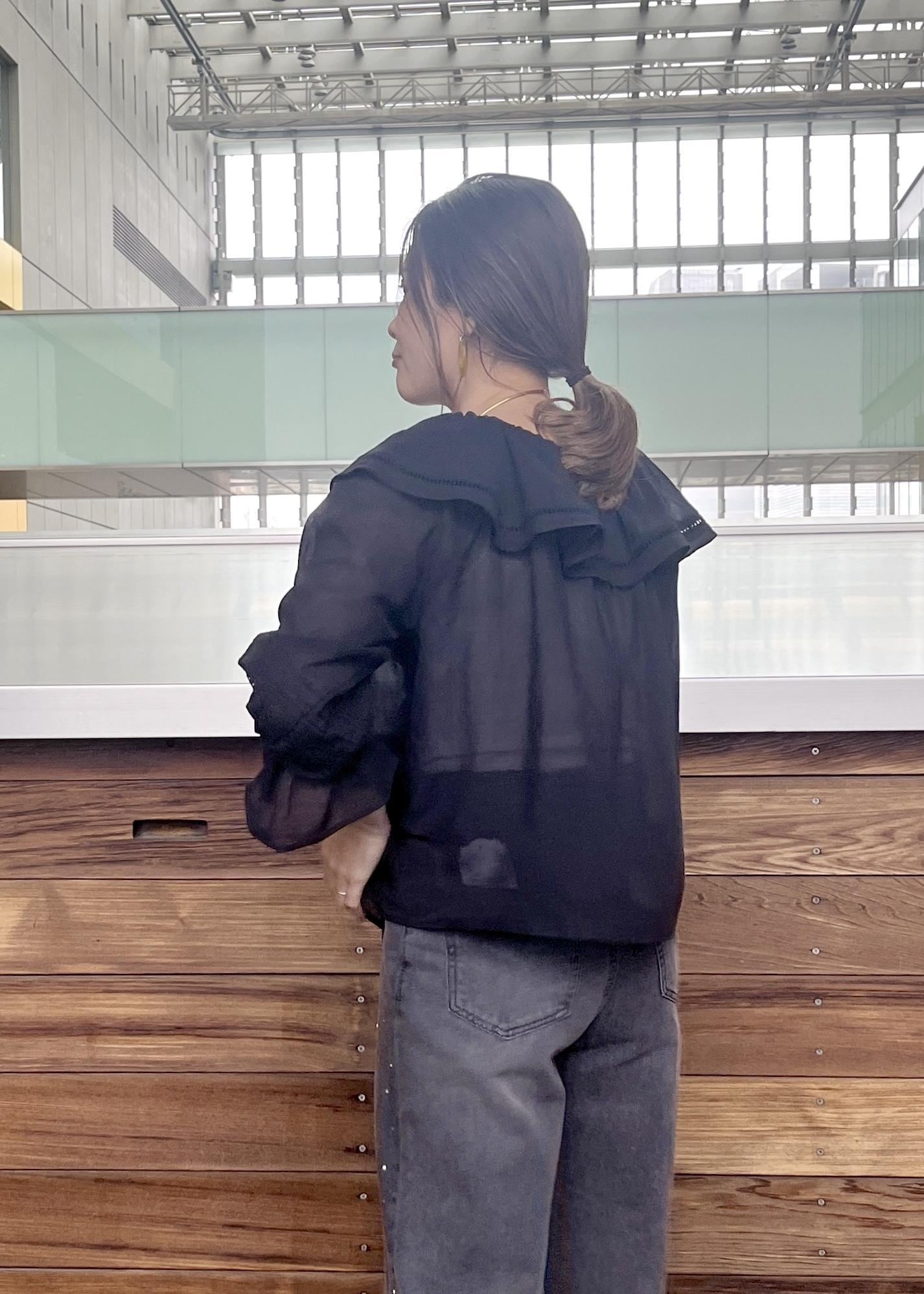 透け感のある素材と少しグレーがかったデニムで合わせ軽さのあるブラックコーデに。