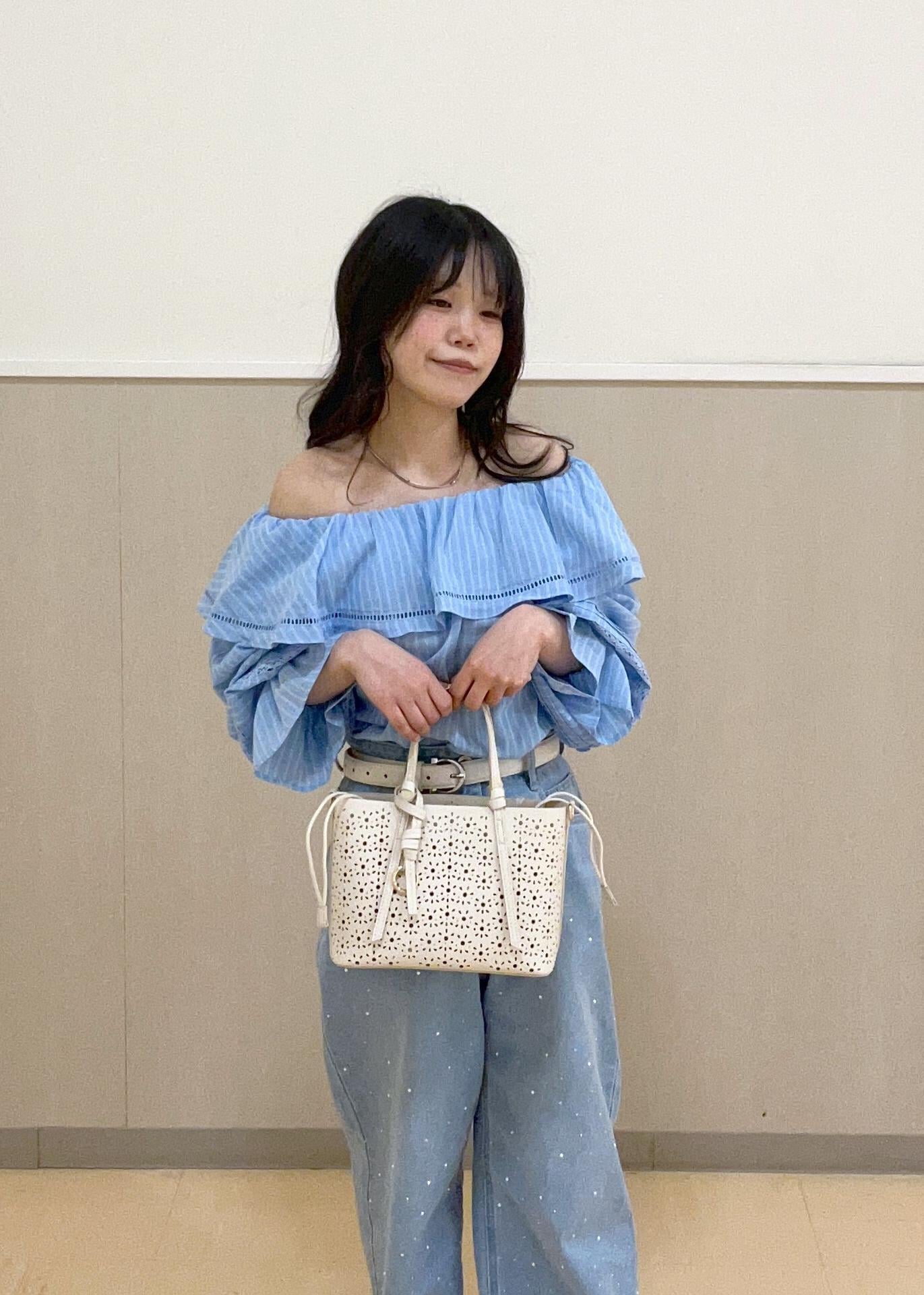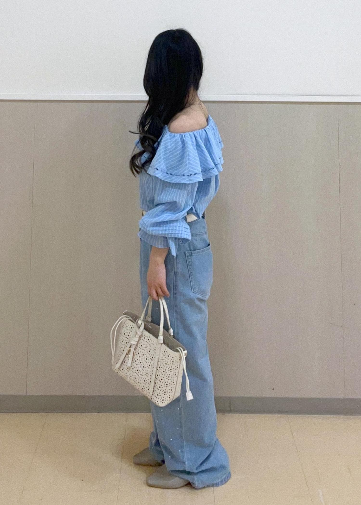 爽やかな色味のオフショルブラウスと存在感のあるビジューデニムを合わせたコーデです