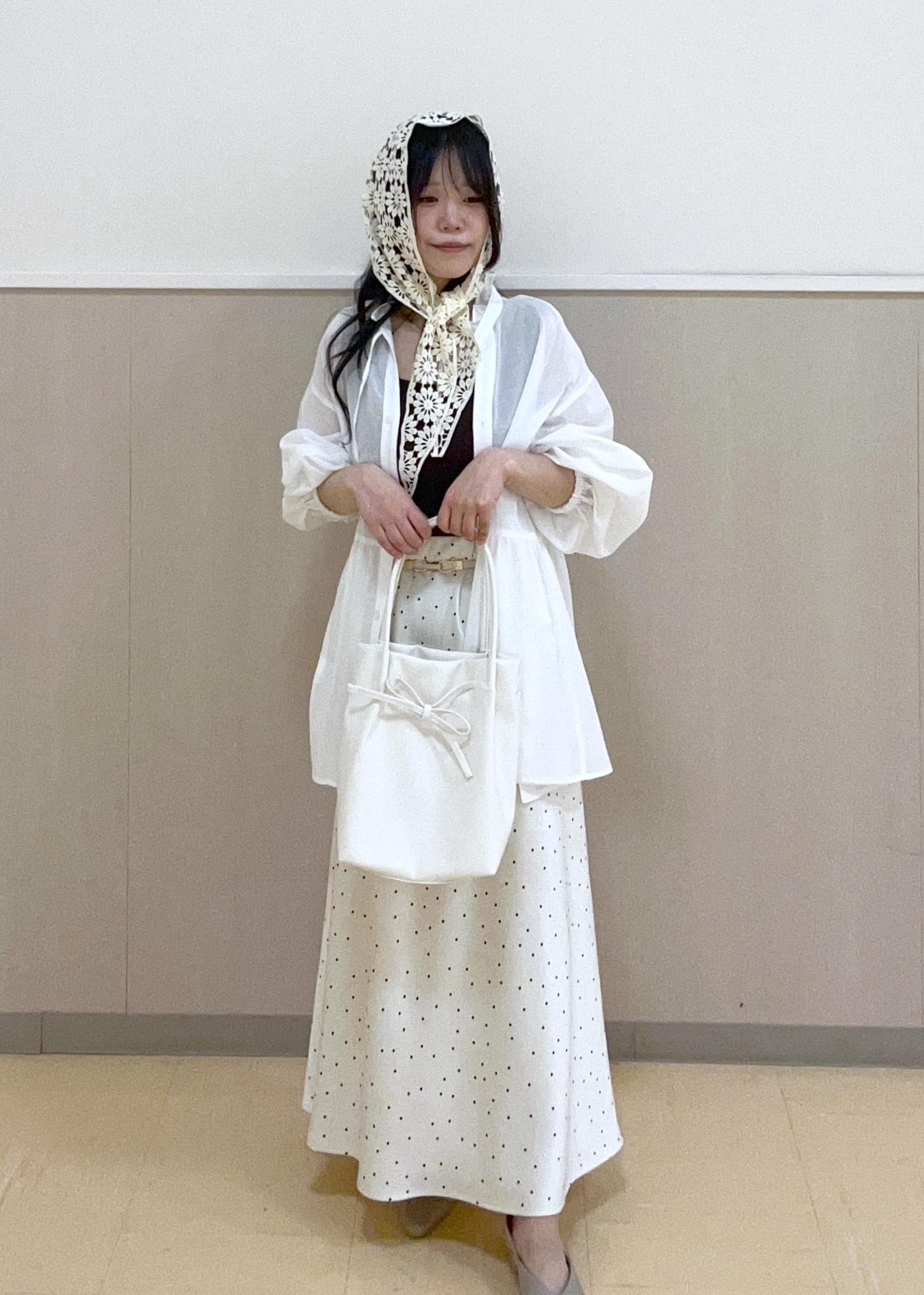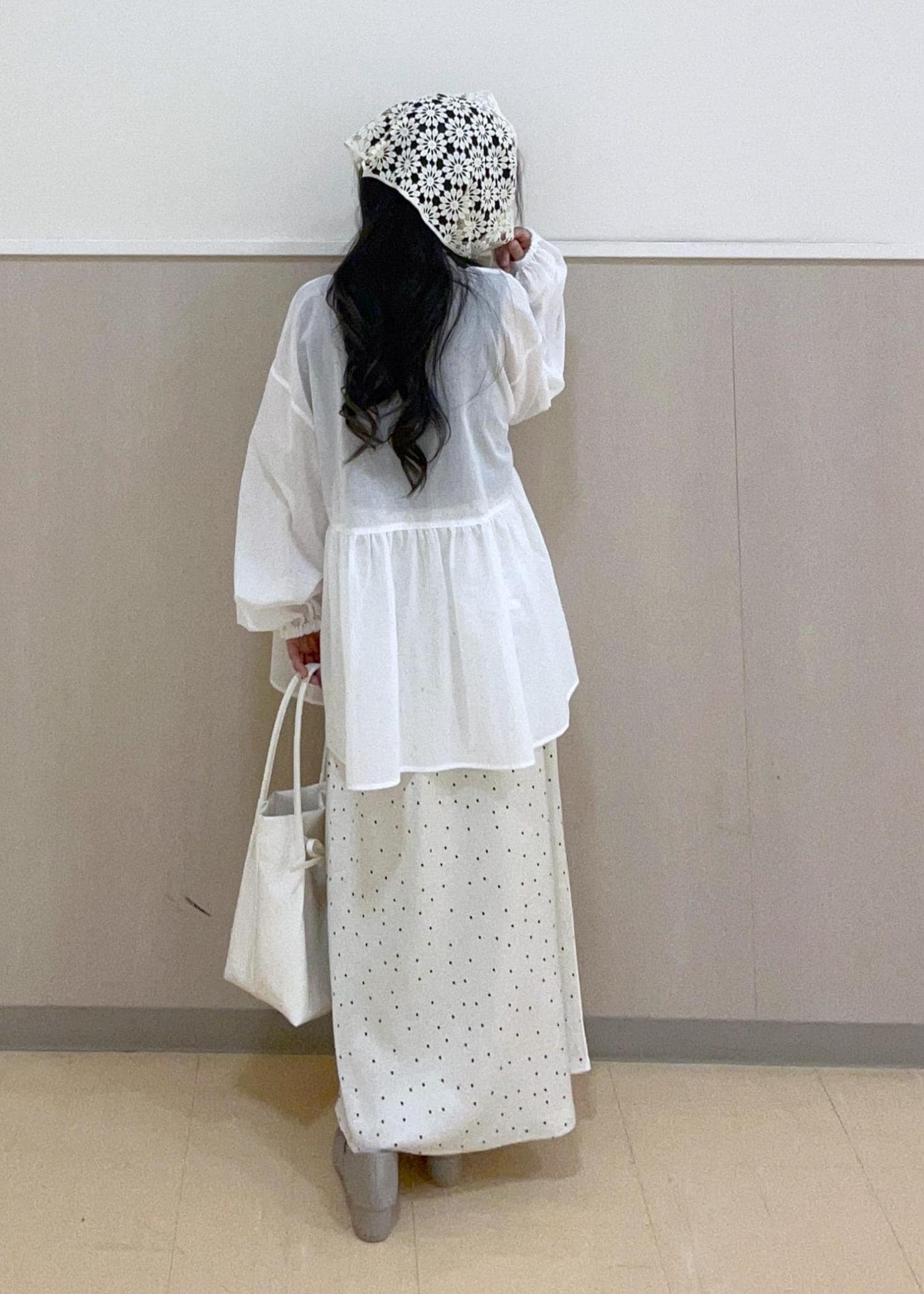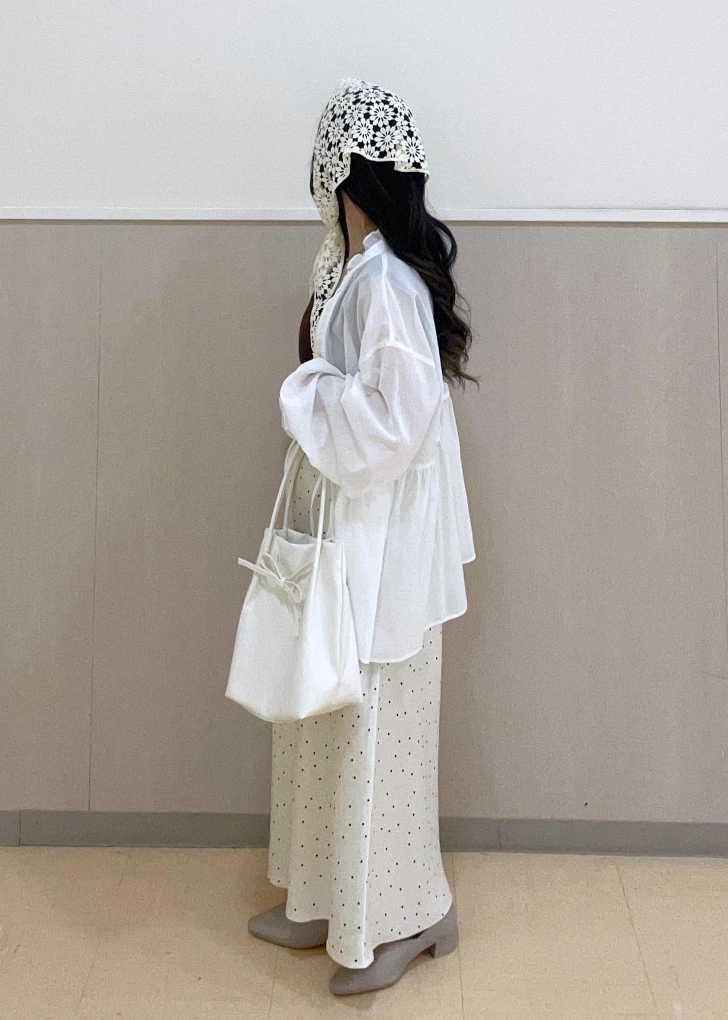 フリルスタンドカラーのブラウスとドットのサテンスカートを合わせたコーデです