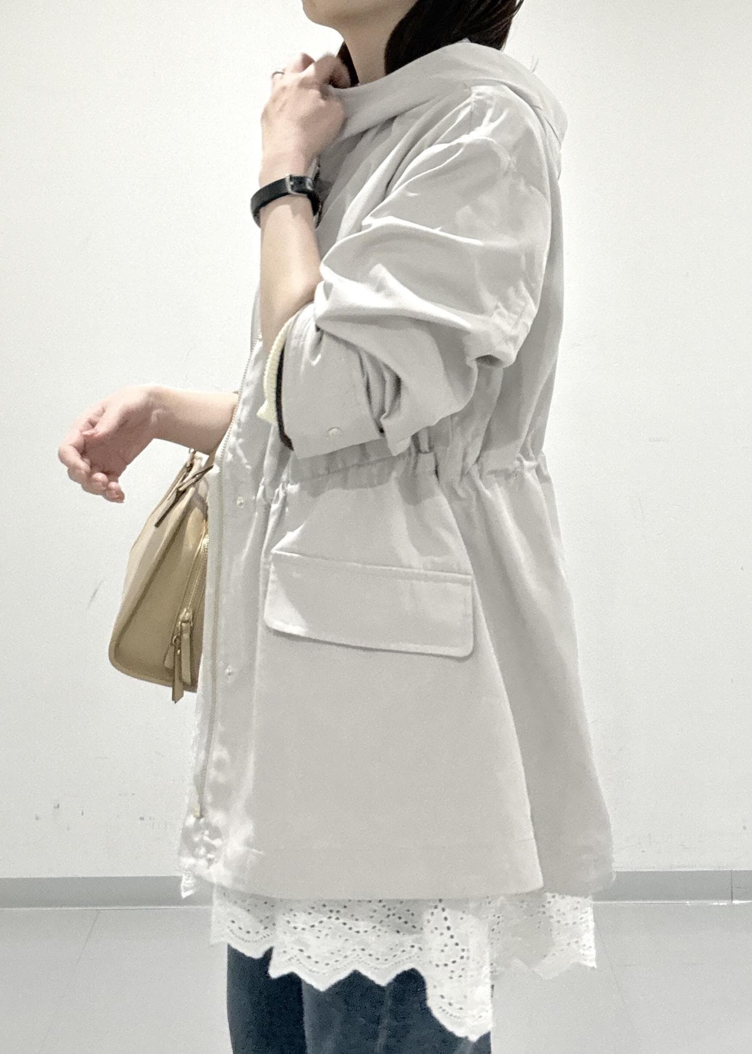 ROPÉ PICNICミドル丈マウンテンパーカー スプリングコート/花粉ガード・撥水ライトグレー / F¥11,880レビューツヤのある柔らかい素材でキレイめ見えするマウンテンパーカーです。