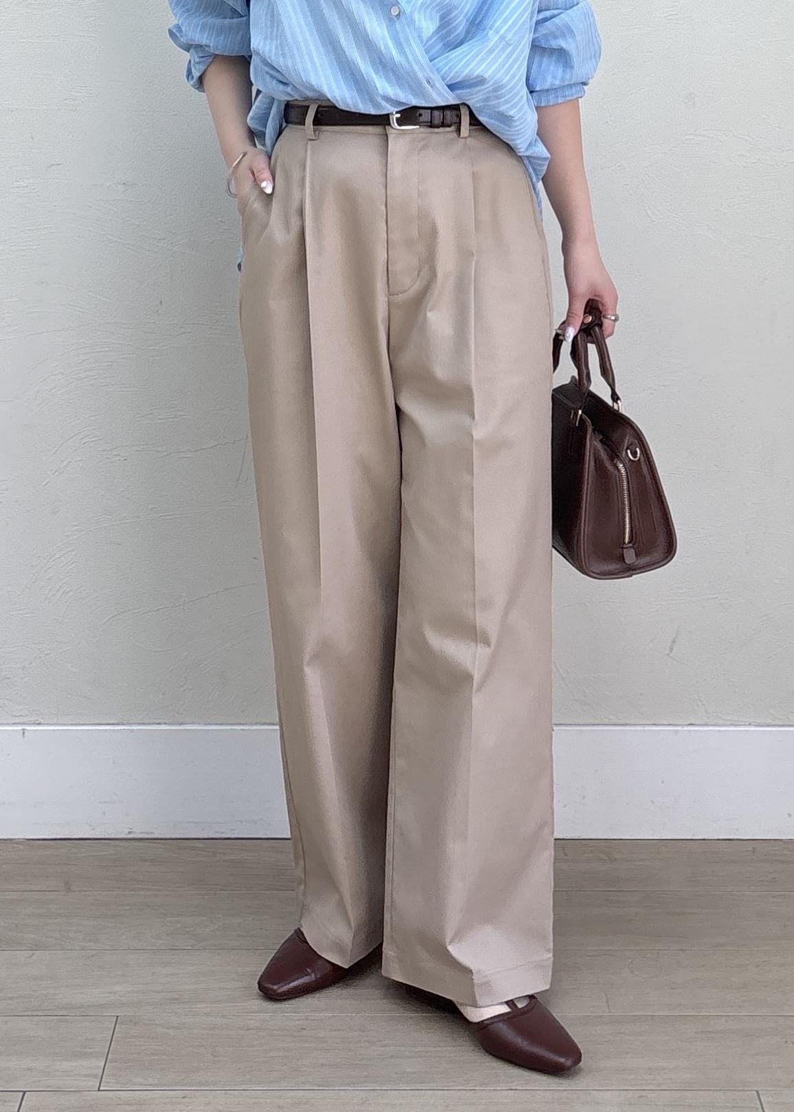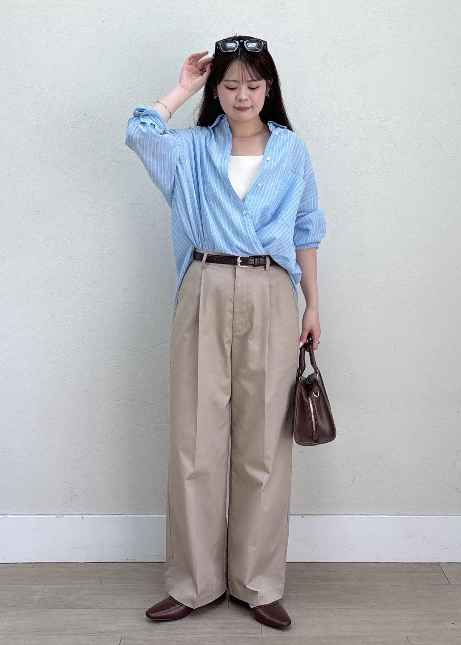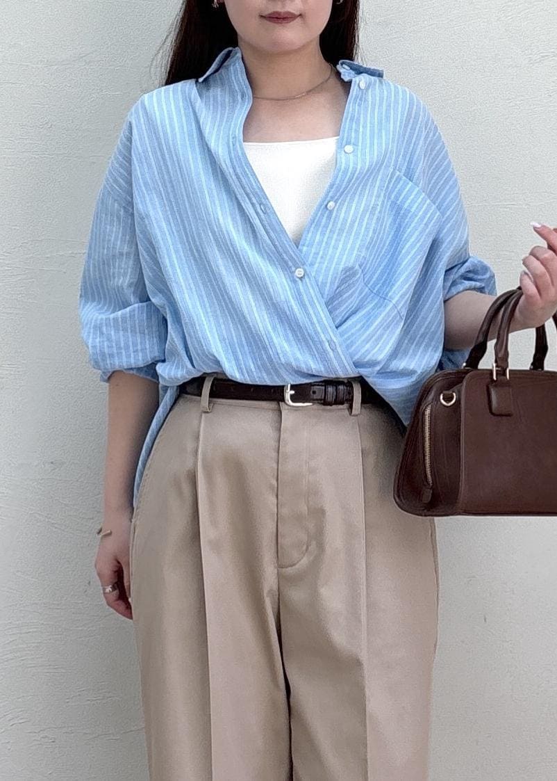 ブルー×ベージュの爽やかな組み合わせで春夏のヘルシーなスタイルにしてみました。シャツはカシュクール風にアレンジしてシンプルになりすぎないように、小物はブラウンでまとめて今年らしさもプラスしました。