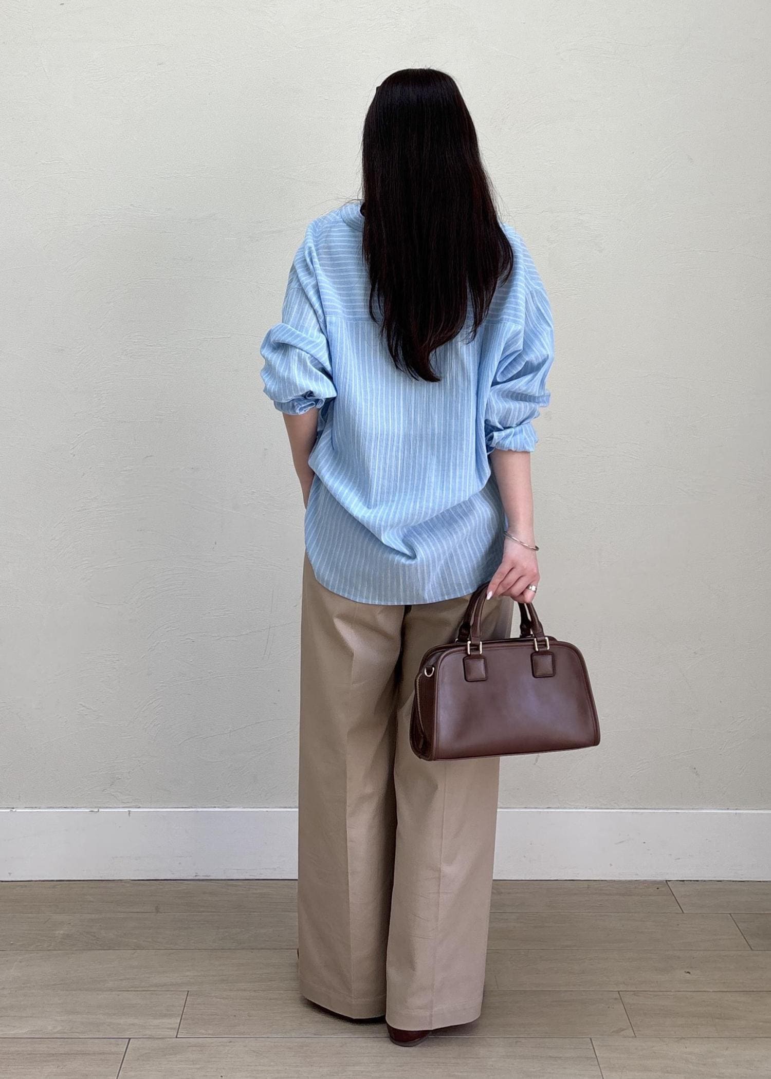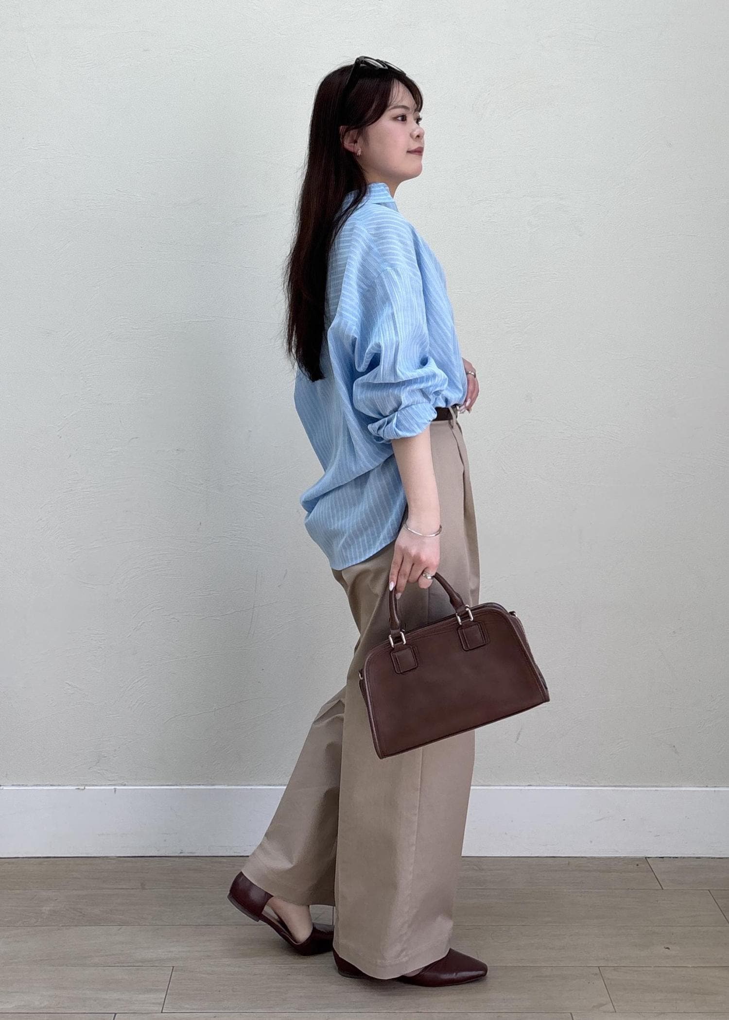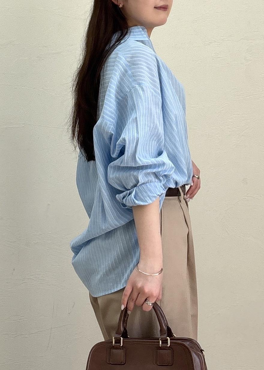 ブルー×ベージュの爽やかな組み合わせで春夏のヘルシーなスタイルにしてみました。シャツはカシュクール風にアレンジしてシンプルになりすぎないように、小物はブラウンでまとめて今年らしさもプラスしました。