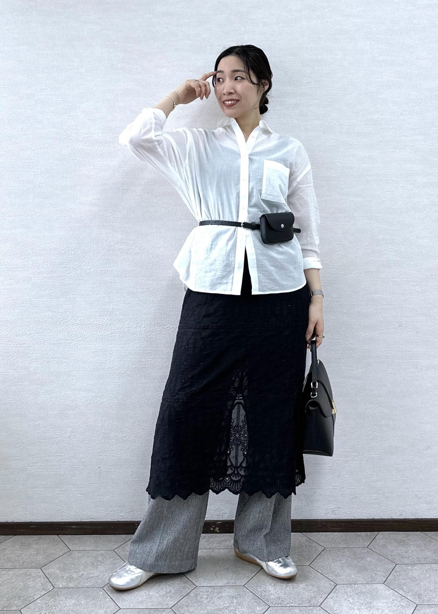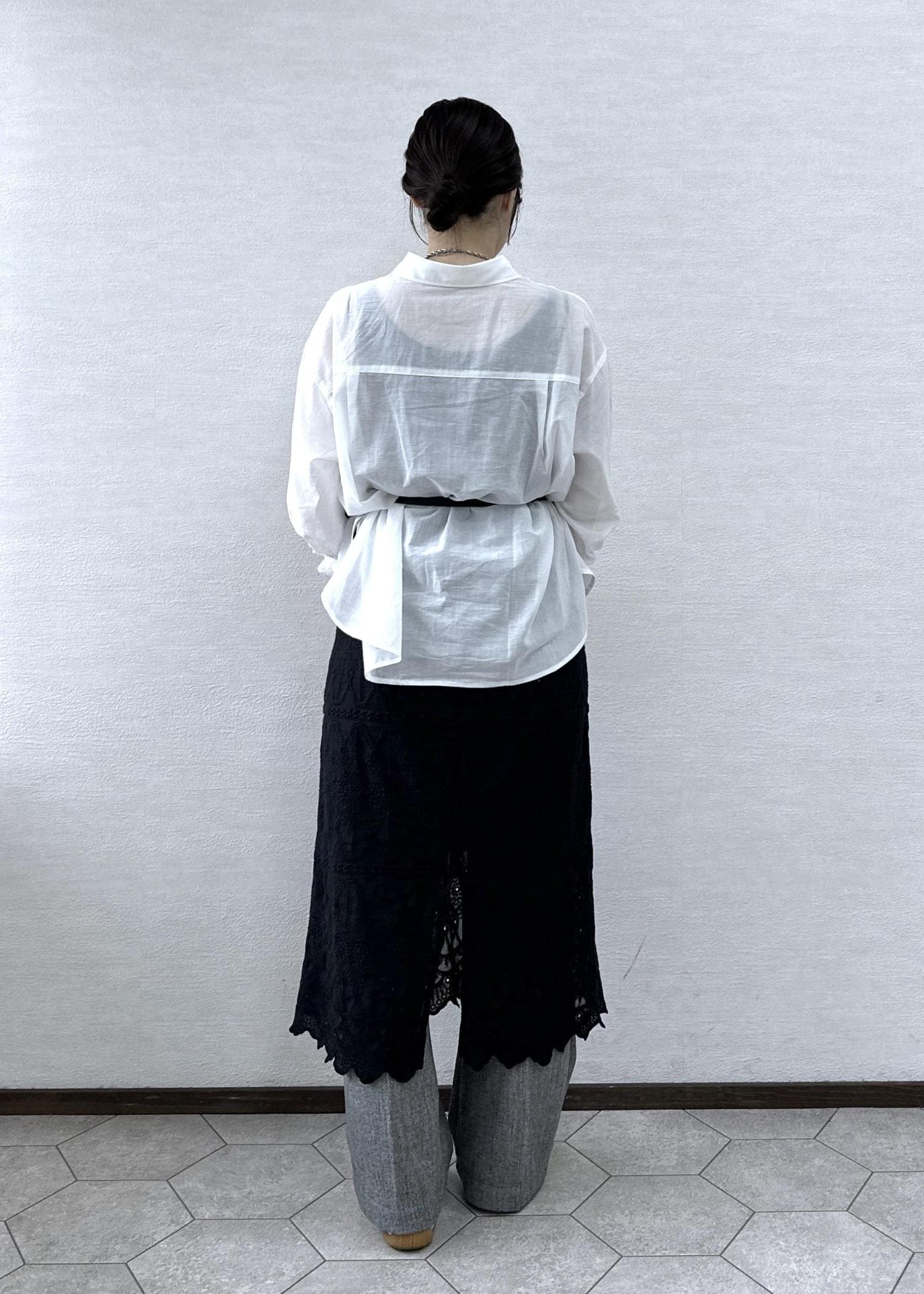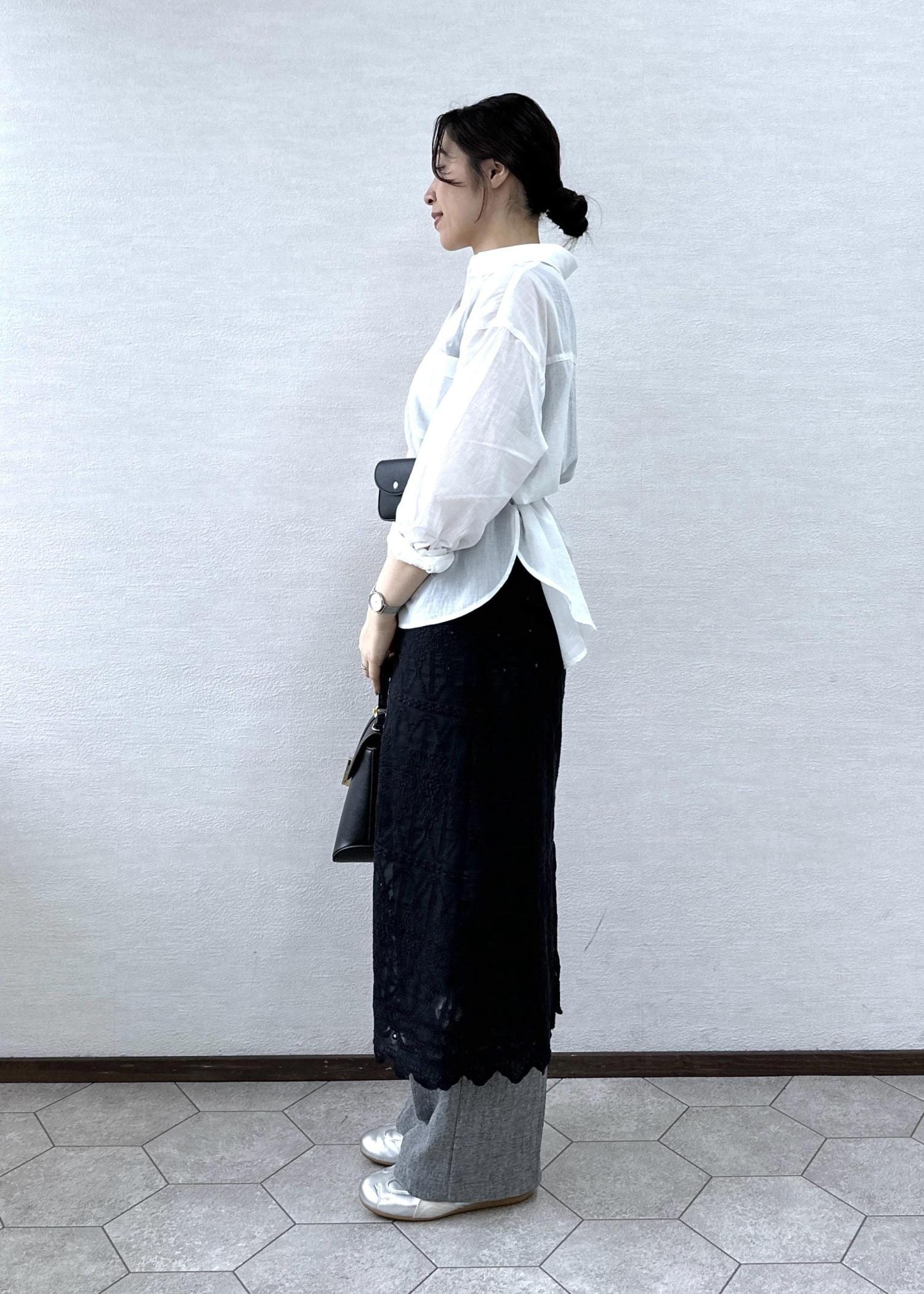 ベーシックな白シャツにレースをレイヤードしたトレンド感のあるコーデ。