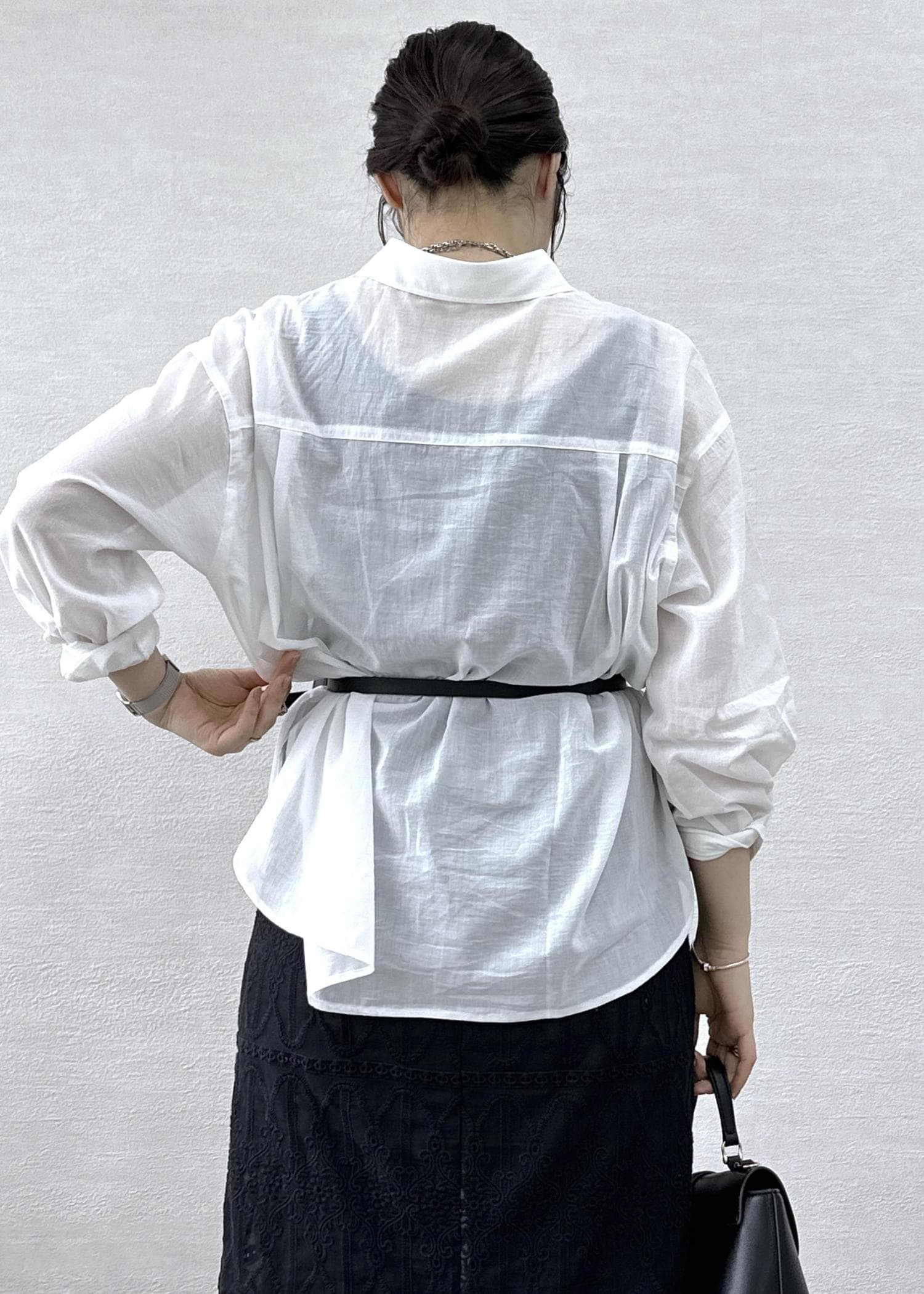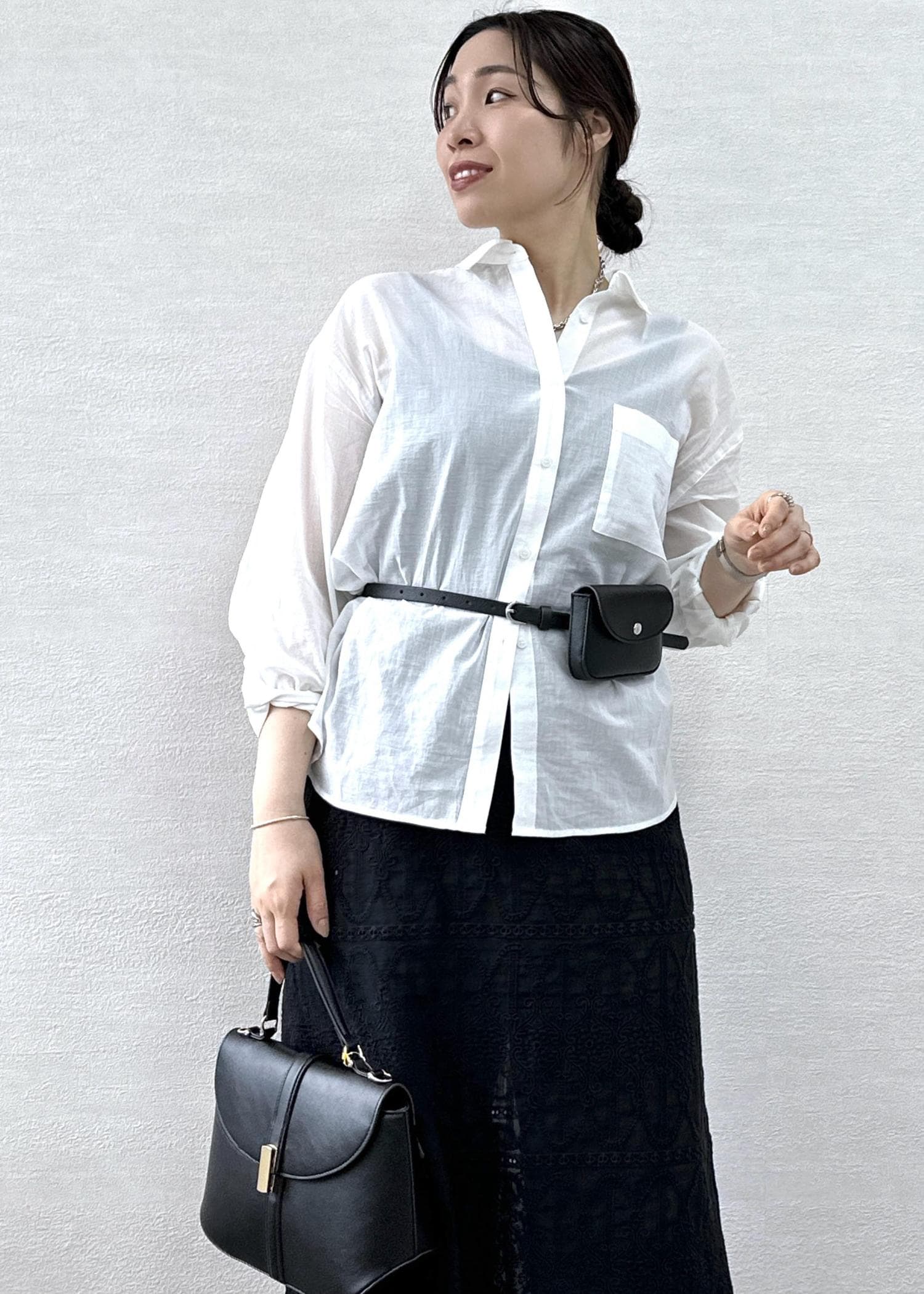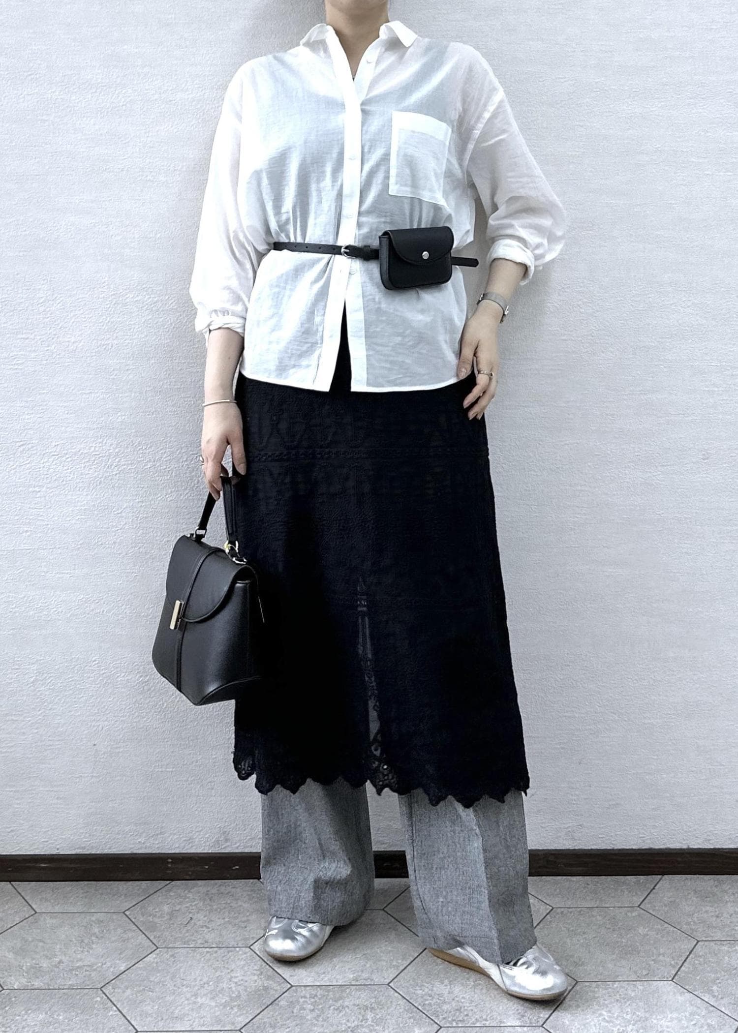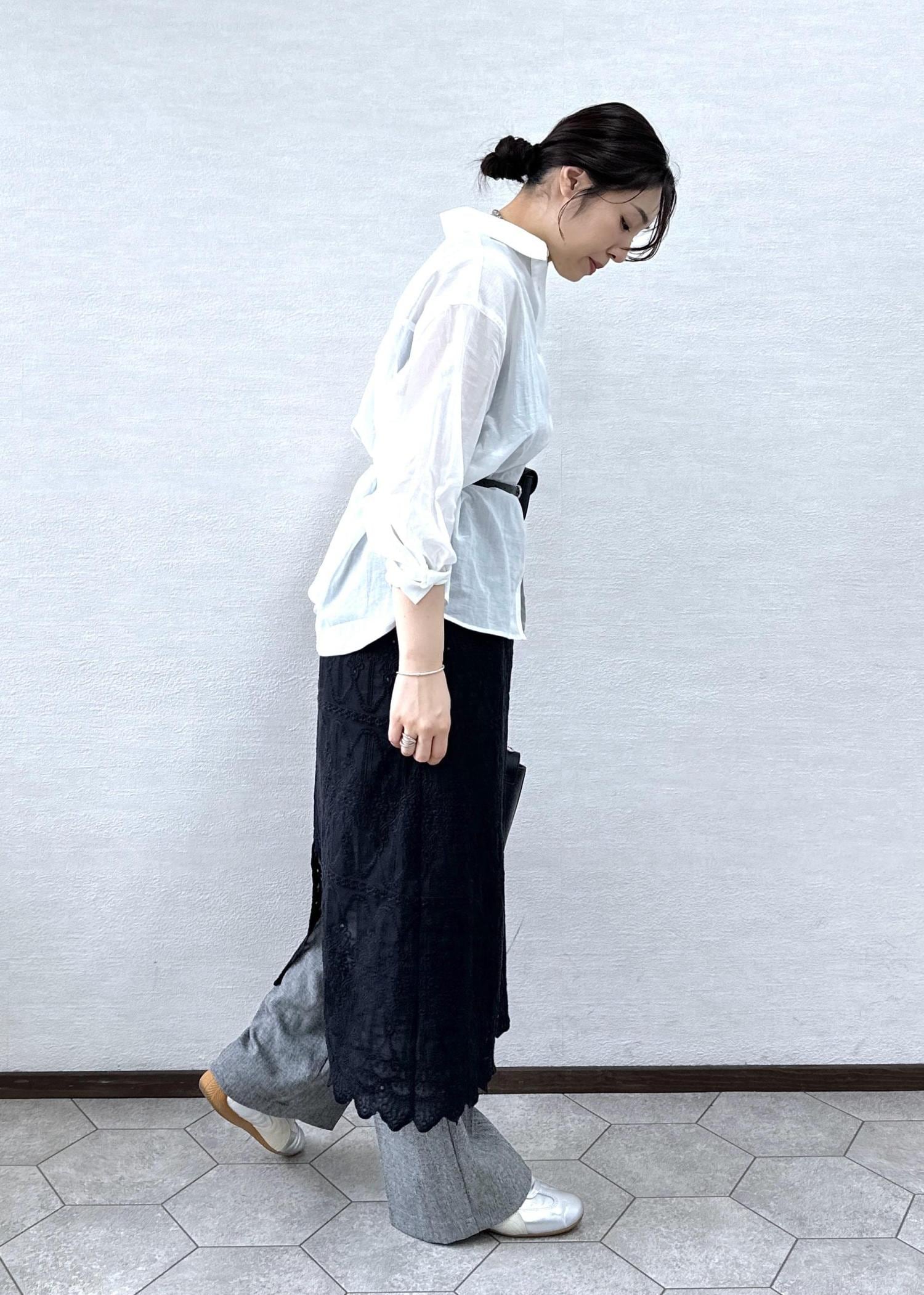 ベーシックな白シャツにレースをレイヤードしたトレンド感のあるコーデ。