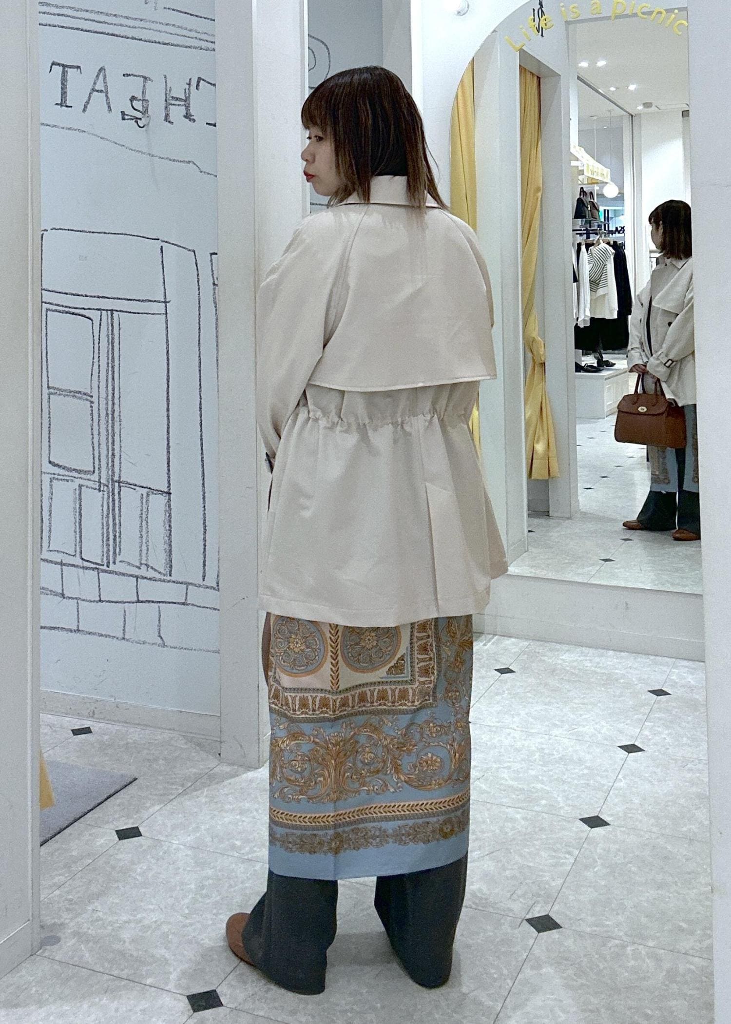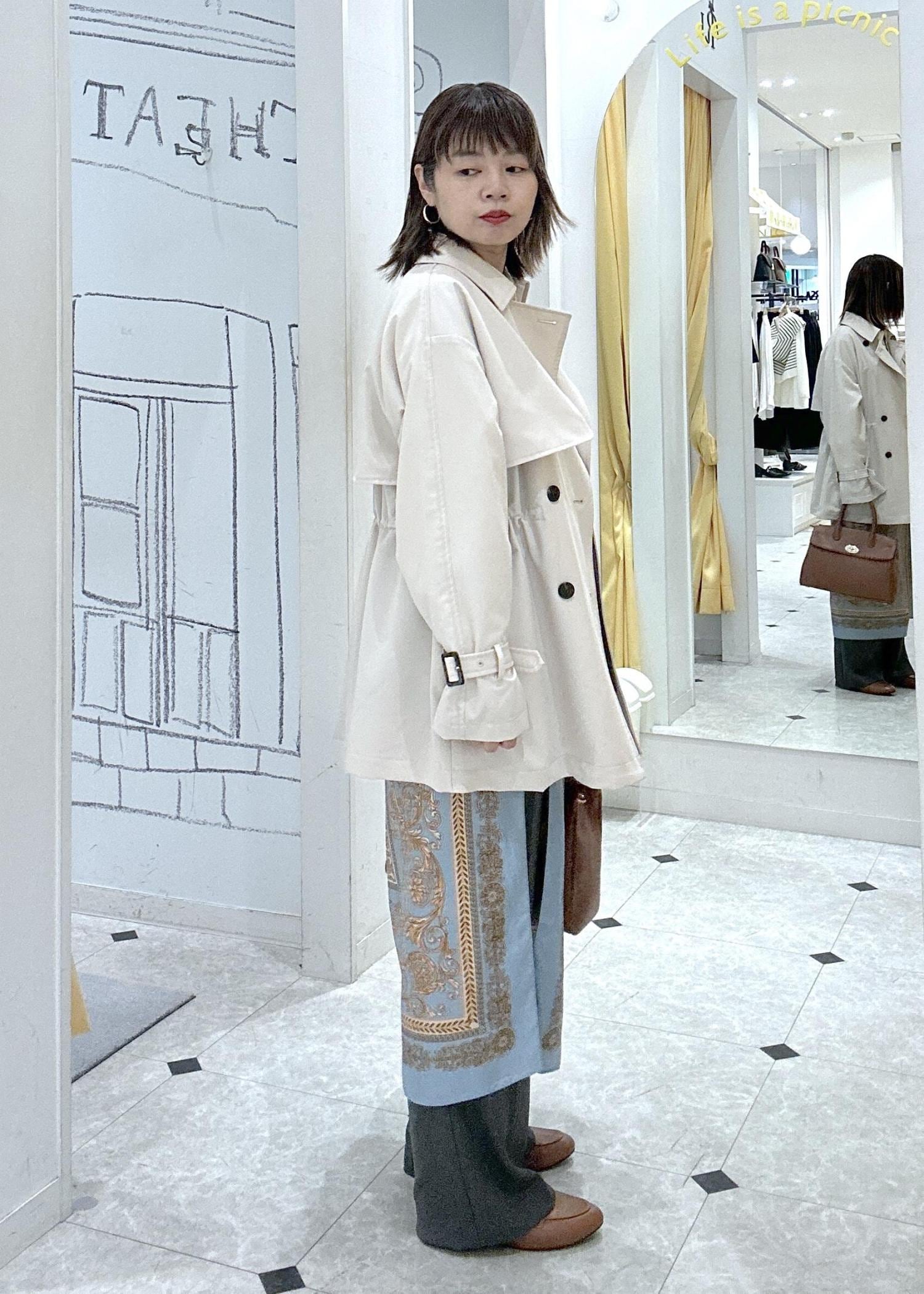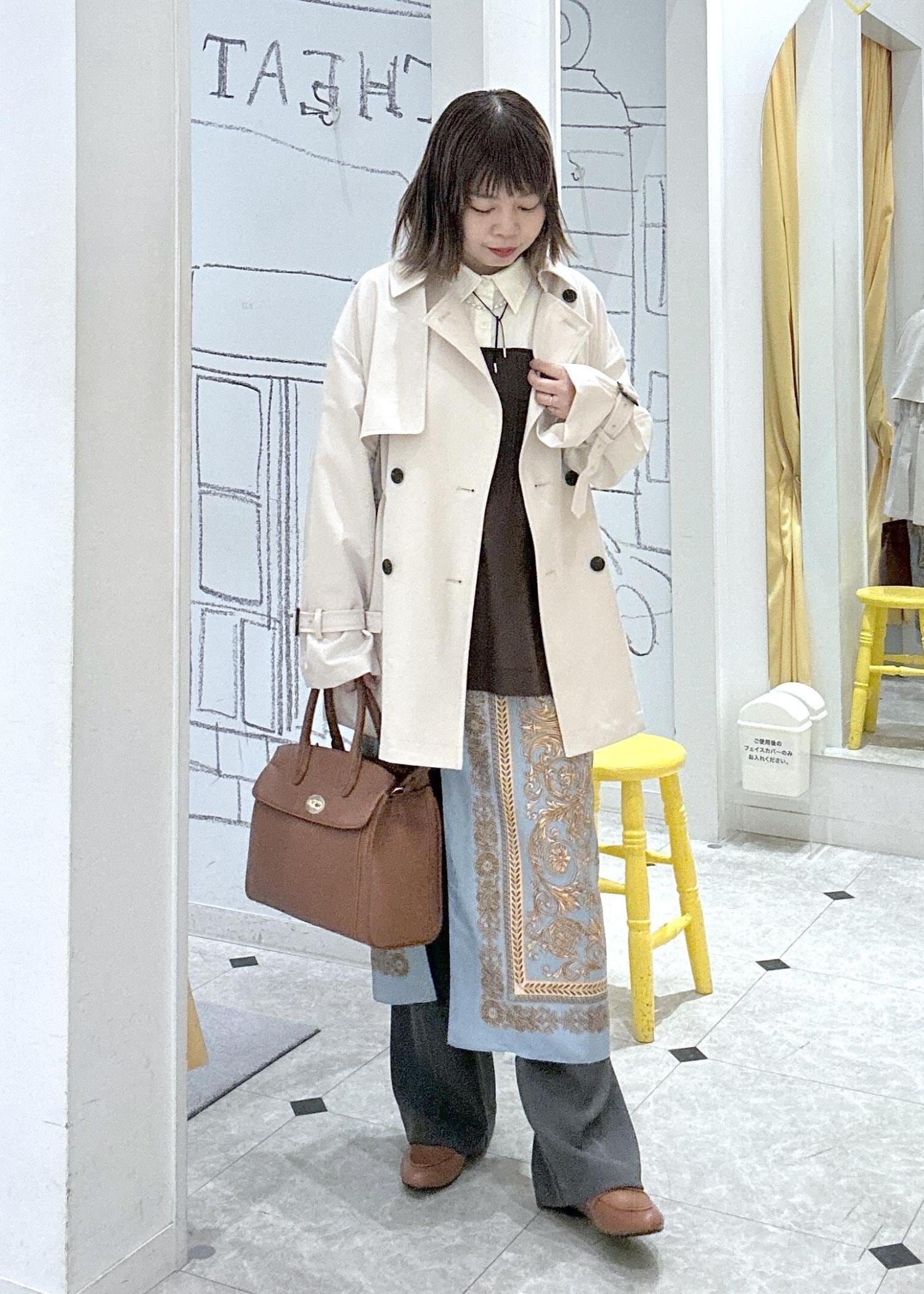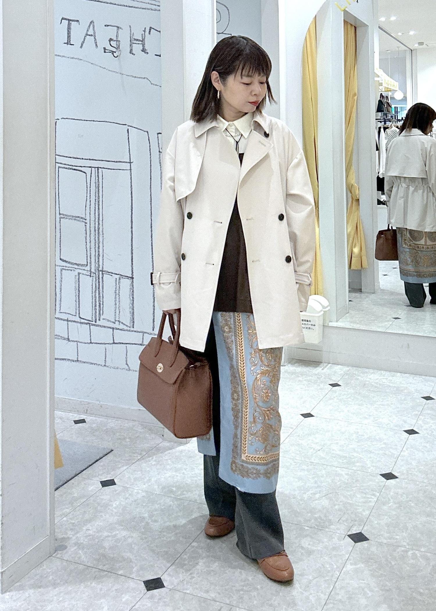 トレンチコートをメインにオフィスにも普段でも着られるキレイ目スタイル。スカーフを腰に巻いて体型カバーとブルーのカラーをプラス!オシャレ感を意識したレイヤードスタイルです。春のお出かけにもオススメスタイルです♪