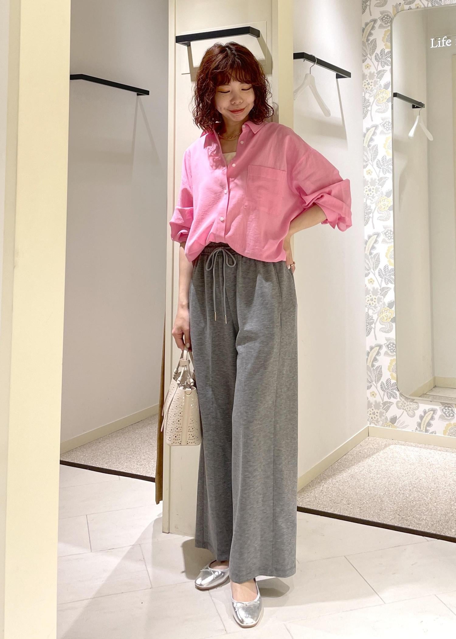 爽やかなお気軽シャツに、emurのスウェットパンツを合わせた春のリラックスコーデ。