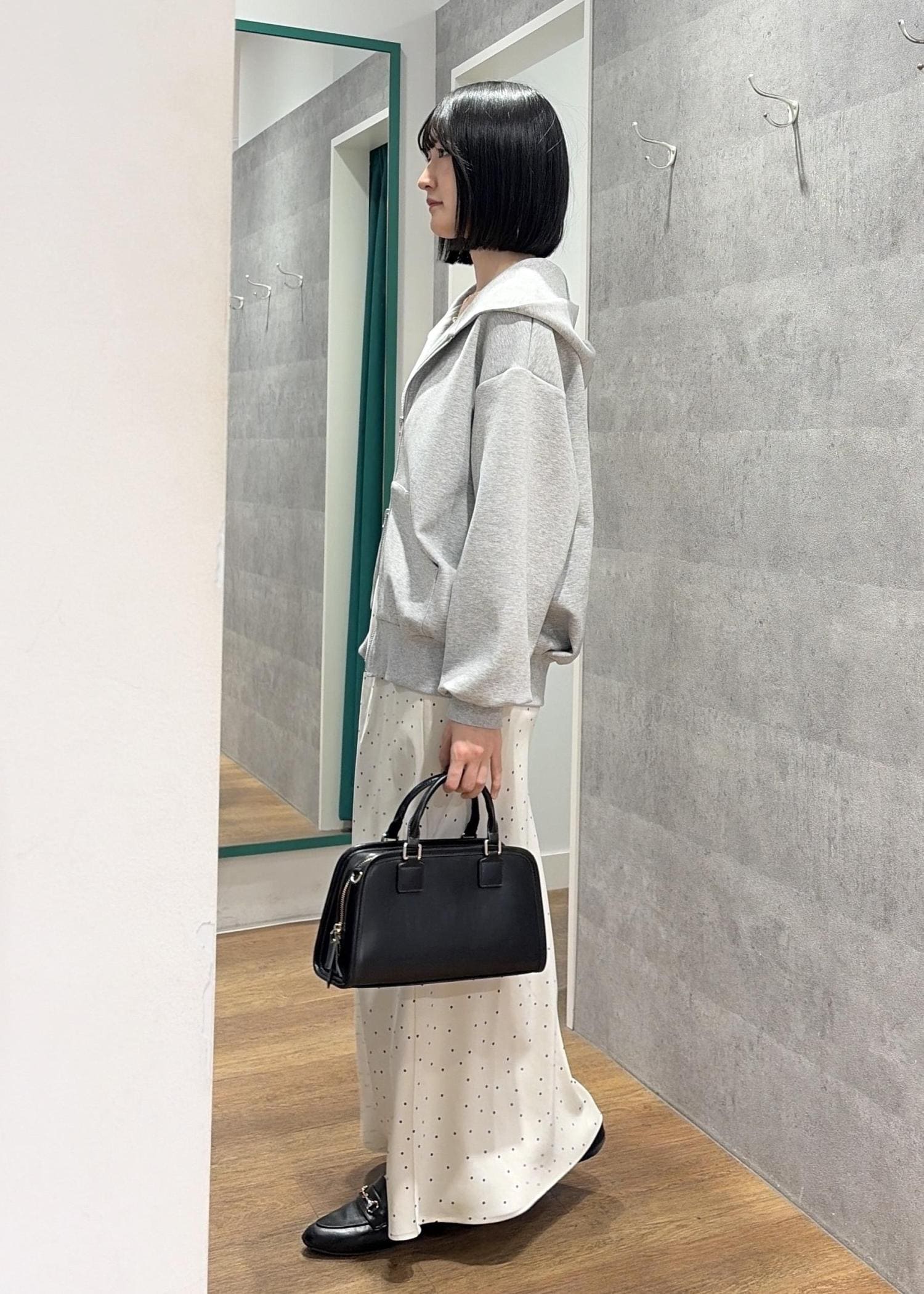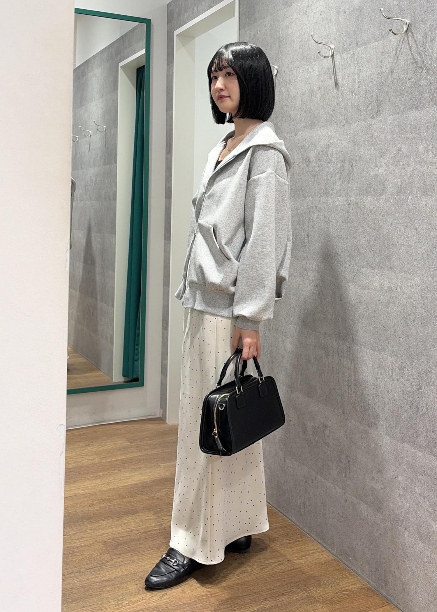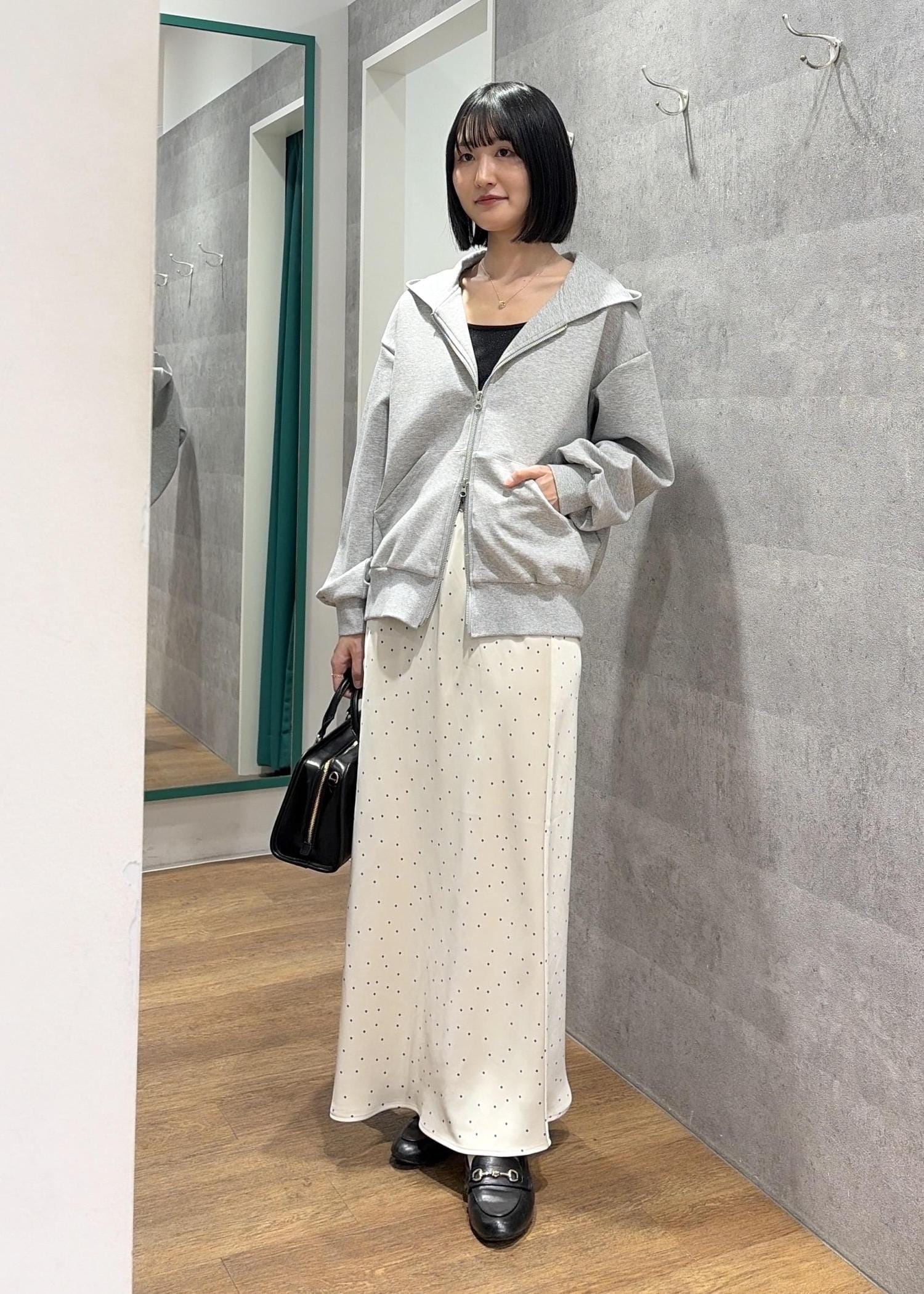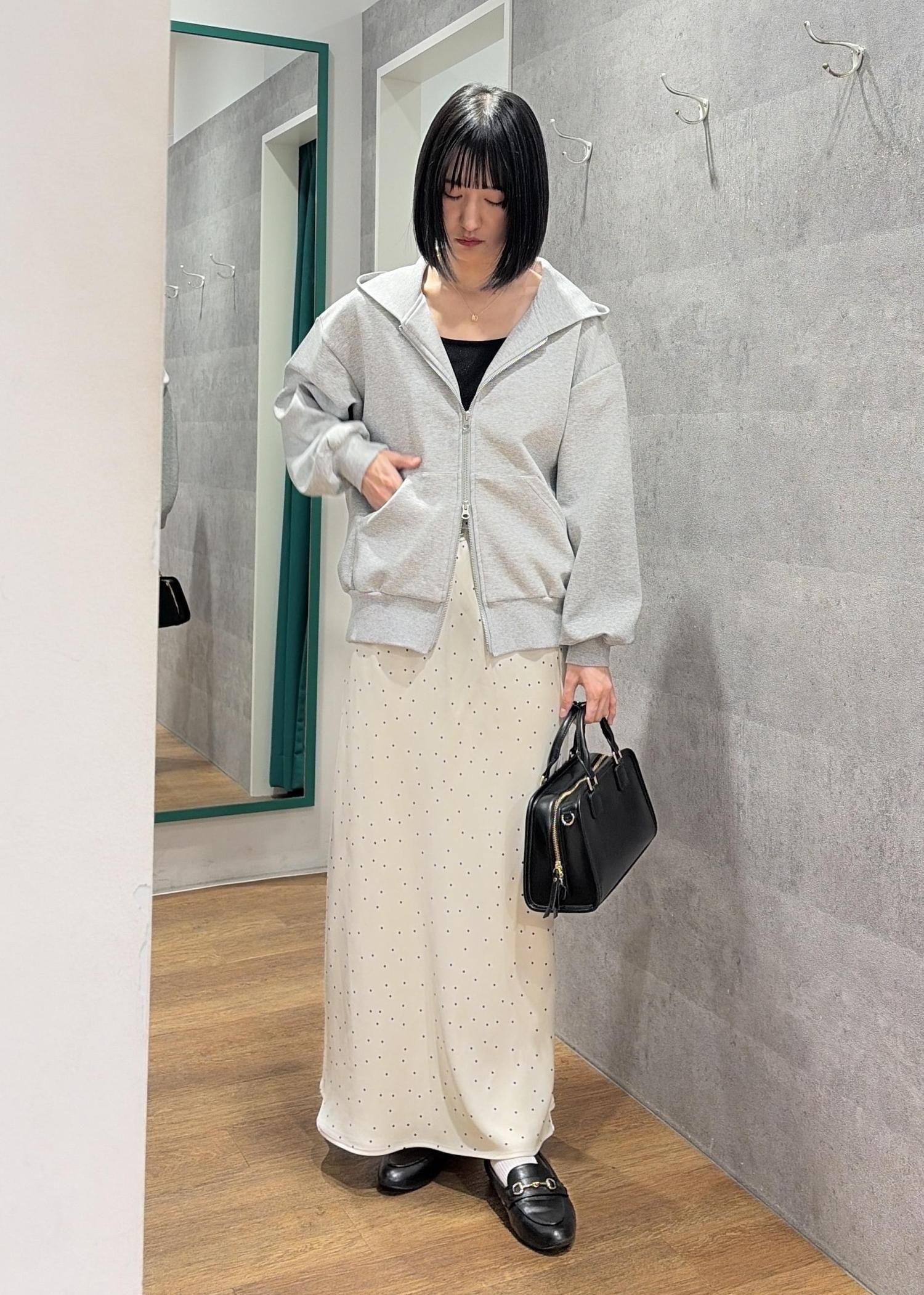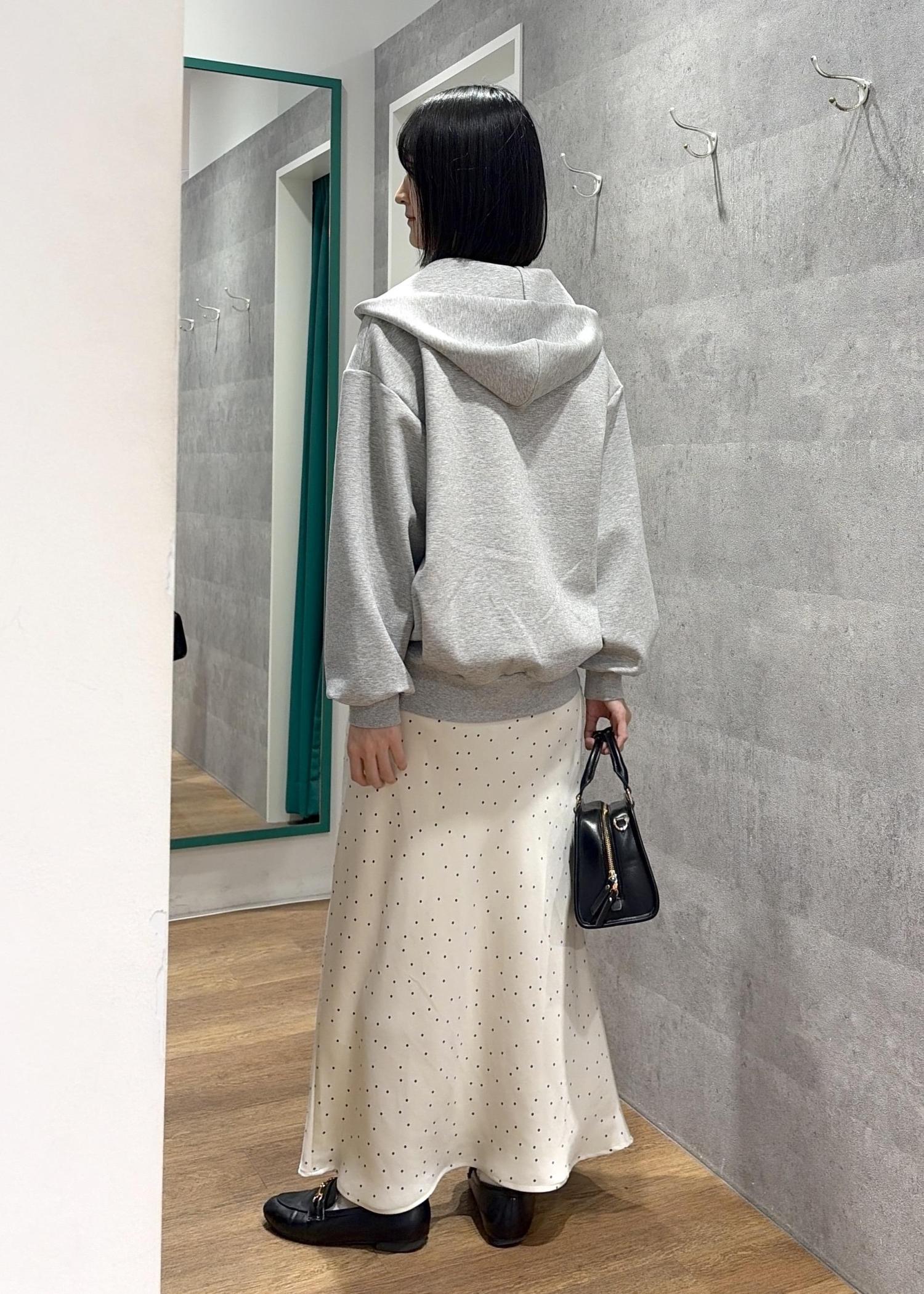 ダブルジップフーディ×サテンドットスカート