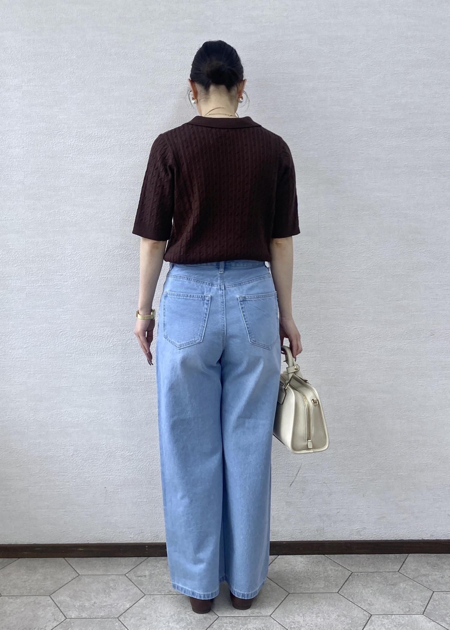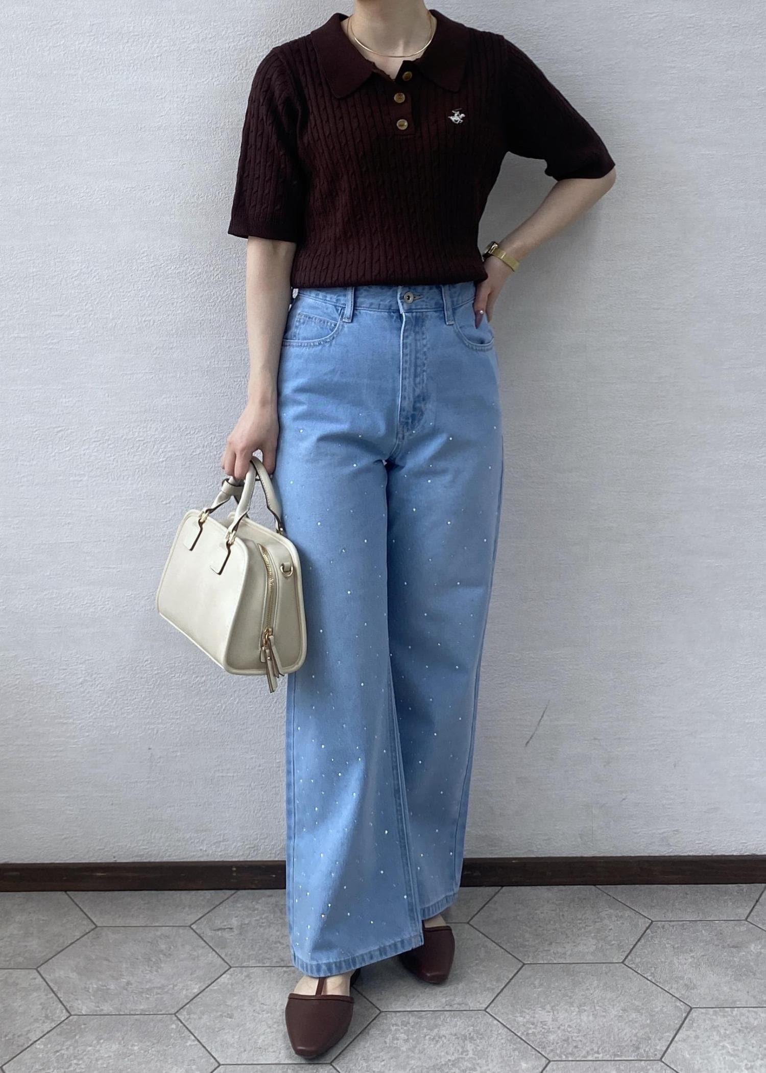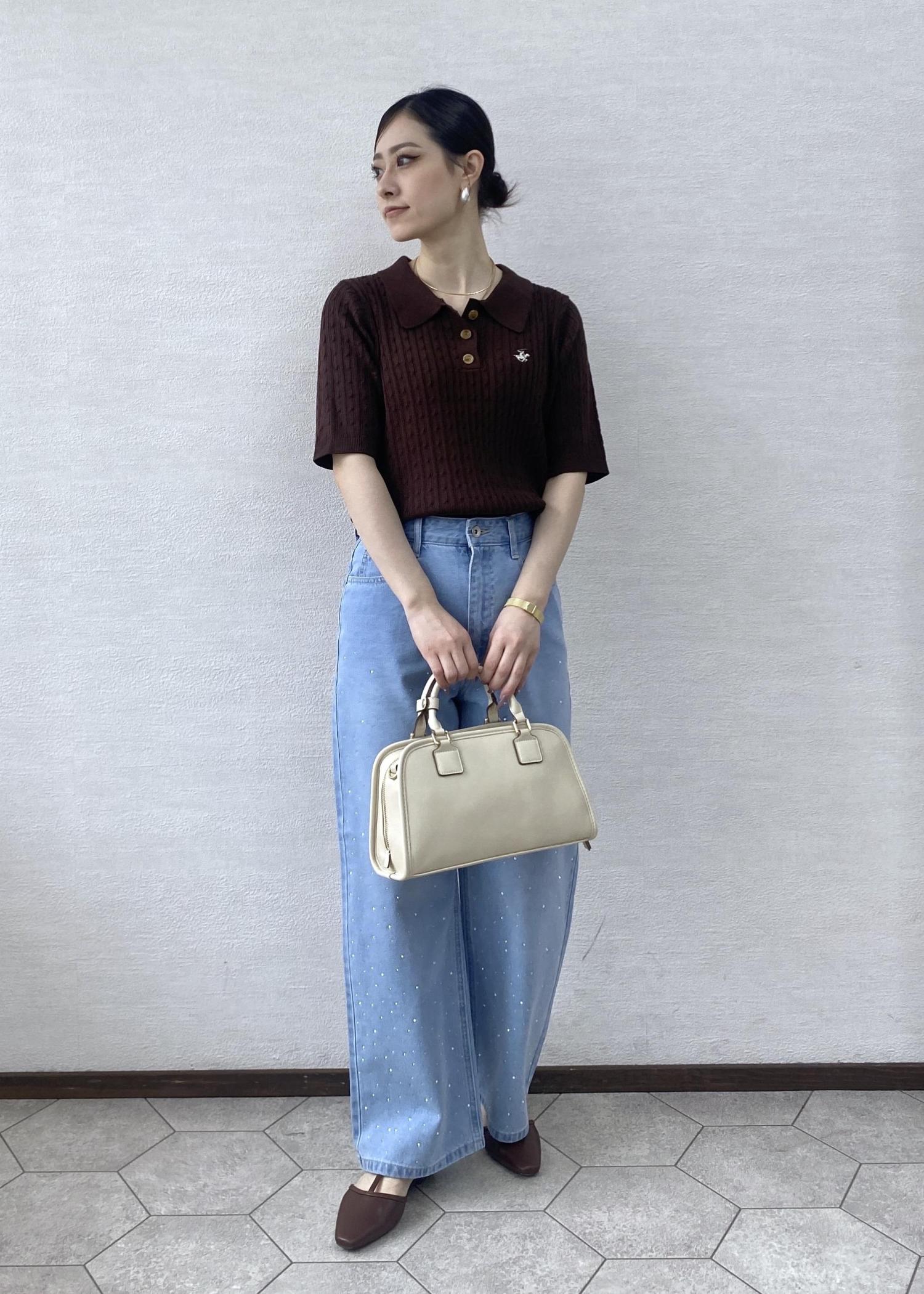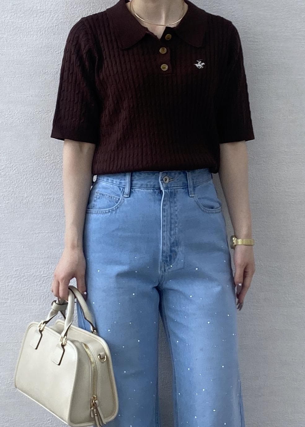 ブラウンカラーがお洒落感のあるポロニットにビジューとパールが華やか見えするデニムを合わせたお出かけにぴったりなコーディネートです。