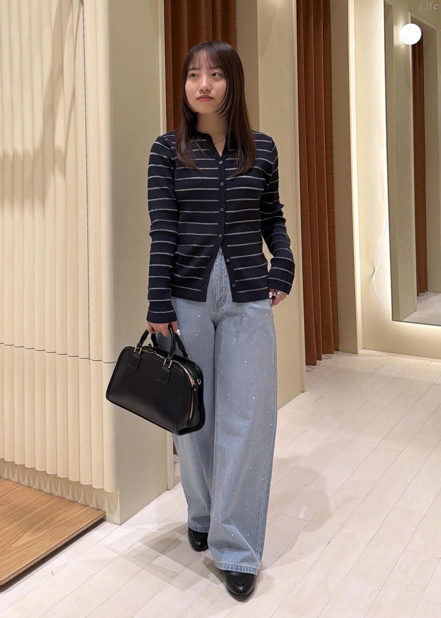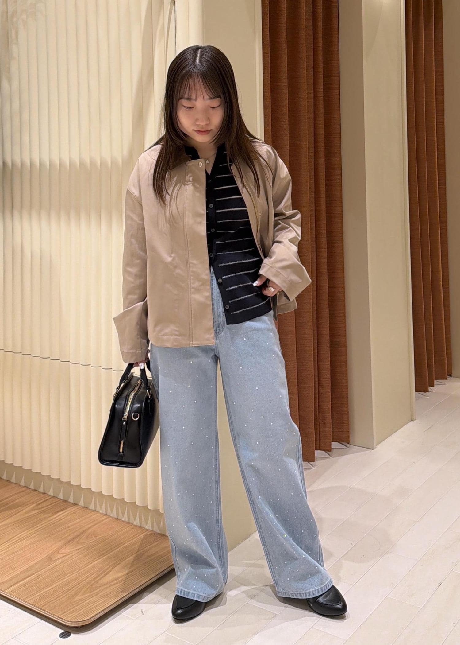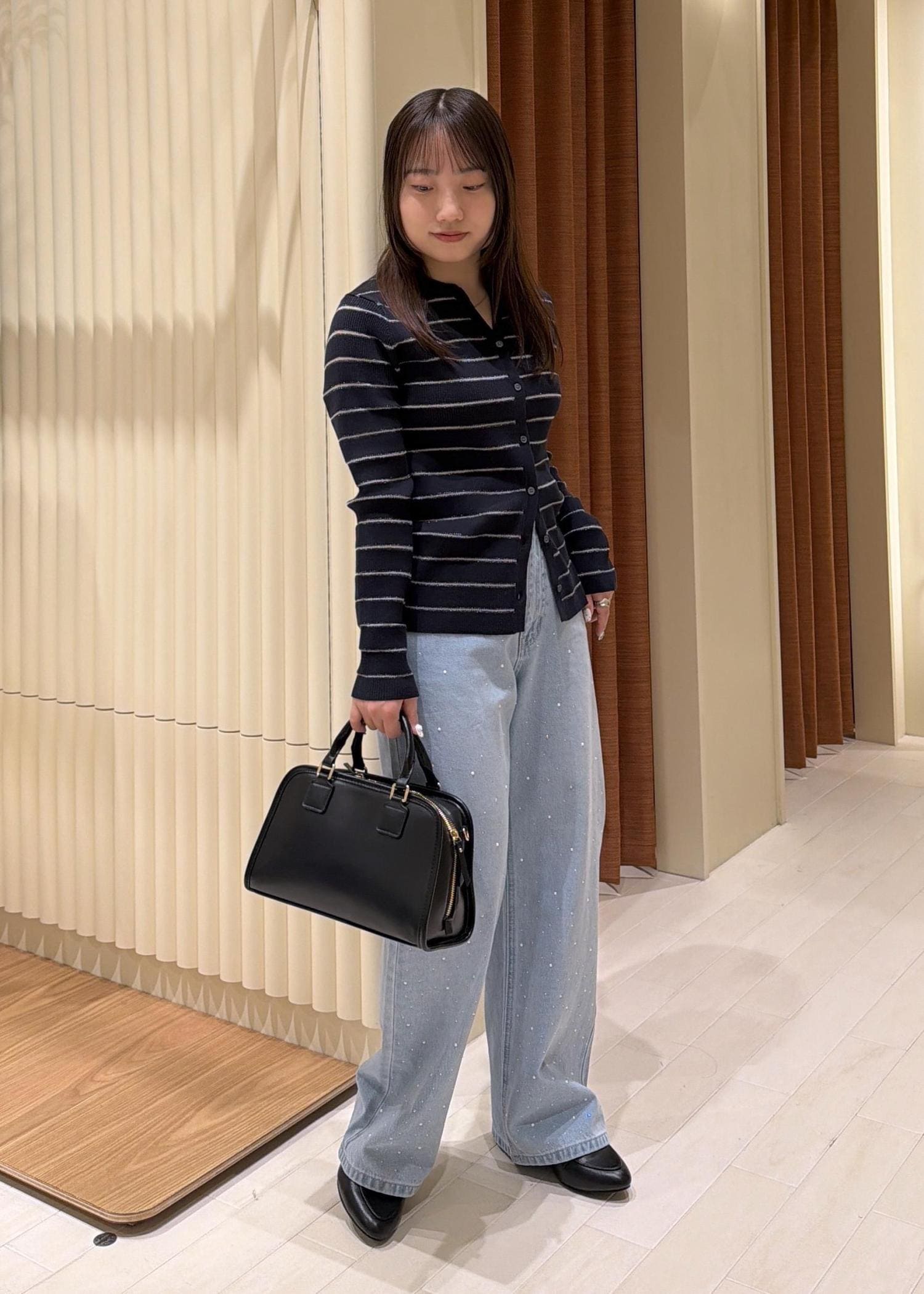 ビジューデニムとカーディガンできちんと感がでるコーデにしました。