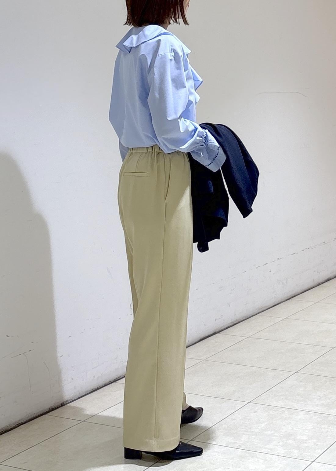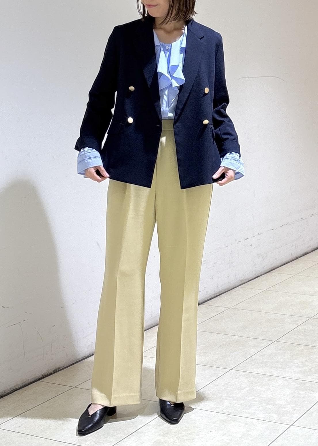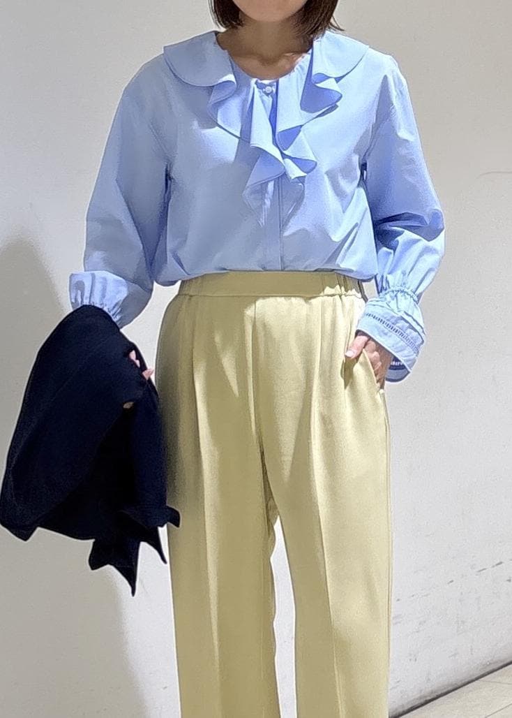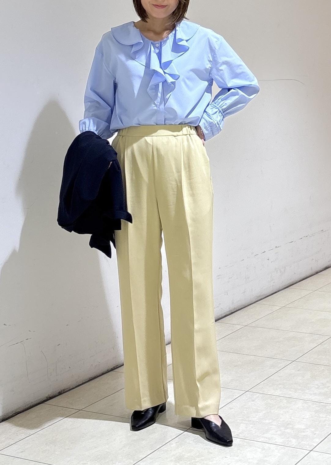 ブルーのブラウスにフレアパンツを合わせた春カラーコーデ。