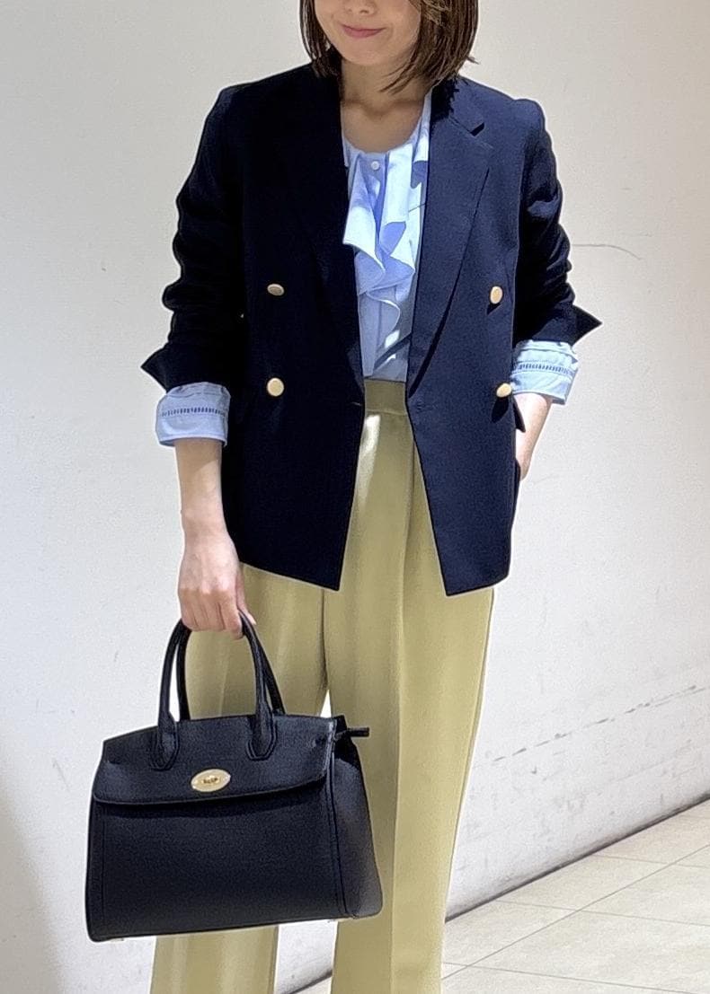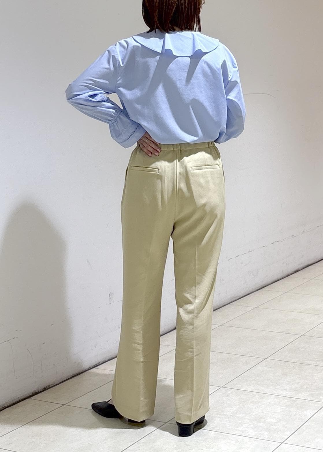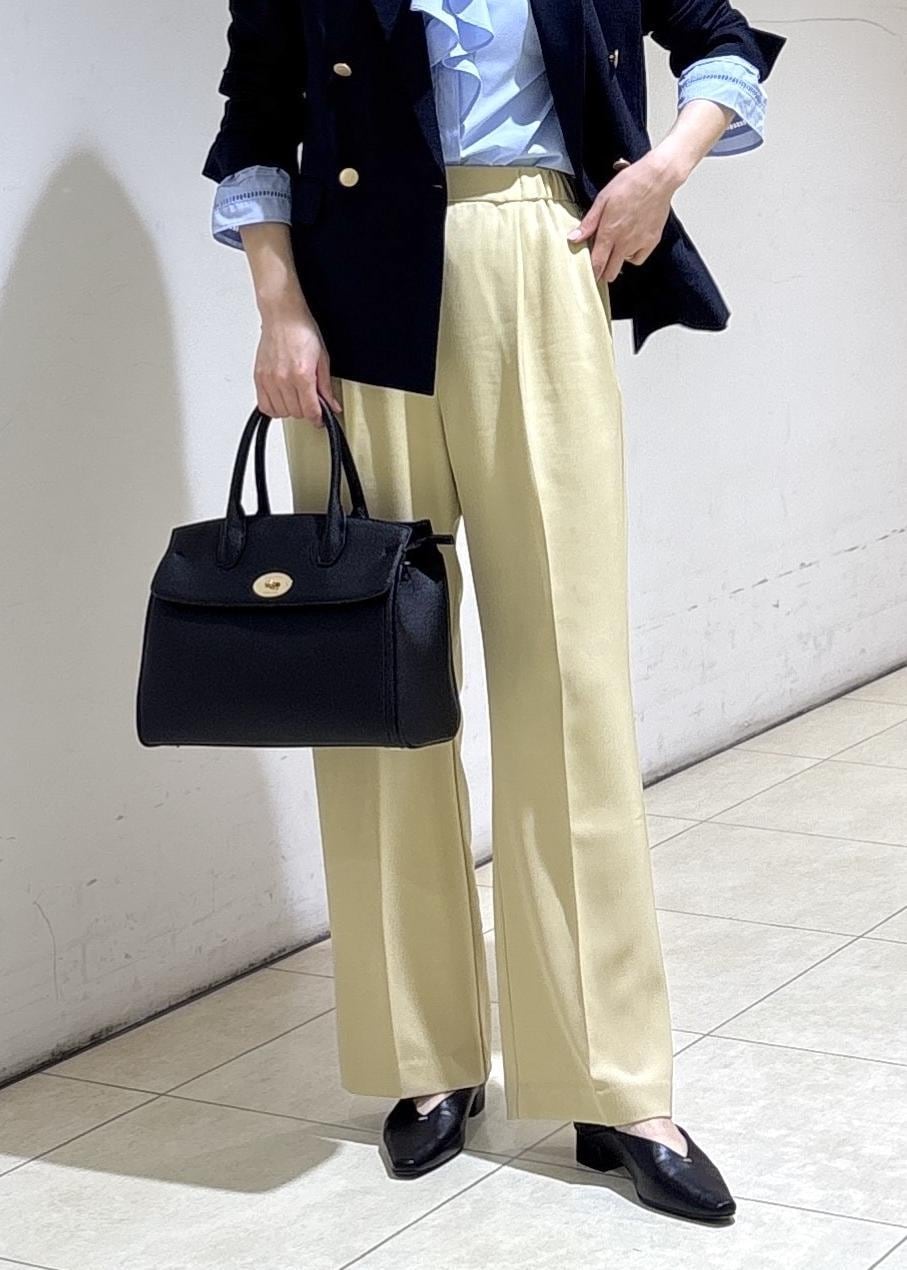 ブルーのブラウスにフレアパンツを合わせた春カラーコーデ。