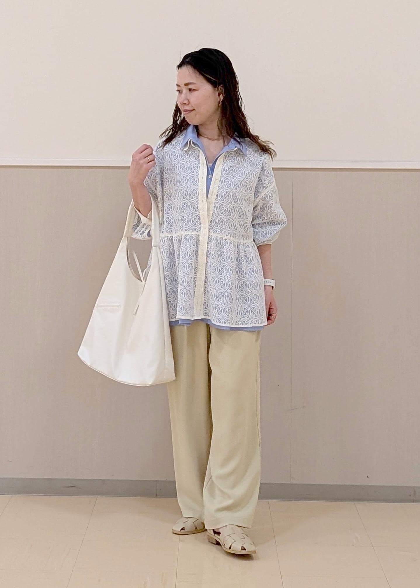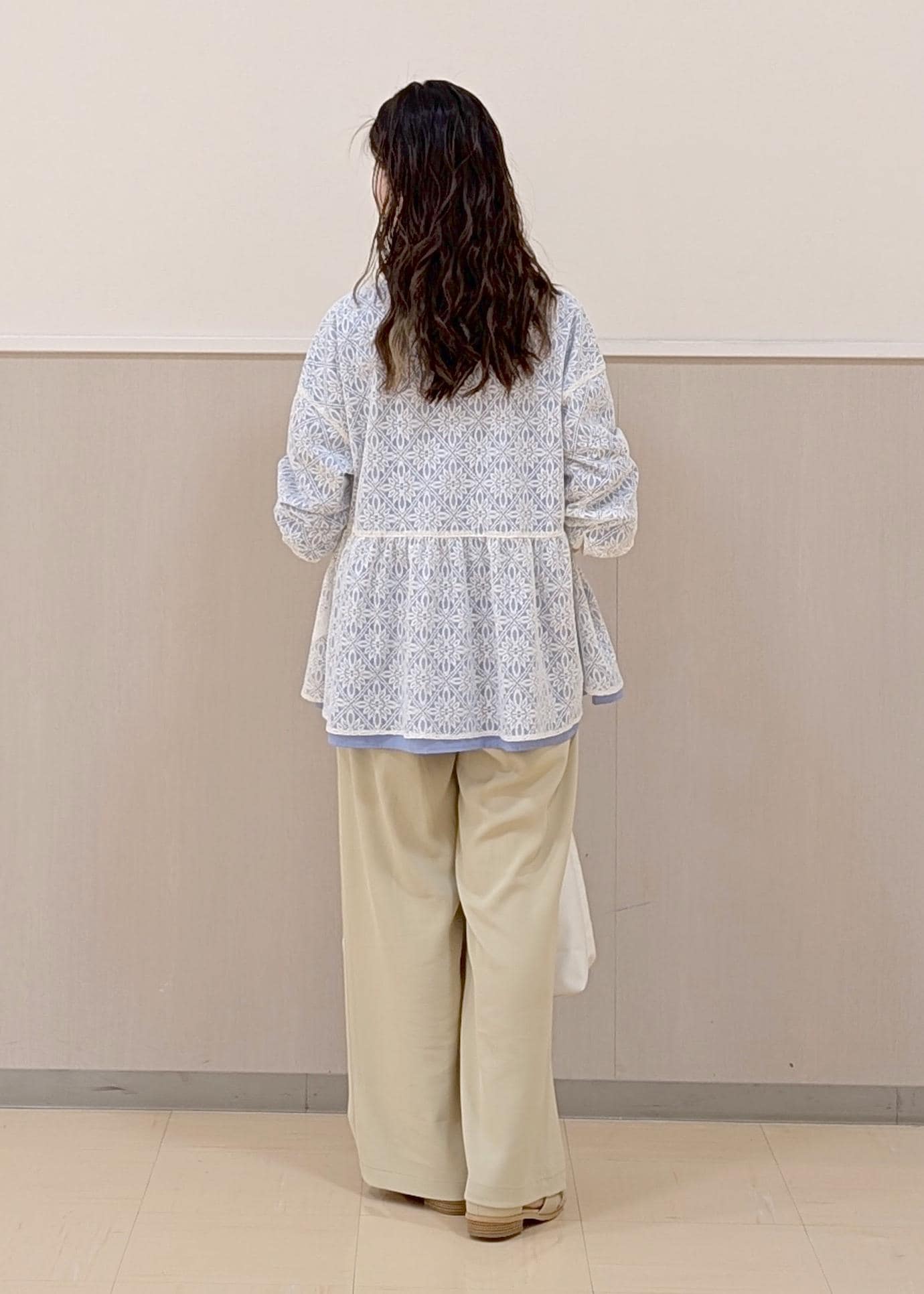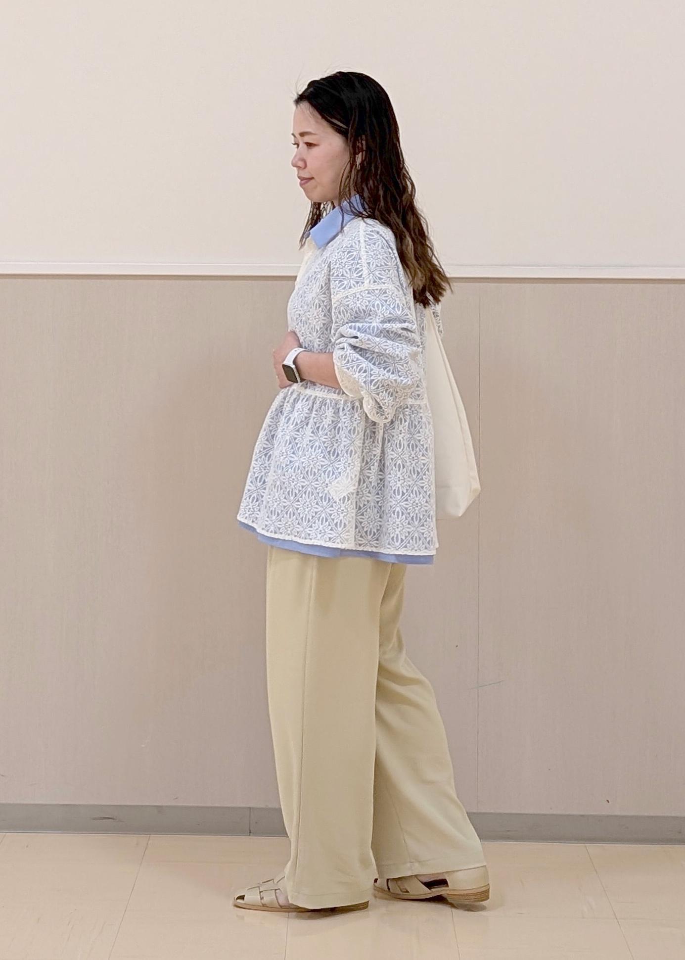 中のブラウスでブルーを見せたカラーコーディネートです♪