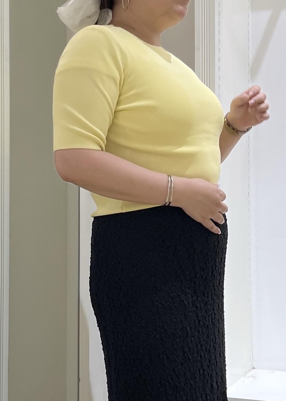 素材感はもちろん、開きすぎず詰まりすぎずの首元もインナーに使いやすい。 -