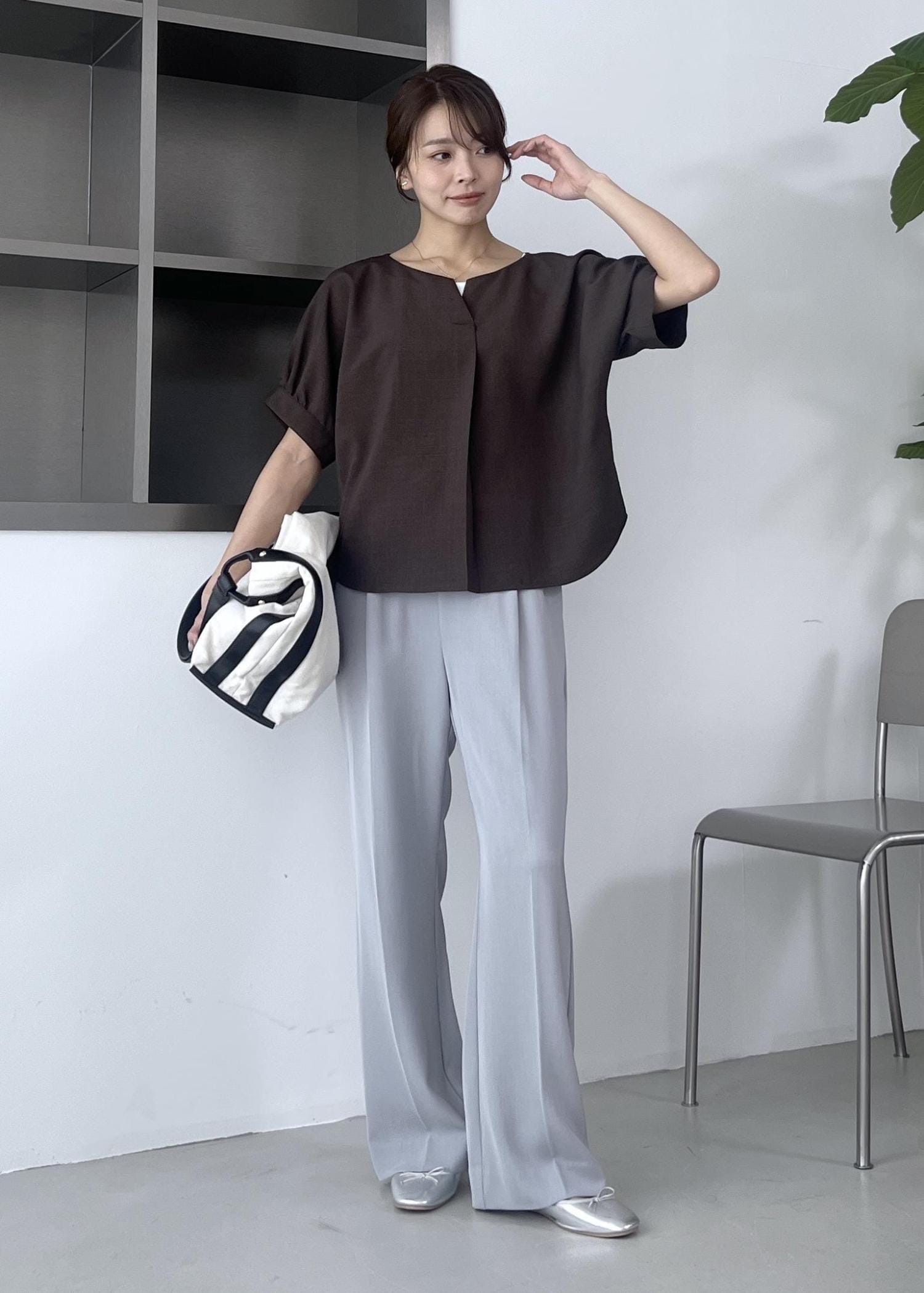 ジャストの着丈なのでボトムを選ばず合わせやすいです。 -