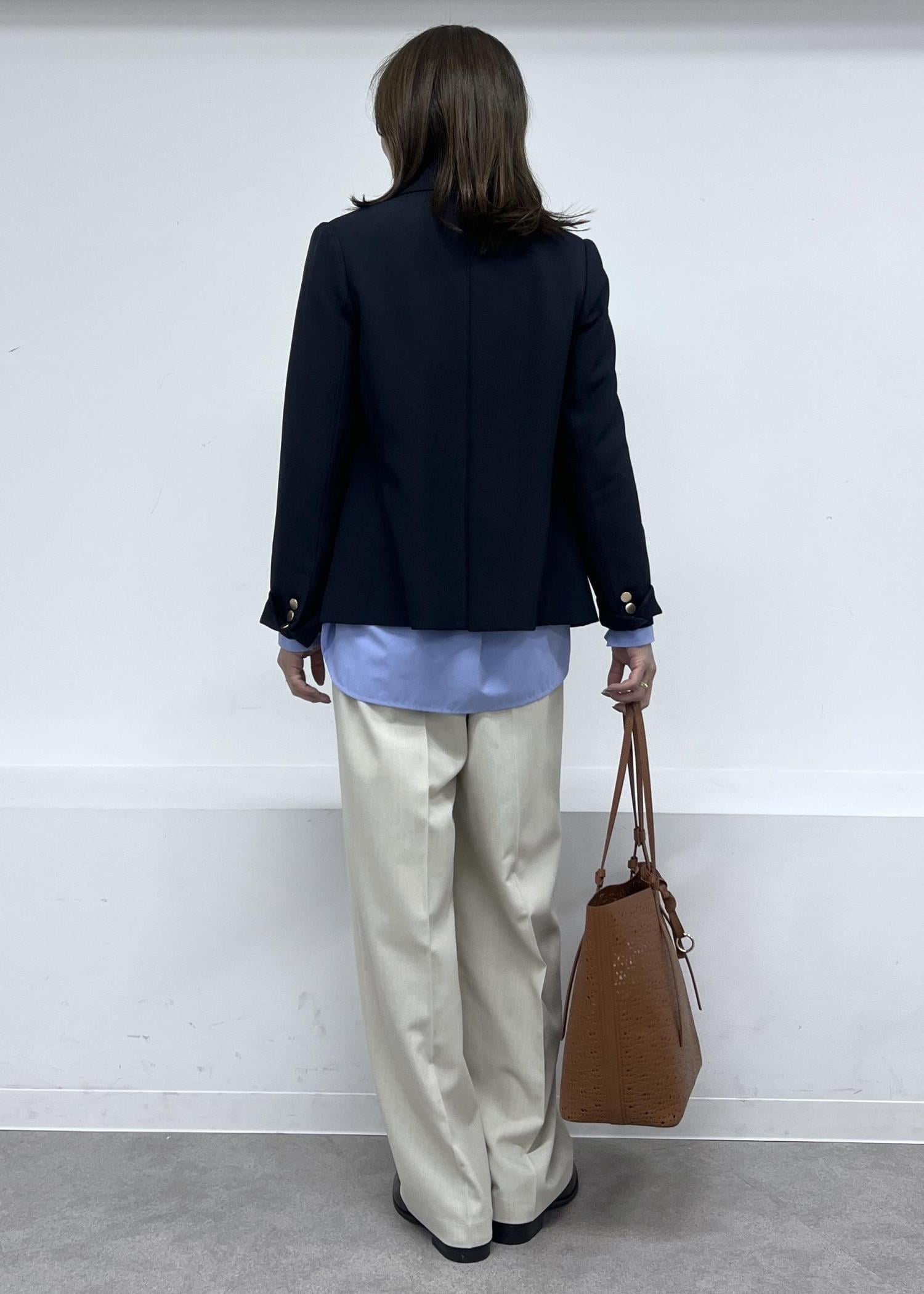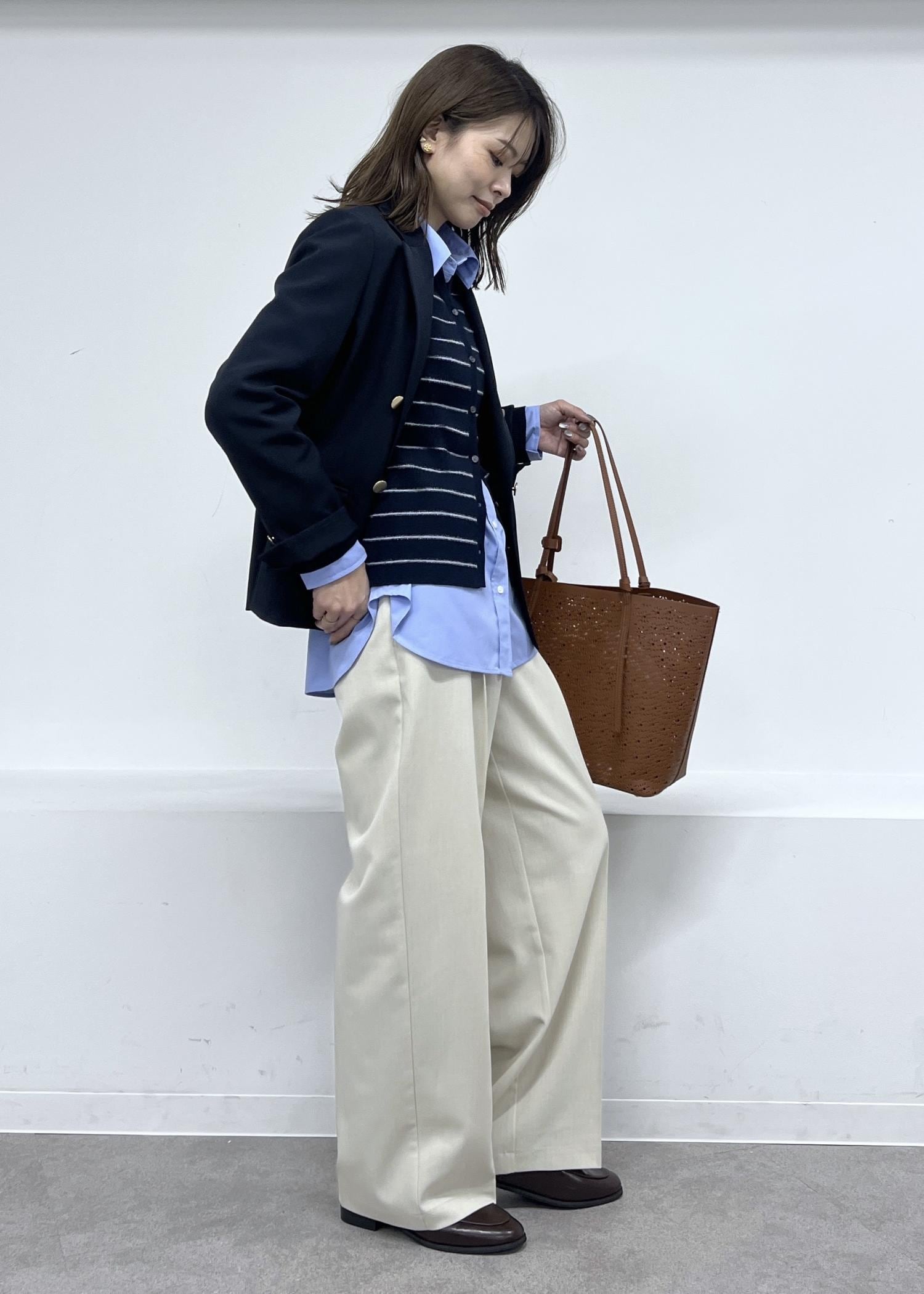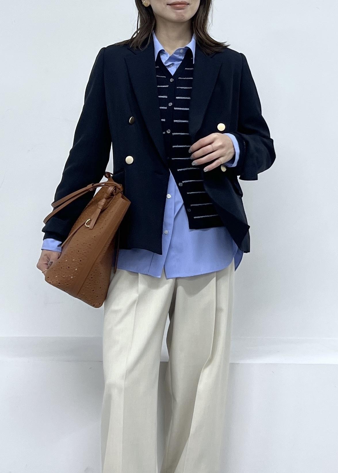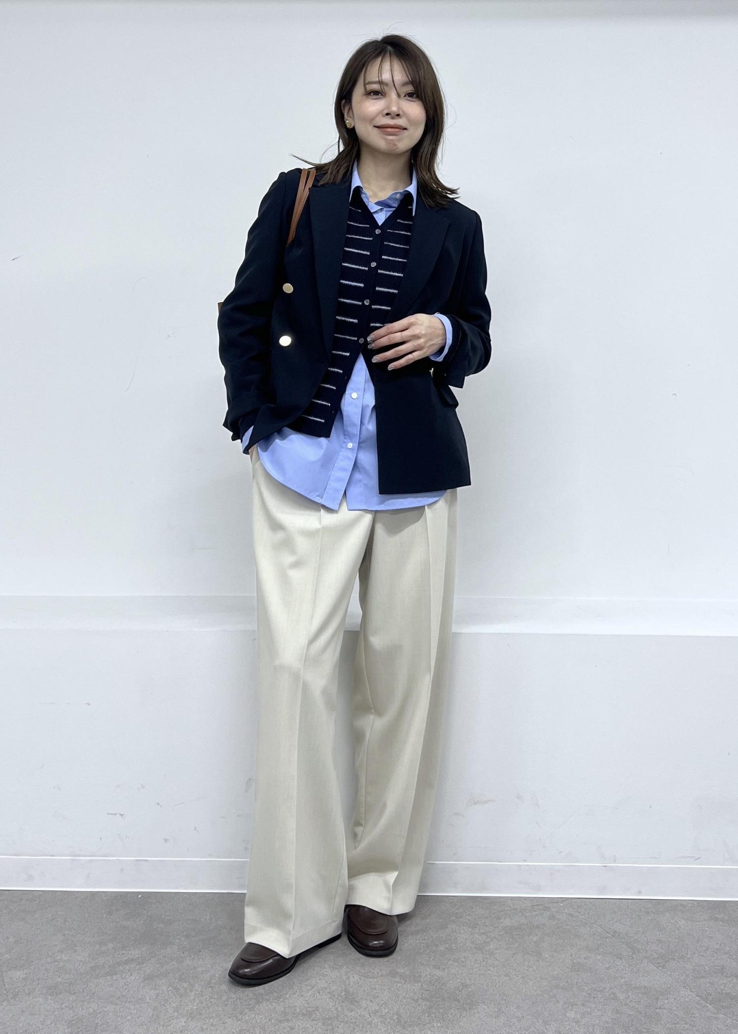 かっちり感のあるネイビーのジャケットは、シャツとカーディガンに合わせえ春のお出かけコーデに。