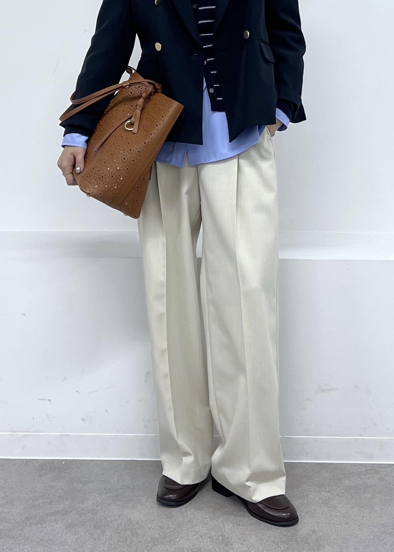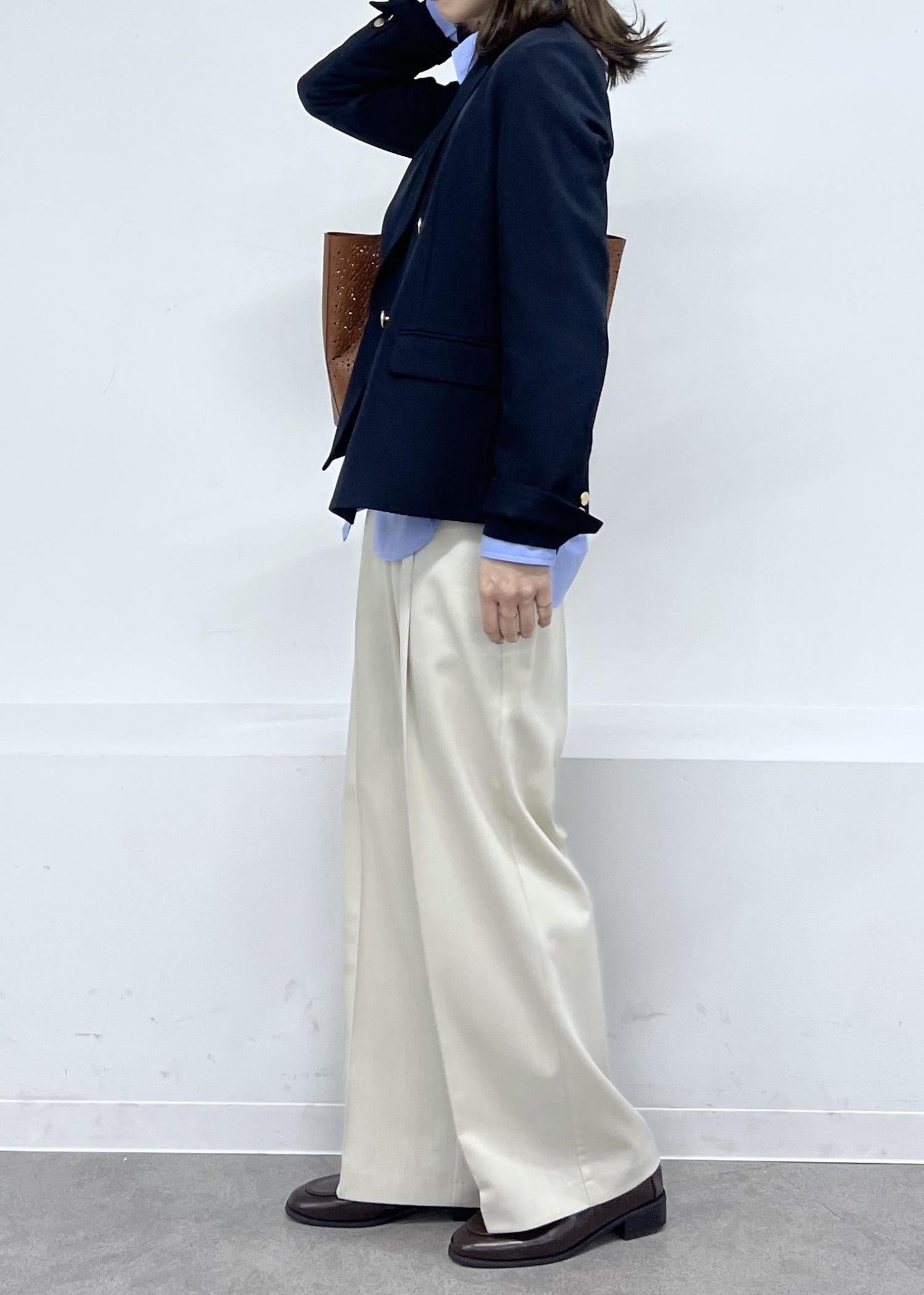 爽やかなブルーシャツをインして顔周りも軽く見せる春スタイルにしました。