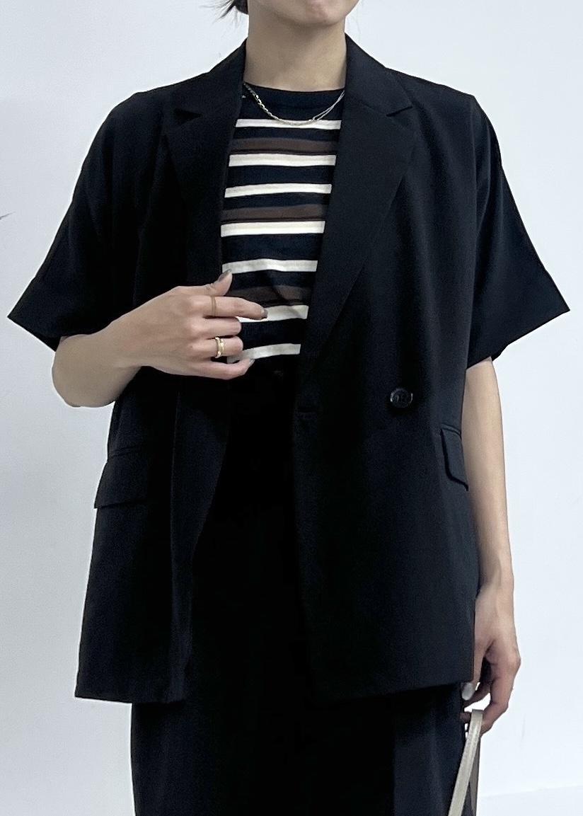 ジャケットとハーフパンツのセットアップスタイルは、大人のカジュアルコーデにおすすめ。