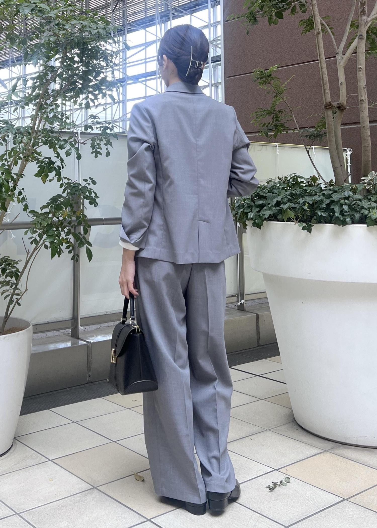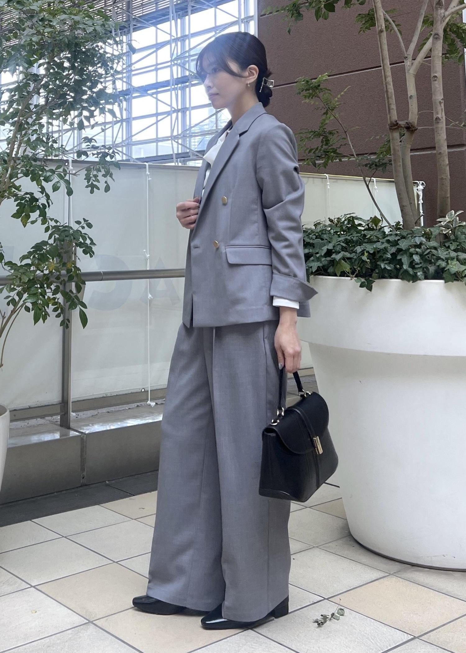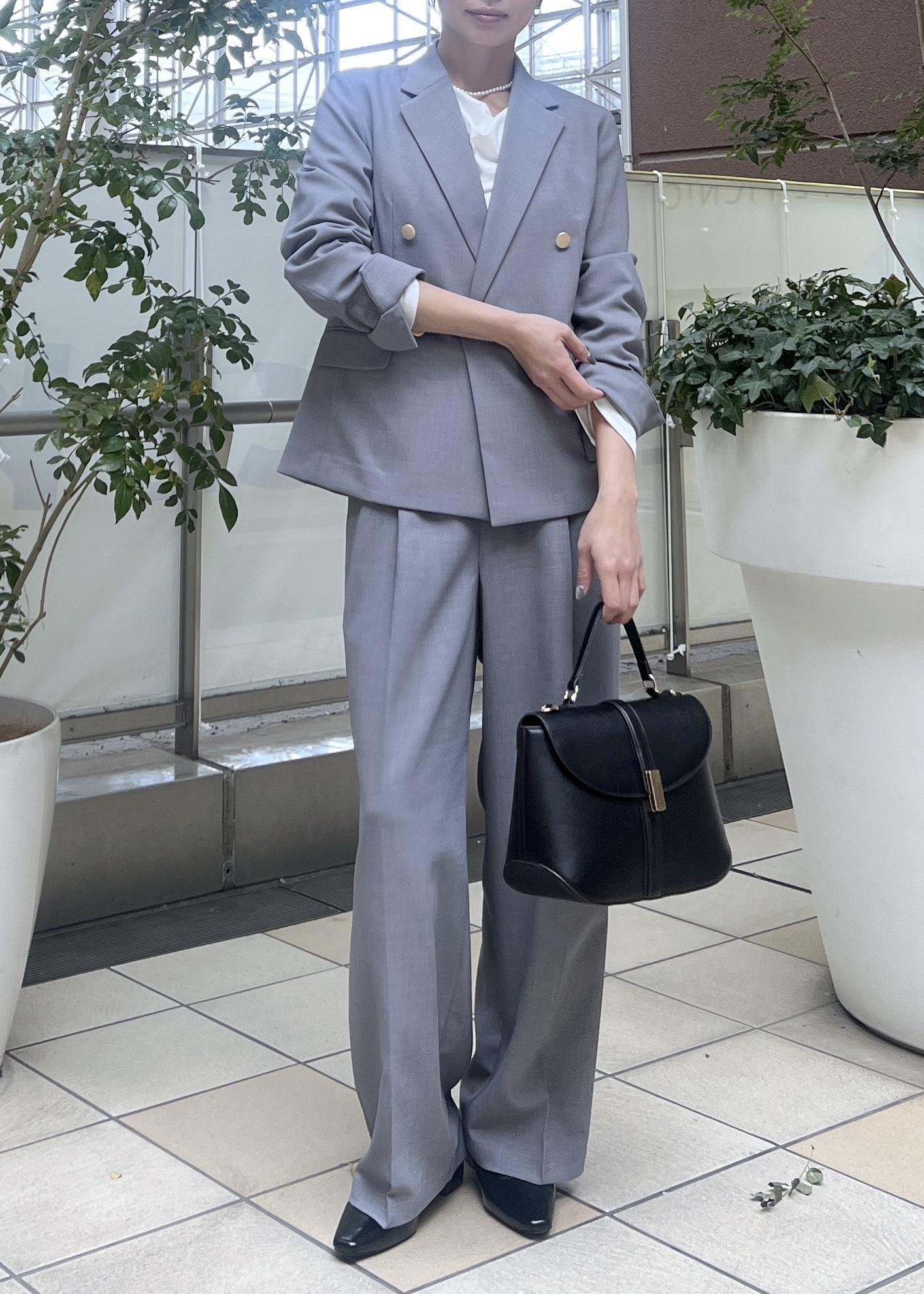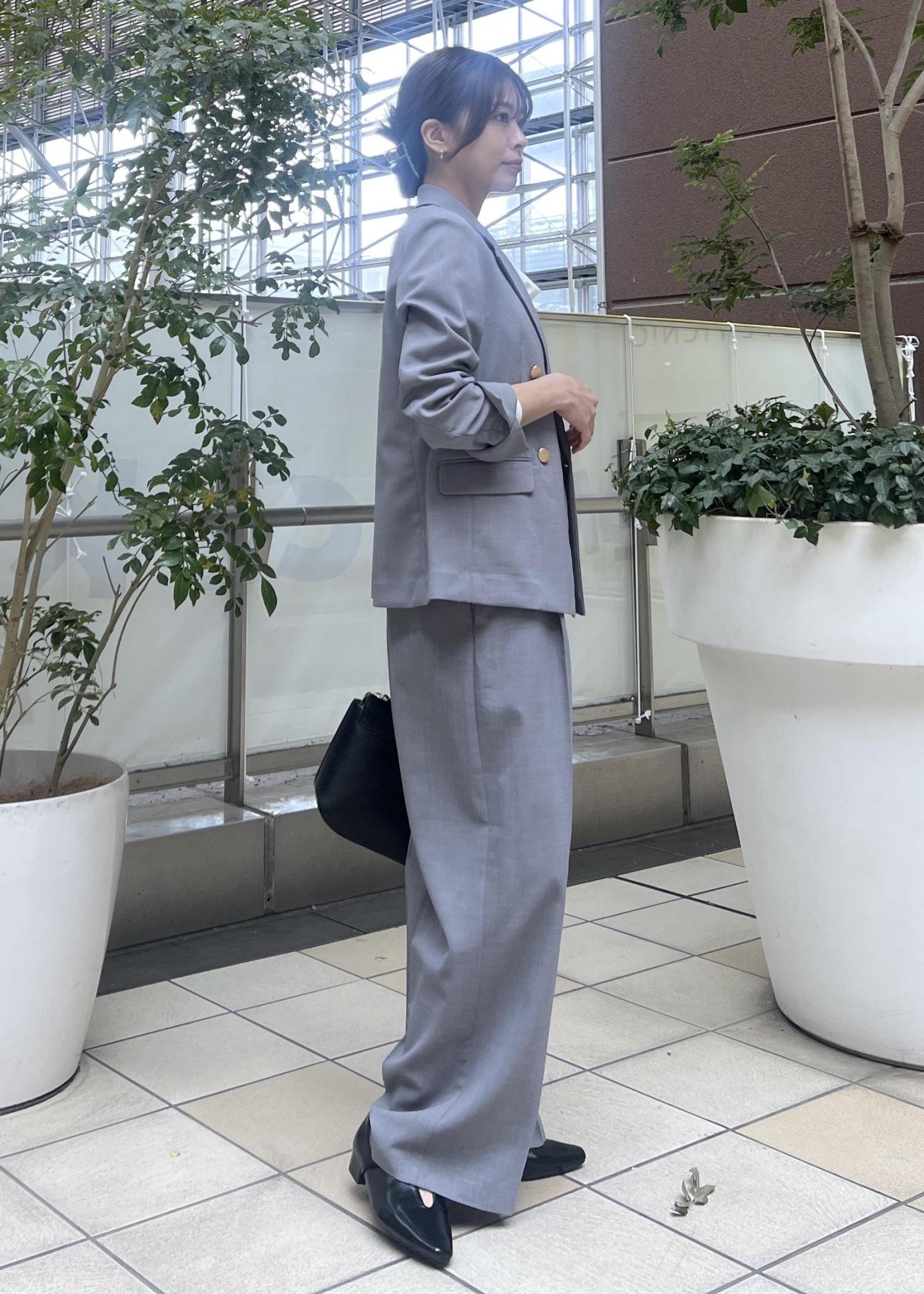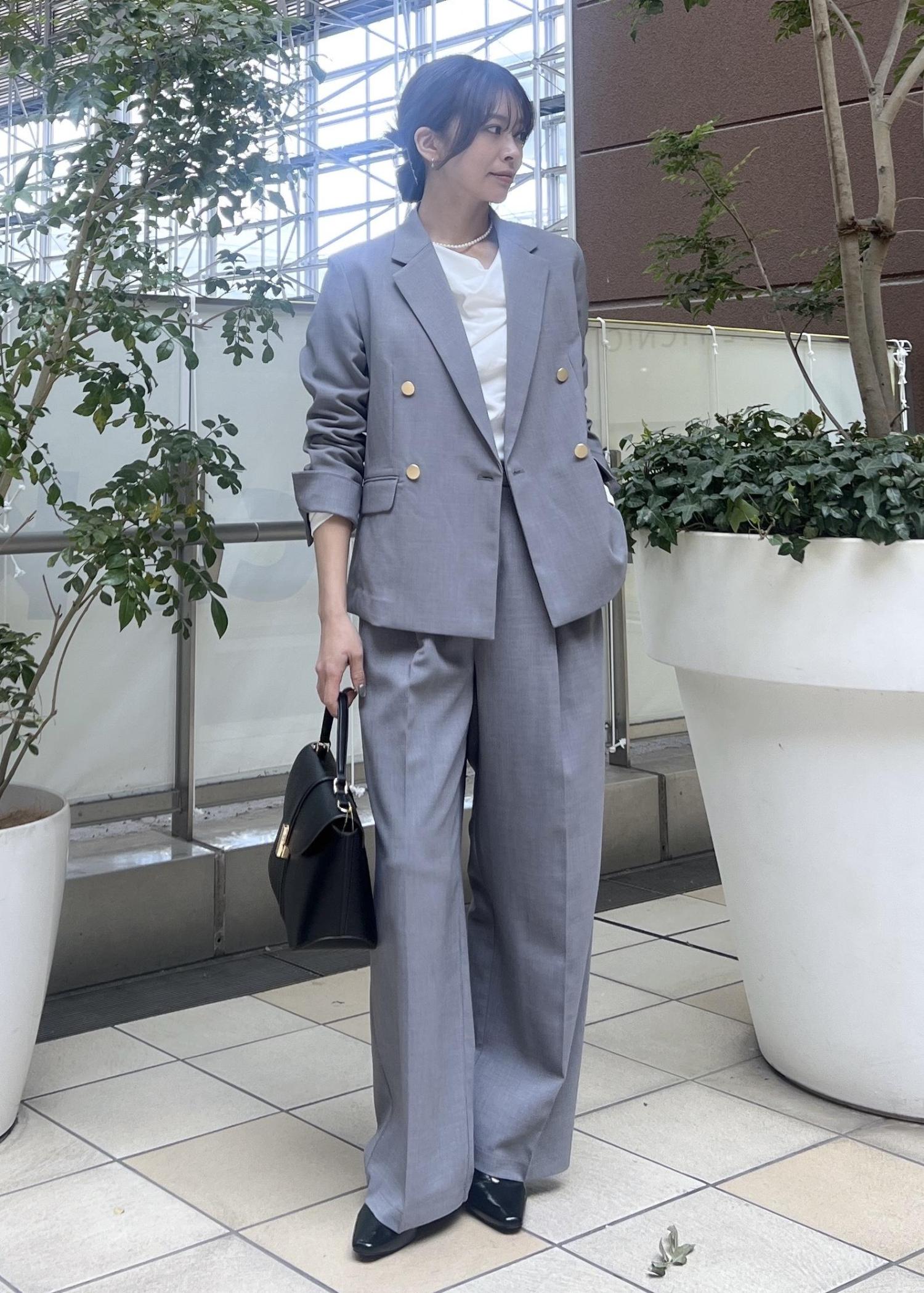 春夏におすすめのグレーのセットアップは、お仕事にも着られるので通勤スタイルにおすすめ。