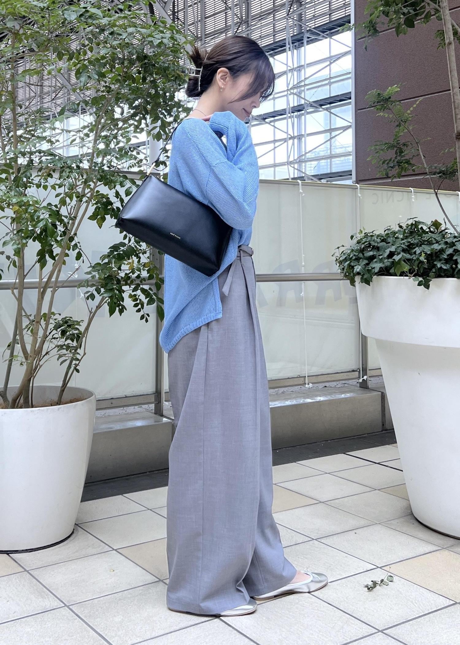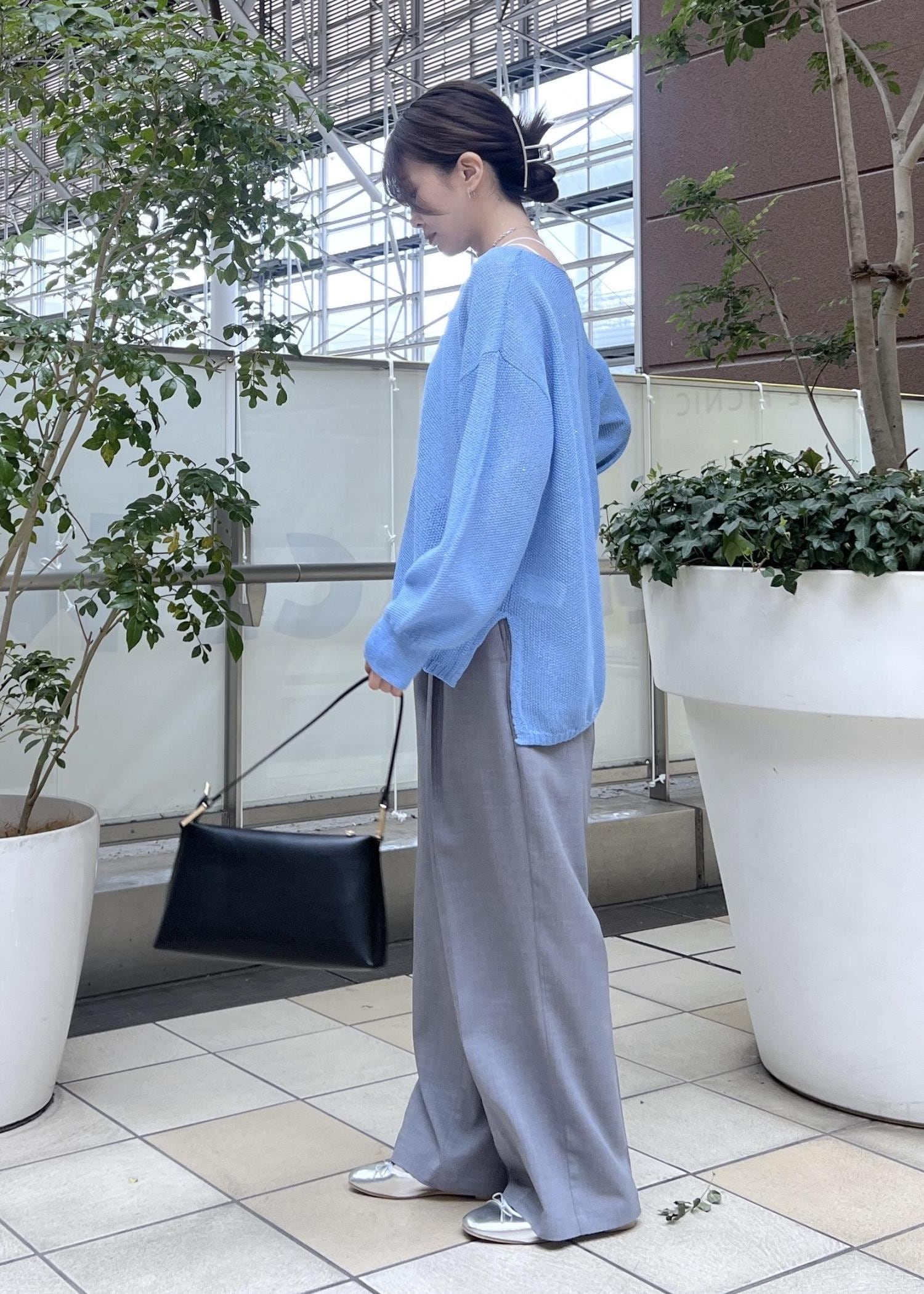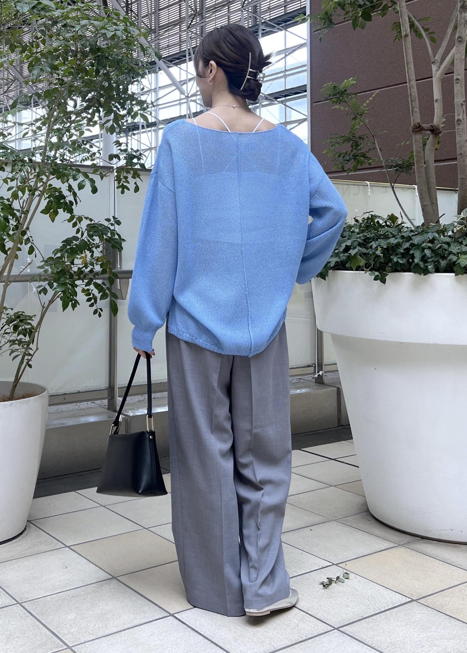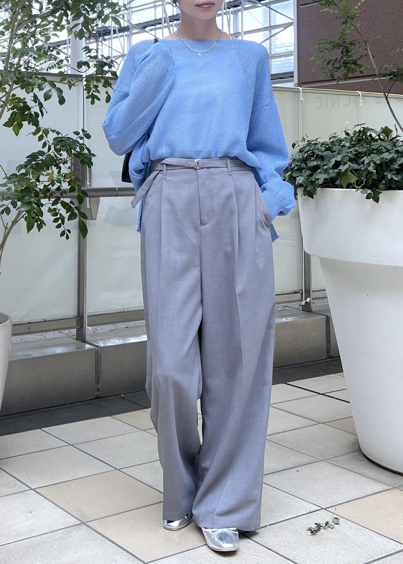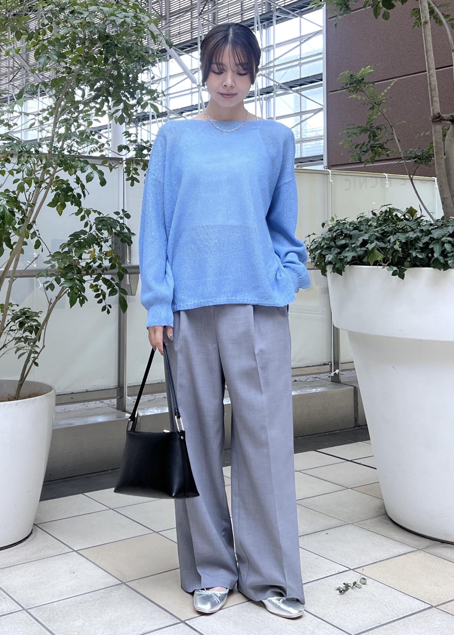 軽いメッシュ生地のニットは、爽やかブルーの春夏コーデにおすすめ。