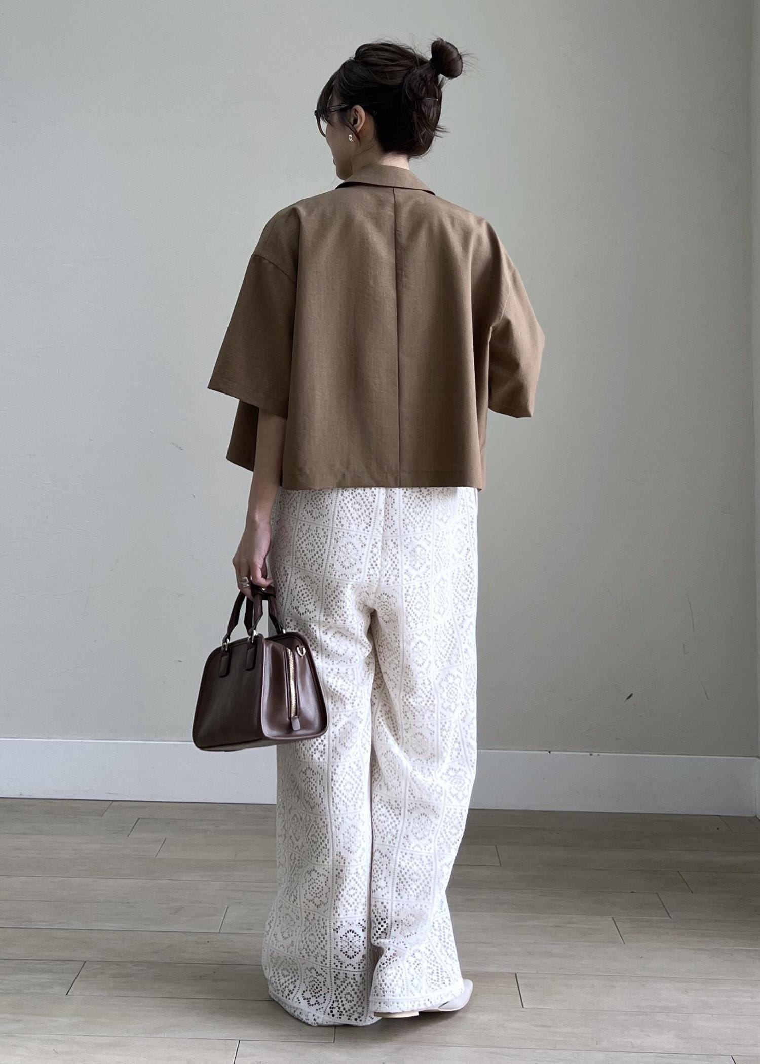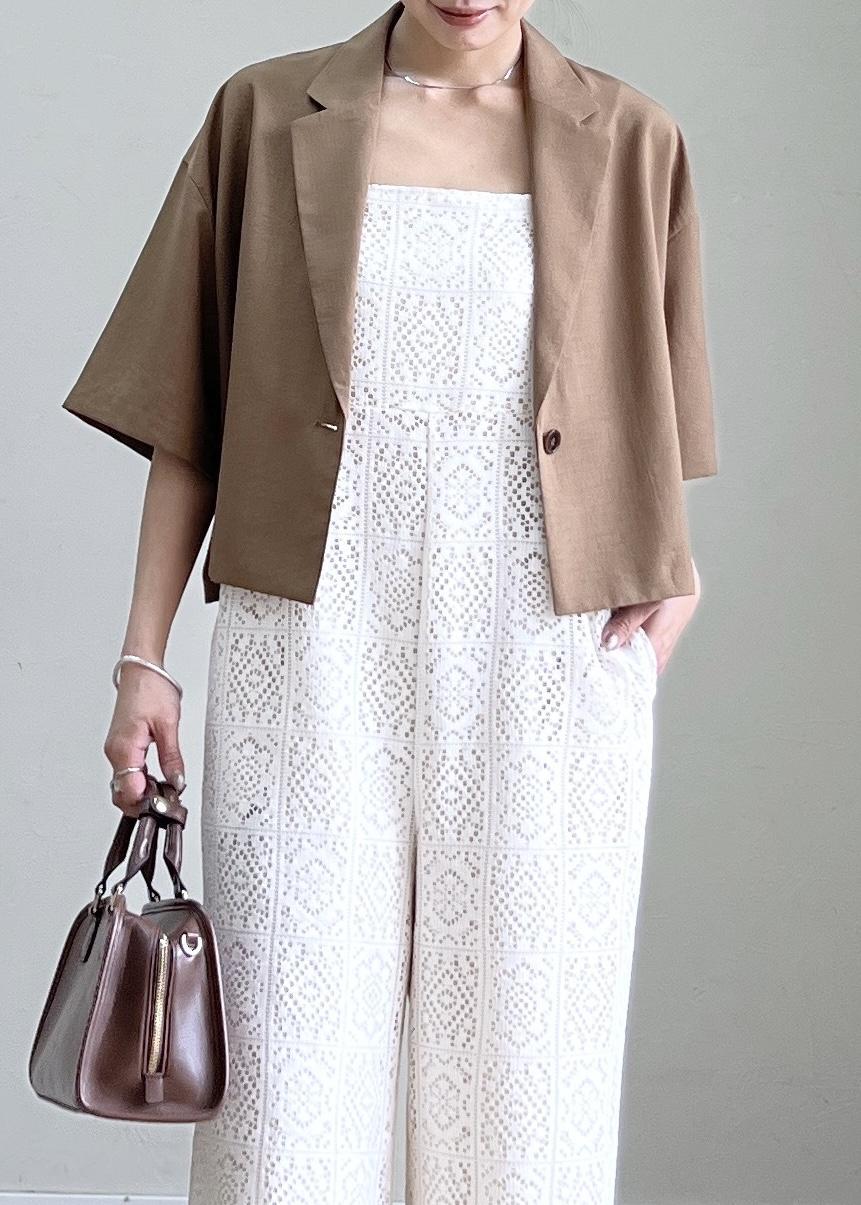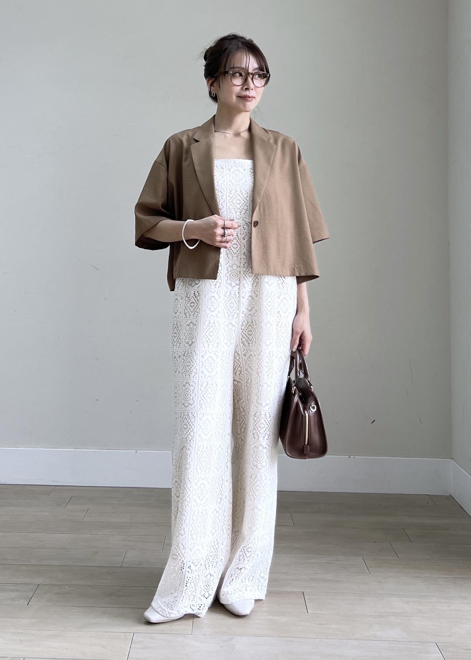 短丈のジャケットはオールインワンに羽織って、大人カジュアルな春夏コーデに。