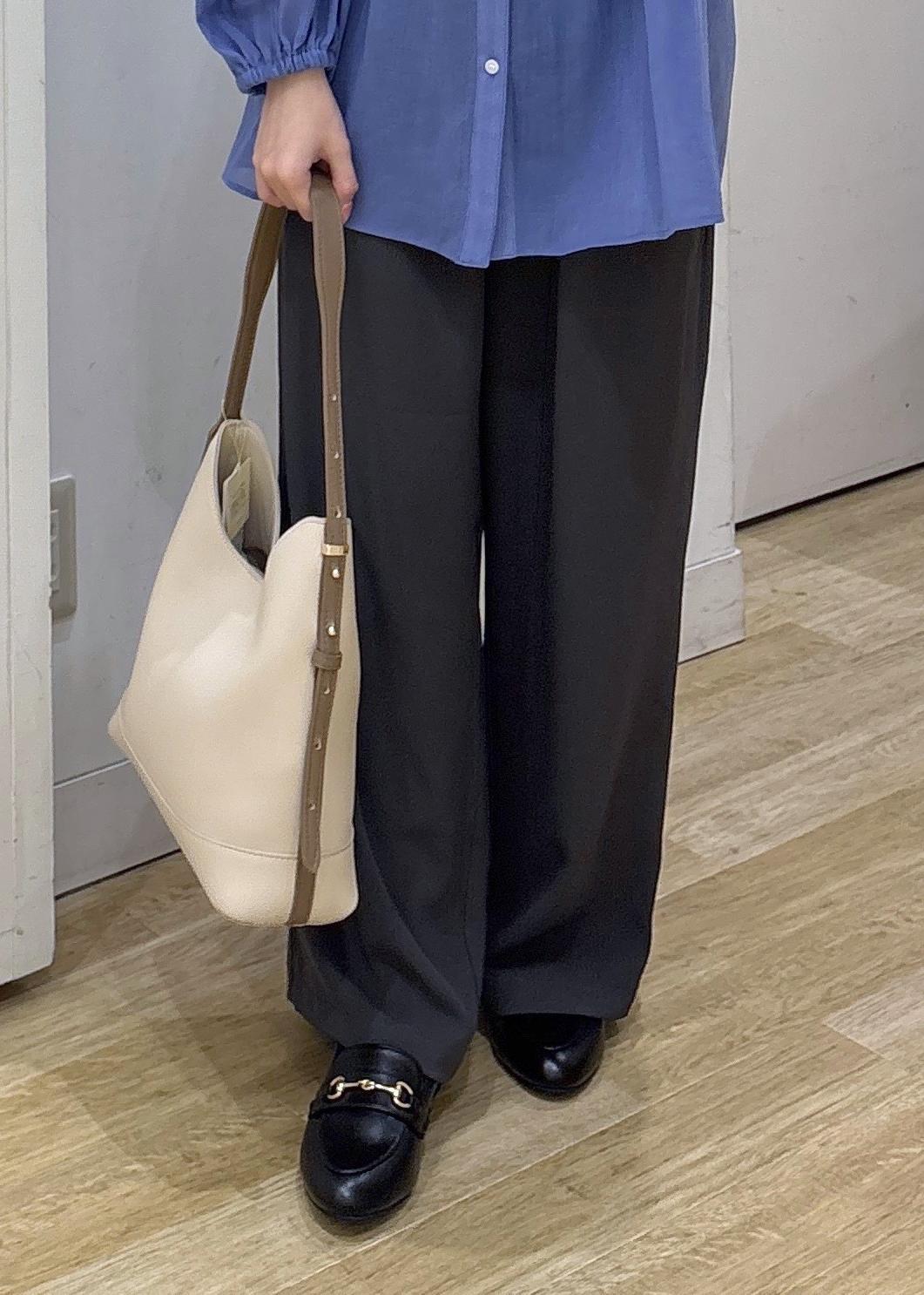 スタンドフリルの綿シャツに、ゆったりめなパンツを合わせてキレイめカジュアルコーデにしました!