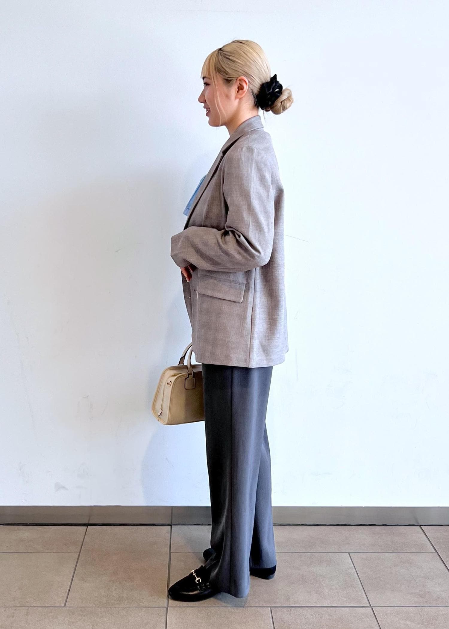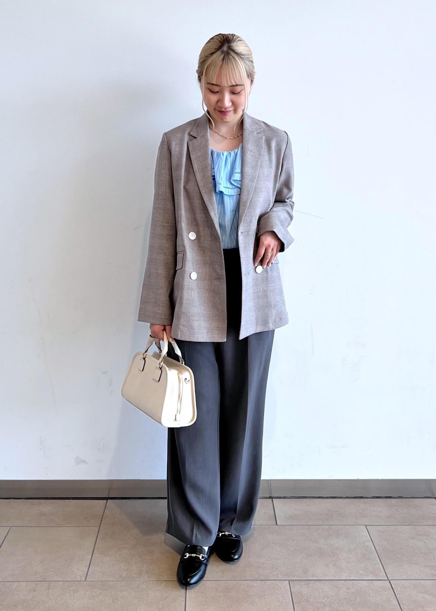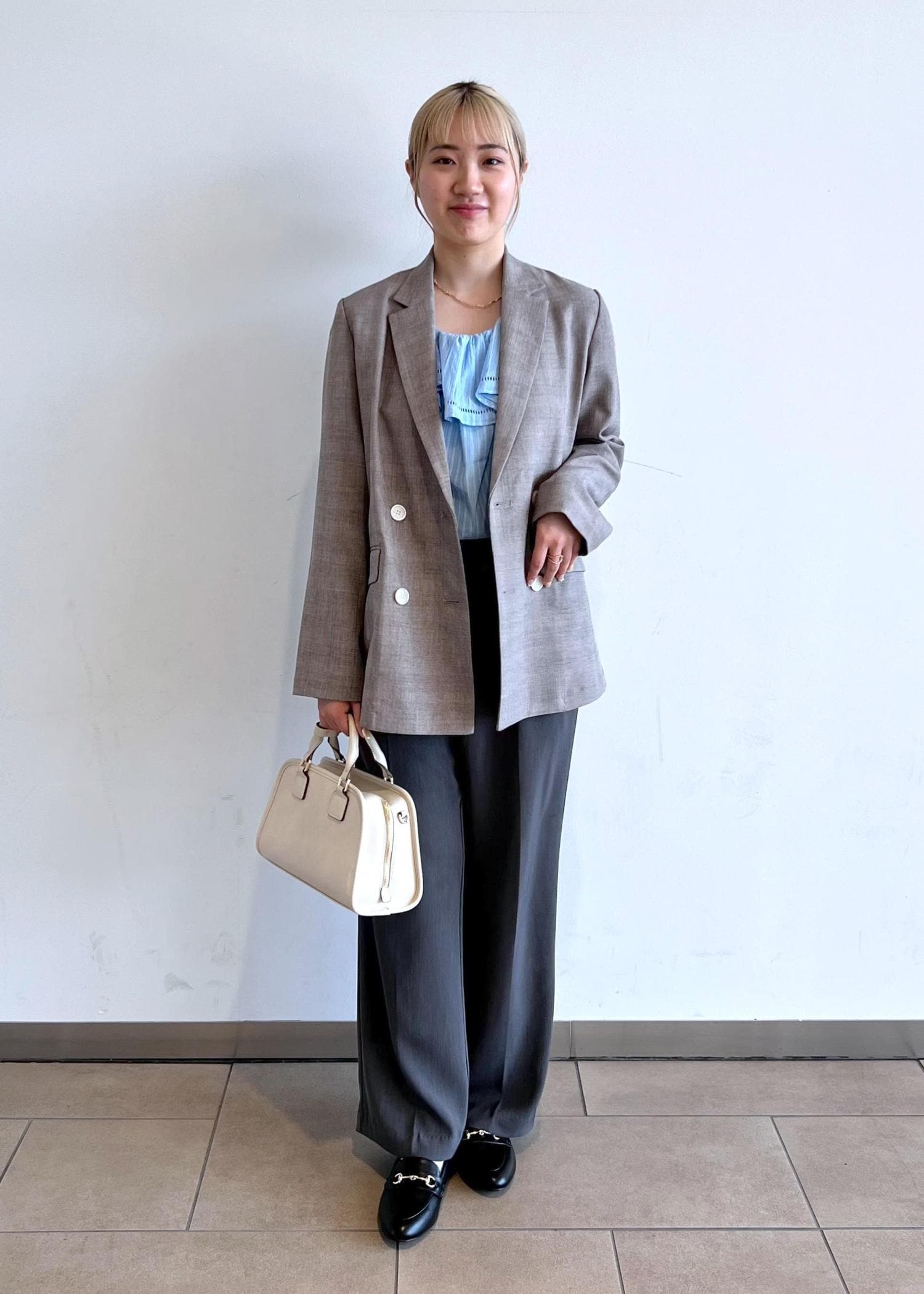 ジャケットで大人っぽい印象にしつつ水色のブラウスを合わせることで女性らしいコーディネートにしました!