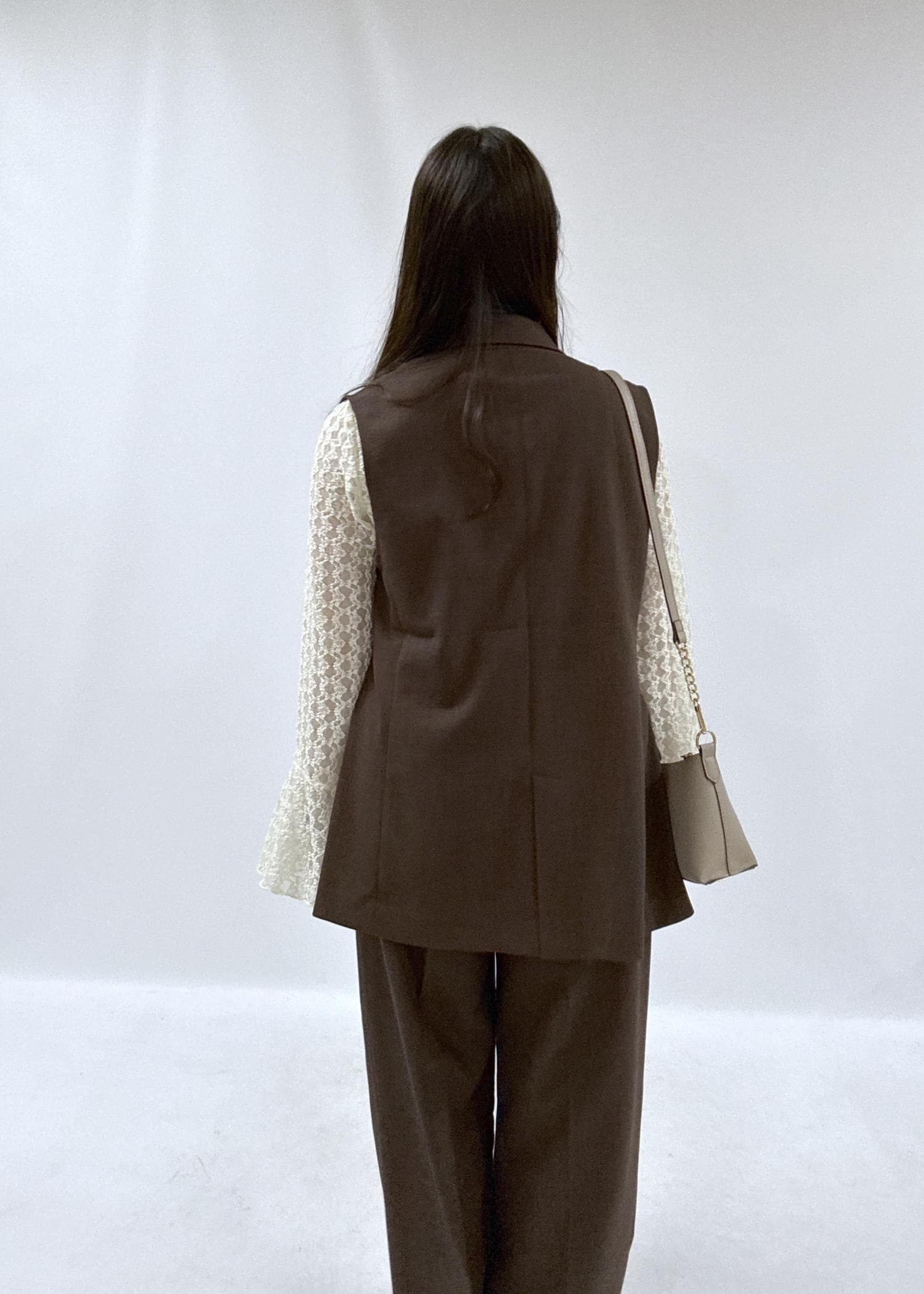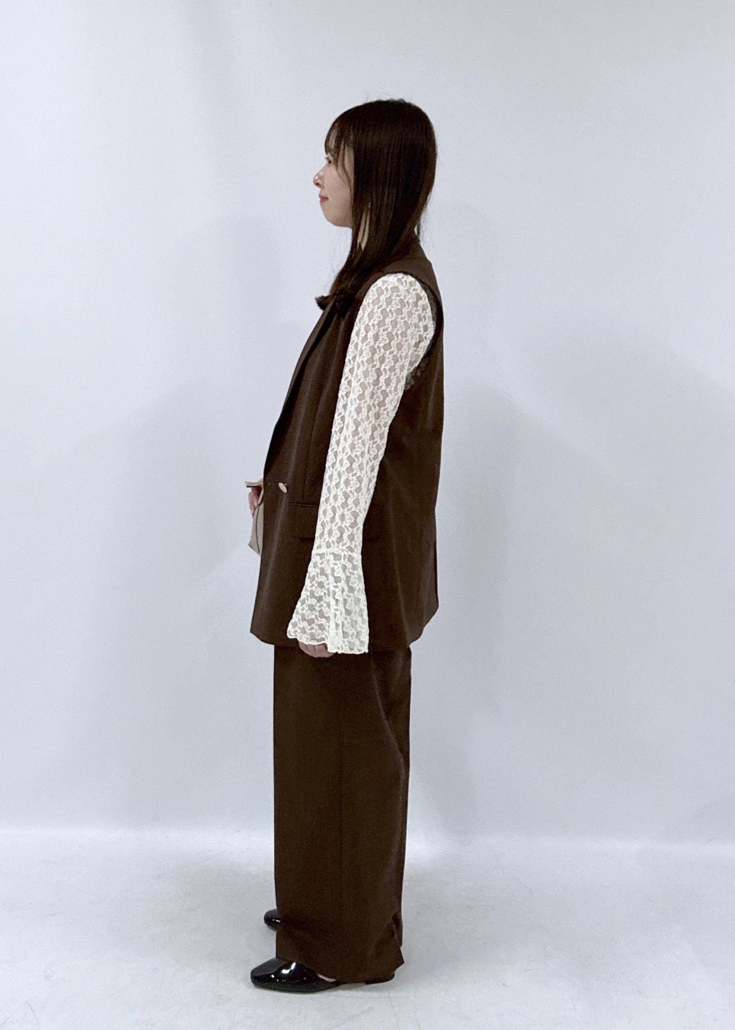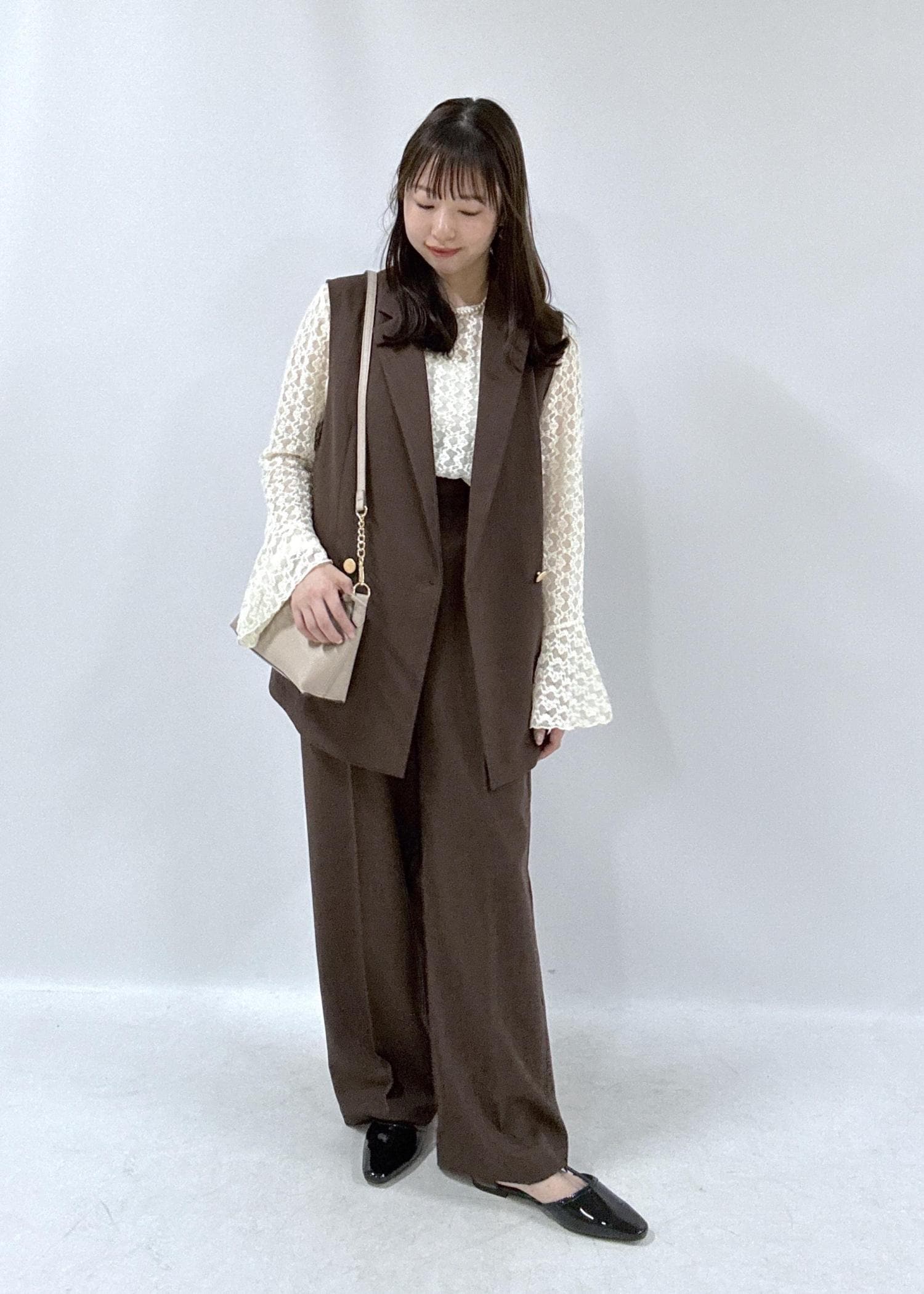 大人っぽく上品なブラウンカラーのセットアップコーデです。