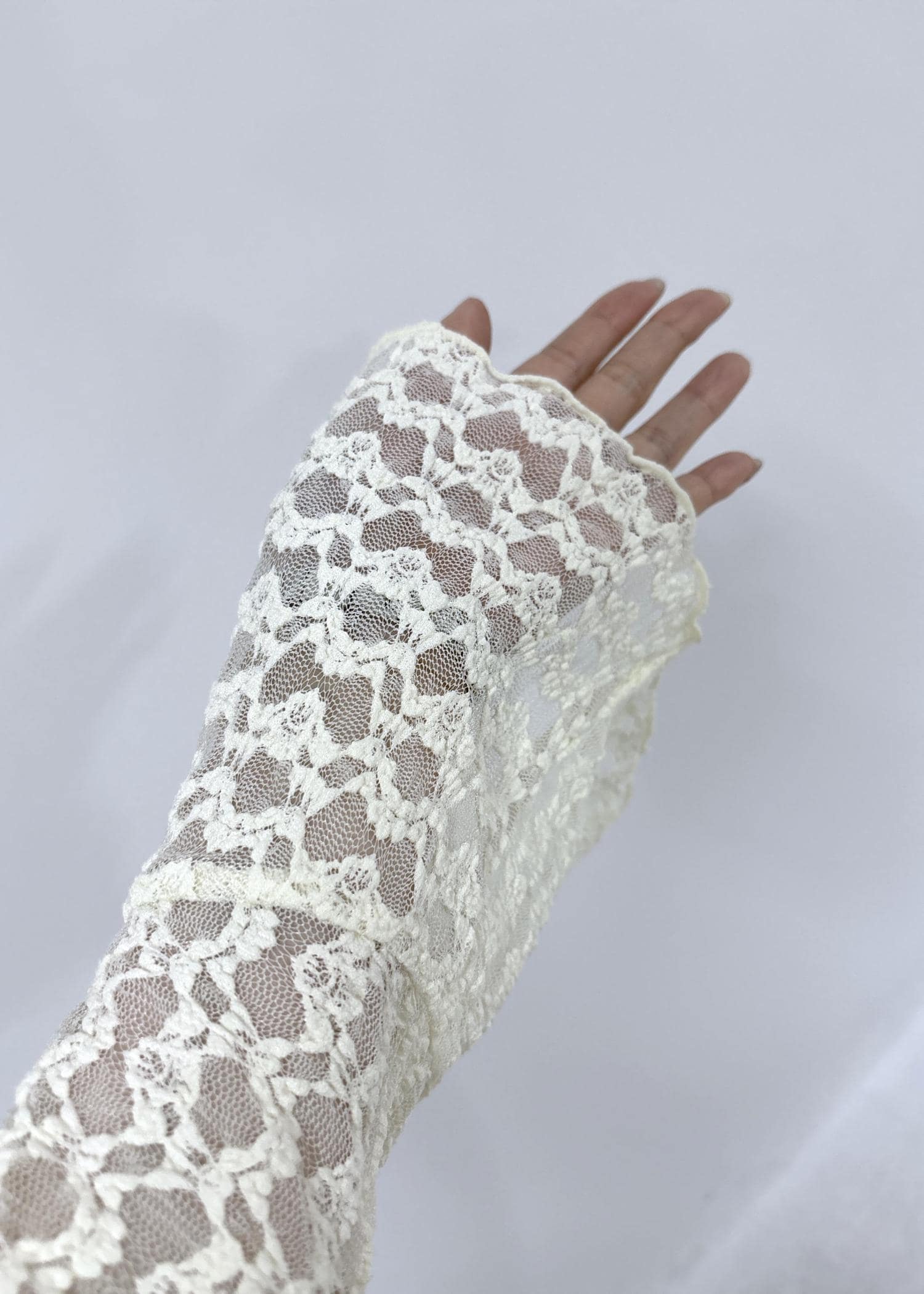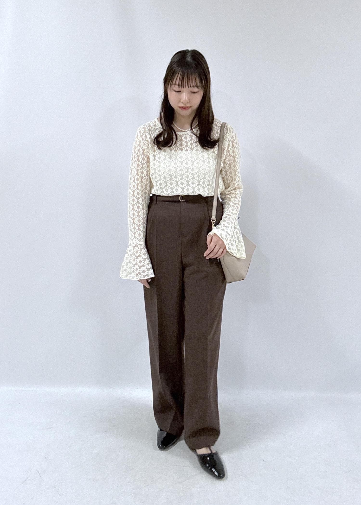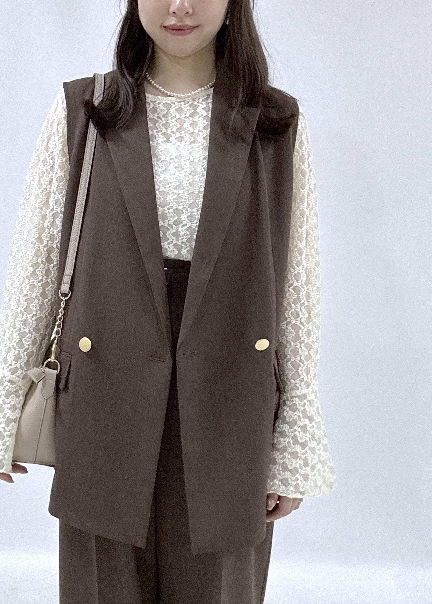 春先にも着用しやすいように、中は明るく軽やかな白のレーストップスを合わせてみました。