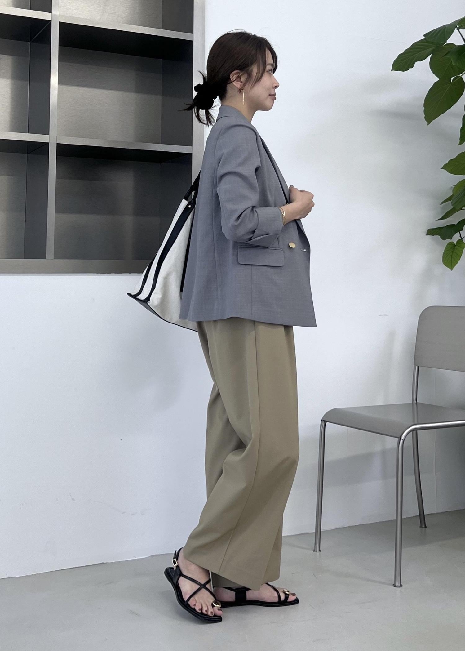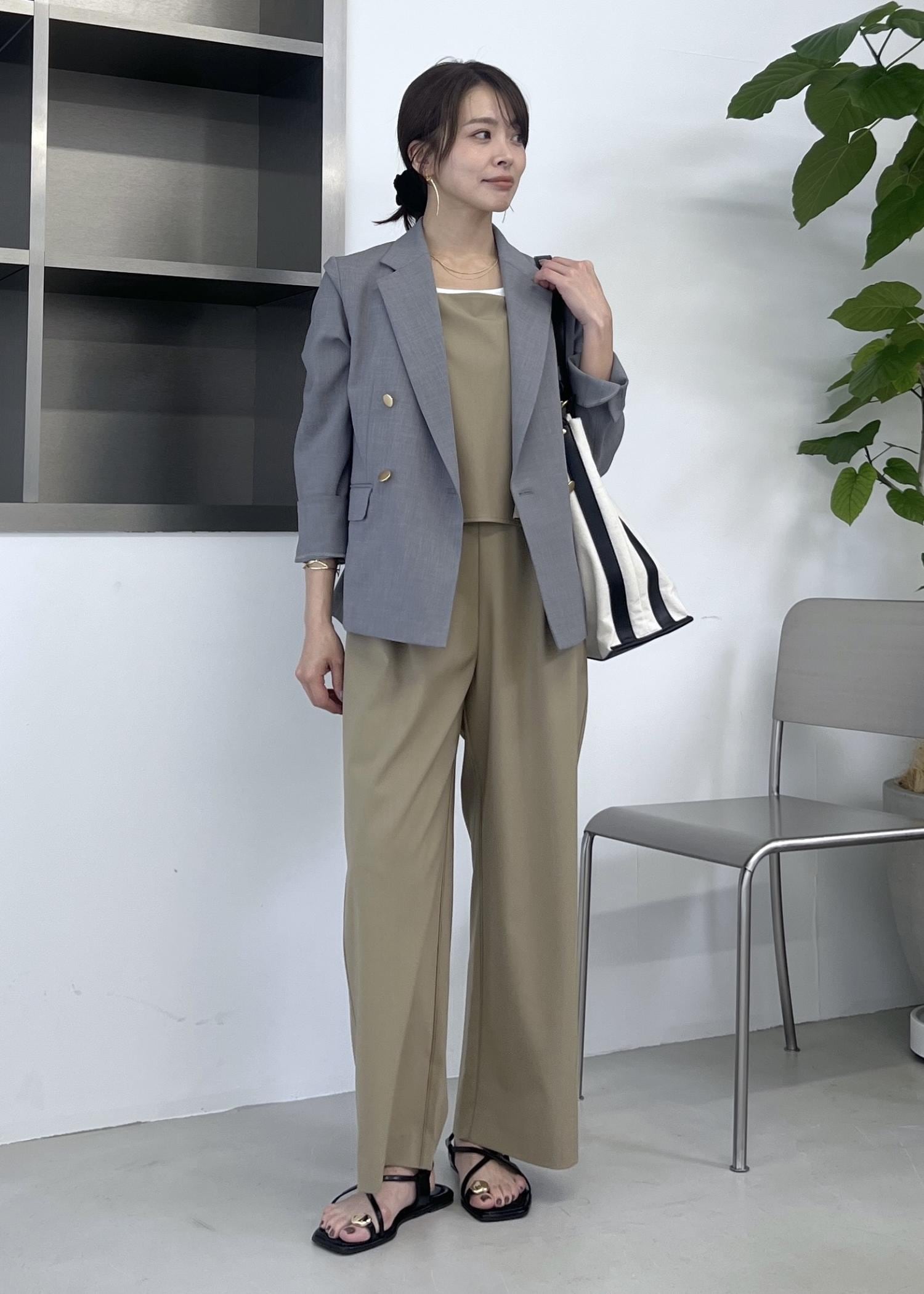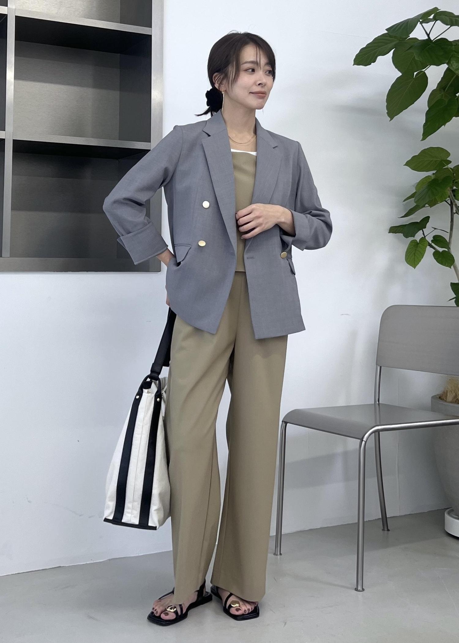 大人カジュアルに着やすいさらっとした肌触りのジャケットは、オールインワンに羽織って春夏コーデにも。