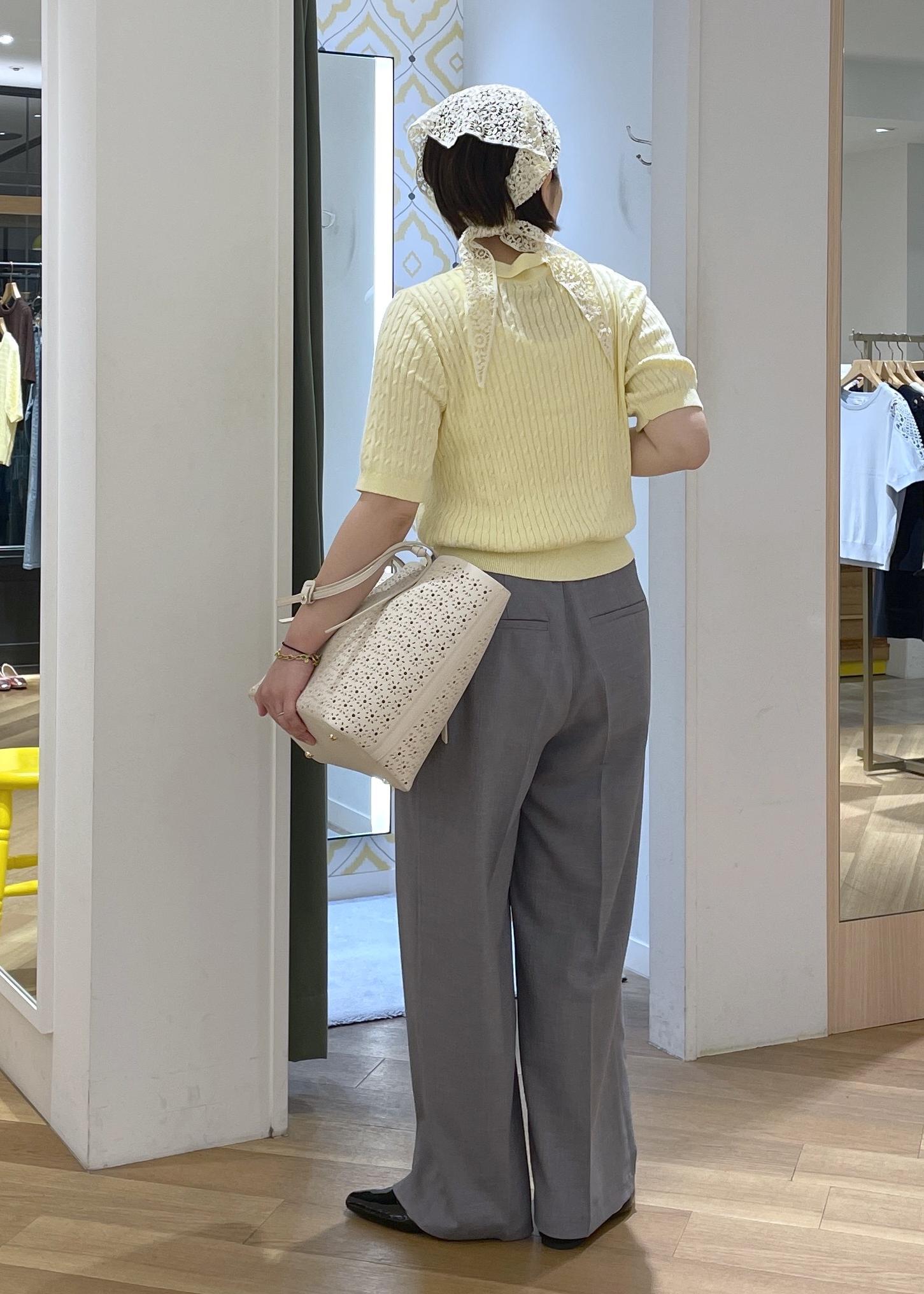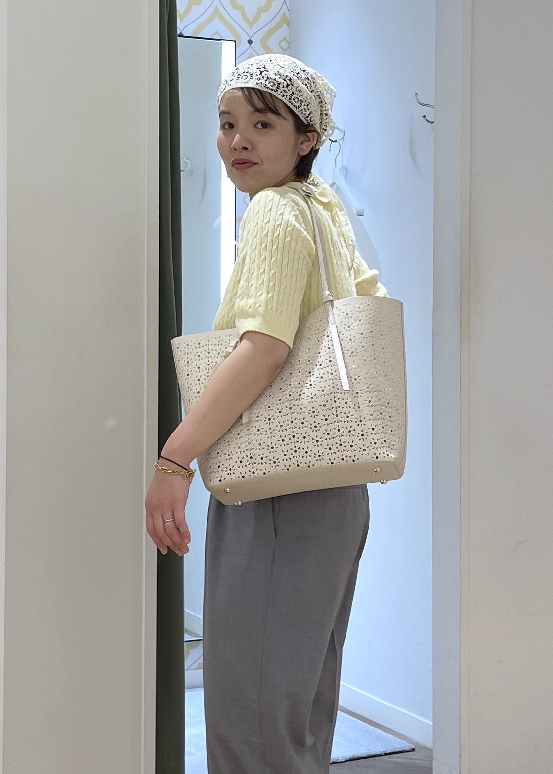 すっきりとしたラインのスタイルなので、バッグは大きめのパンチングレースのトートバッグを合わせて、バランスを取りつつ軽やかさもある印象に◎