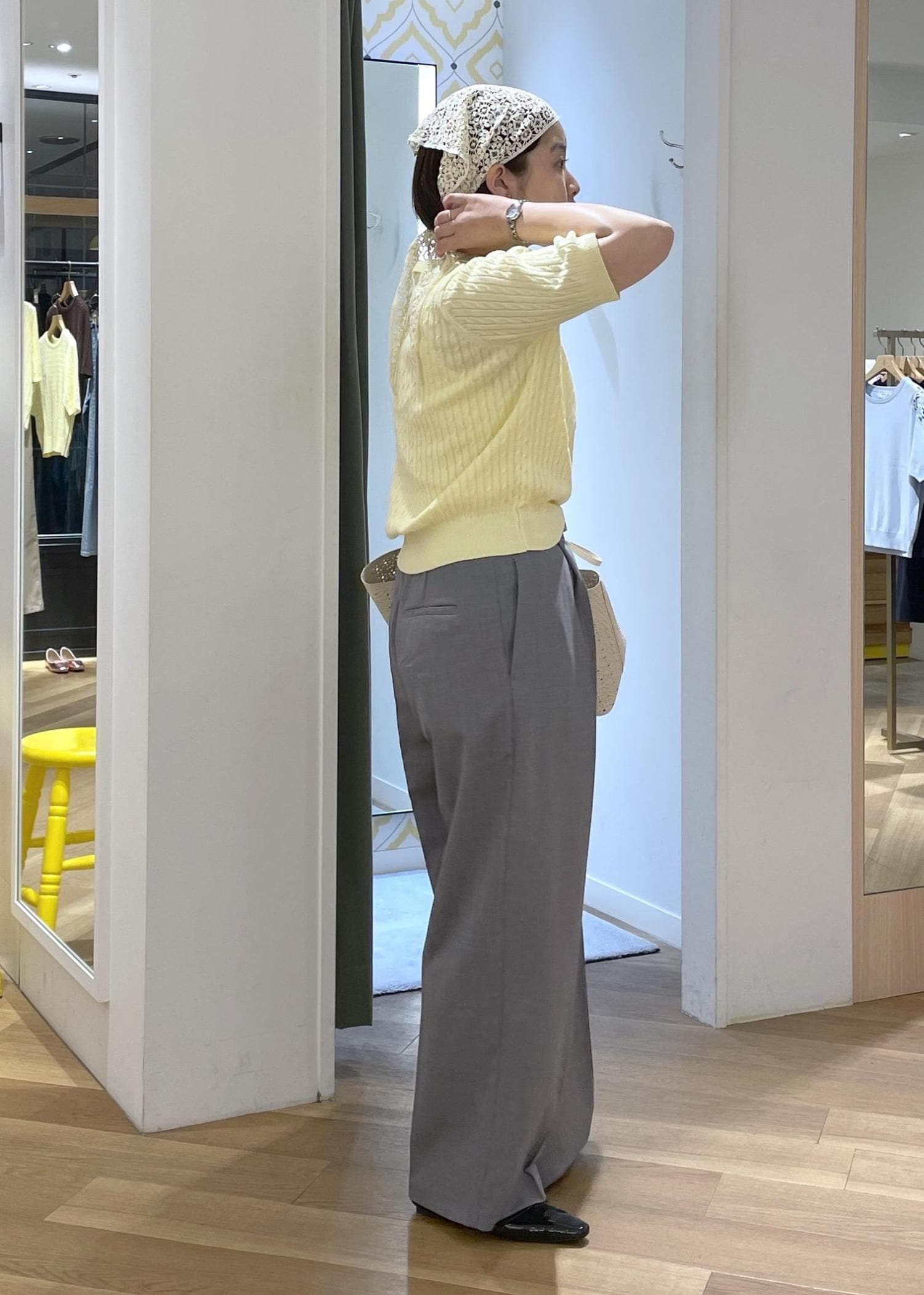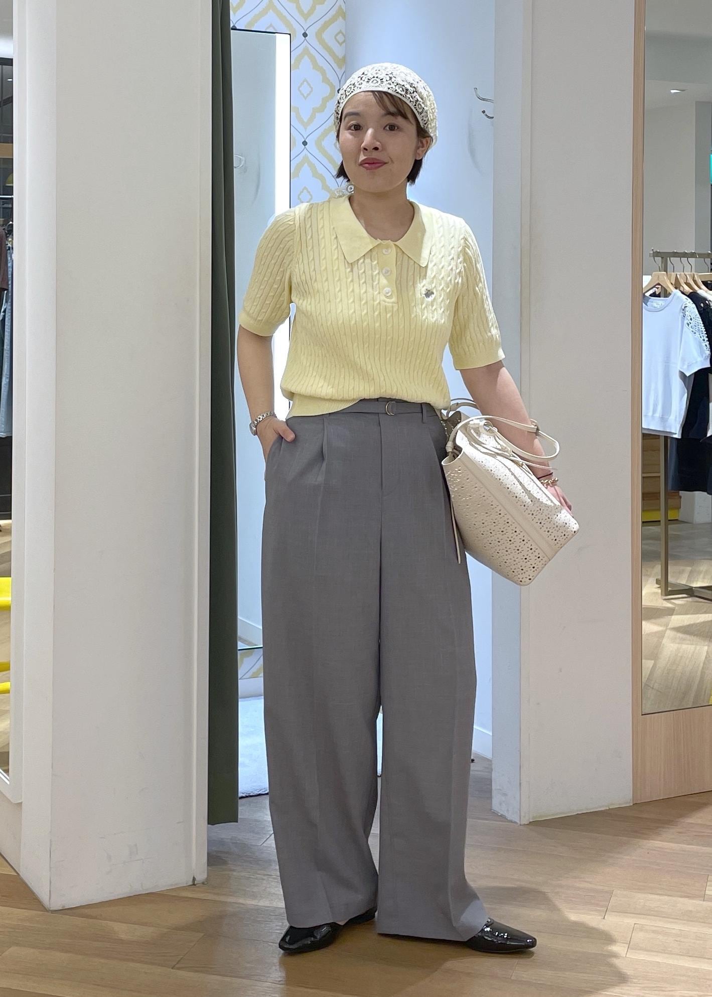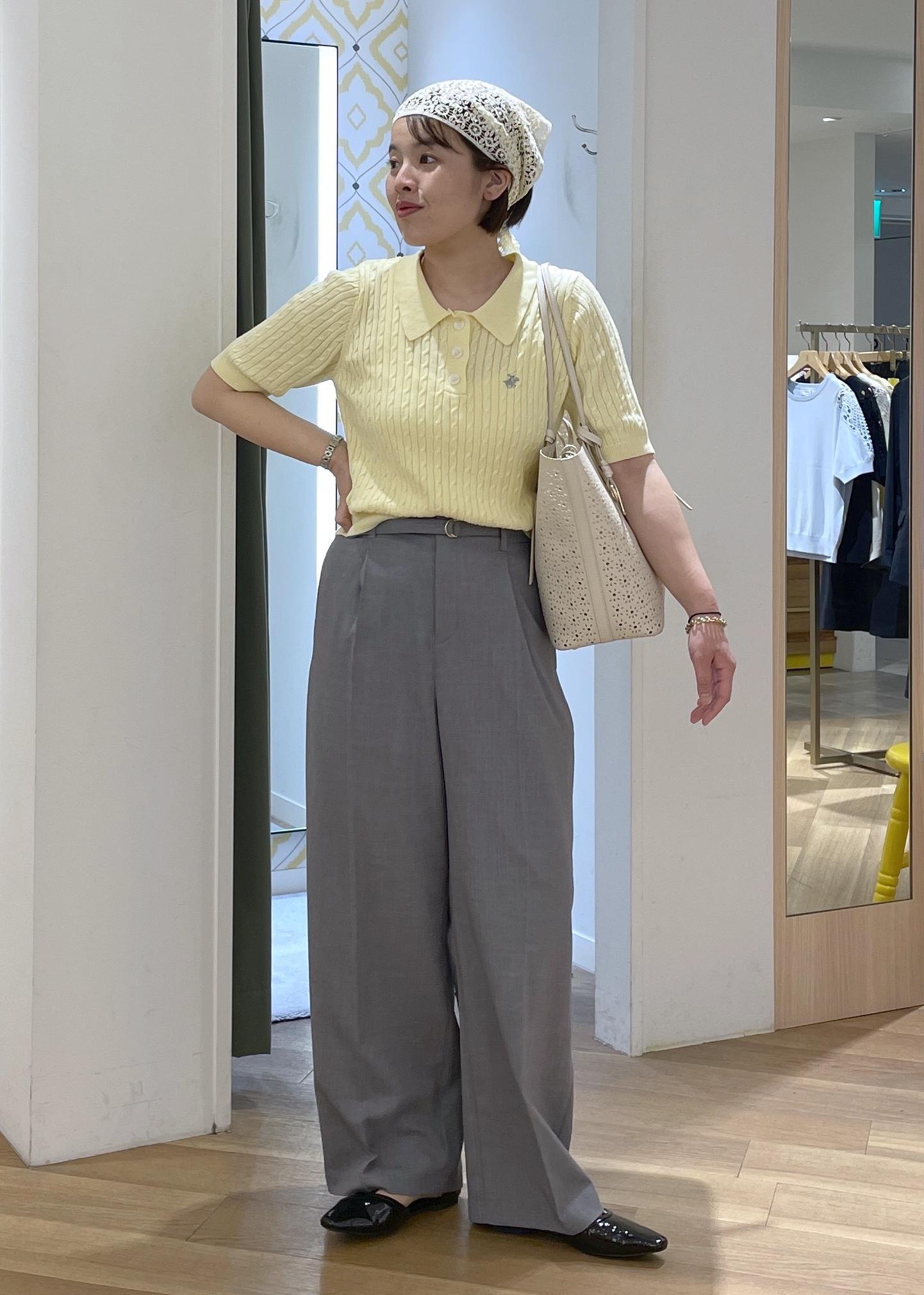トレンド感あるイエローのポロニットにグレーのワイドパンツを合わせた、大人カジュアルコーデです!