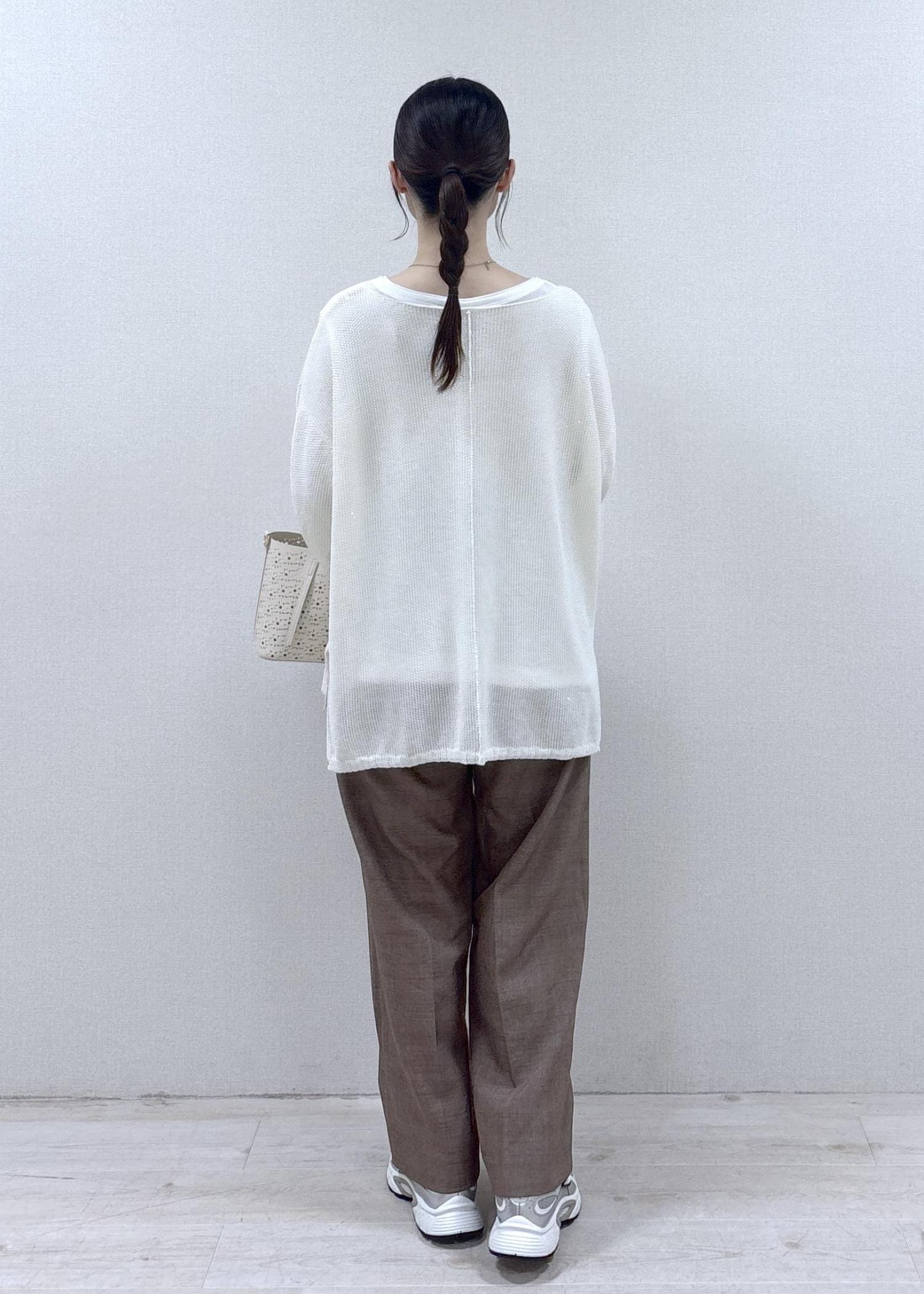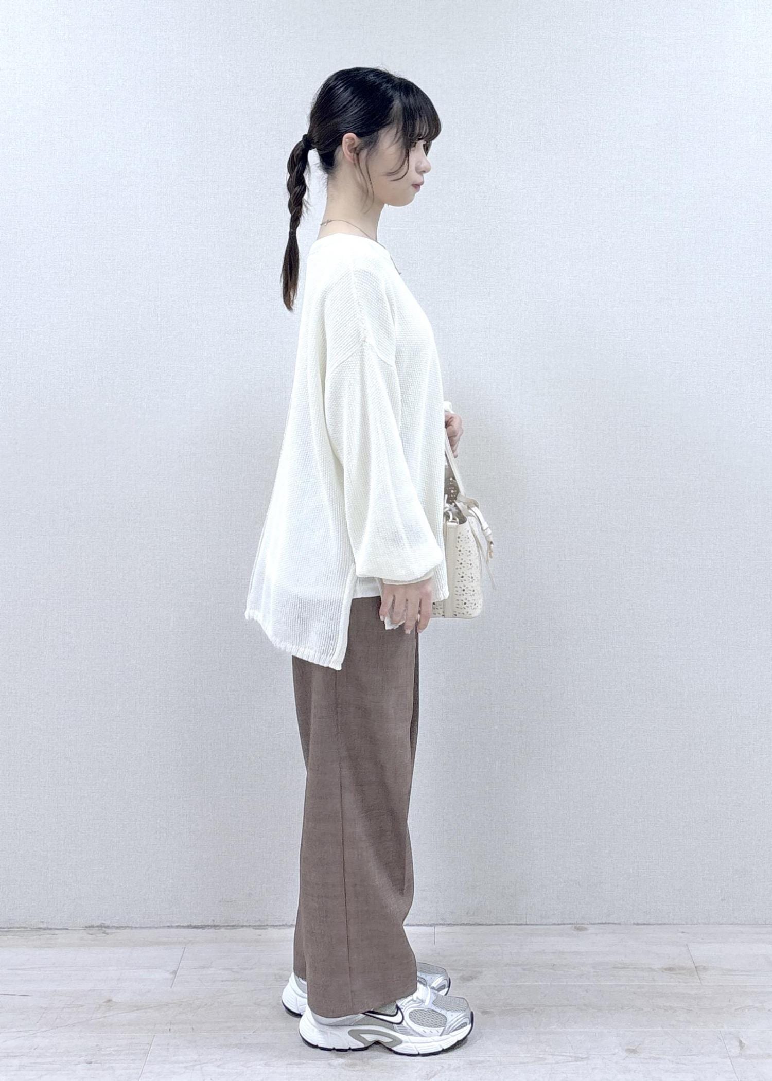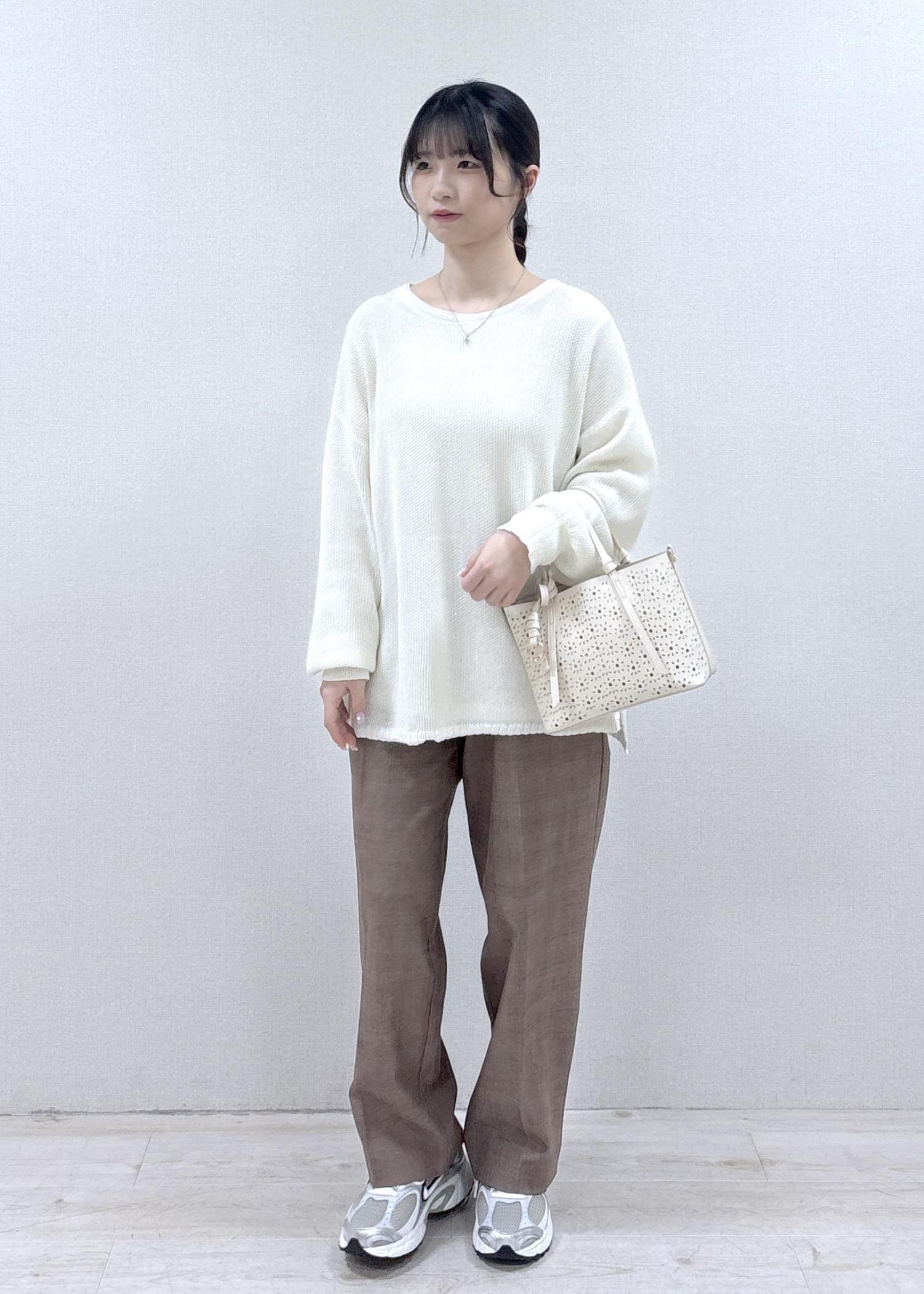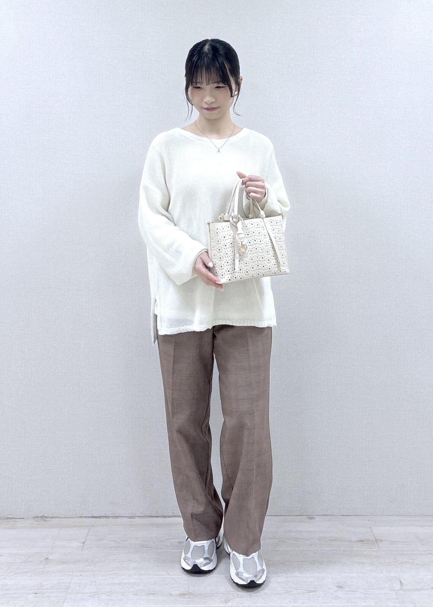 さり気ないキラキラが可愛いデイリー使いしやすいコーディネートです。どのアイテムも軽さのある素材感で、季節を選ばない色味なので、春夏〜秋もさらっと楽に着ていただけます。