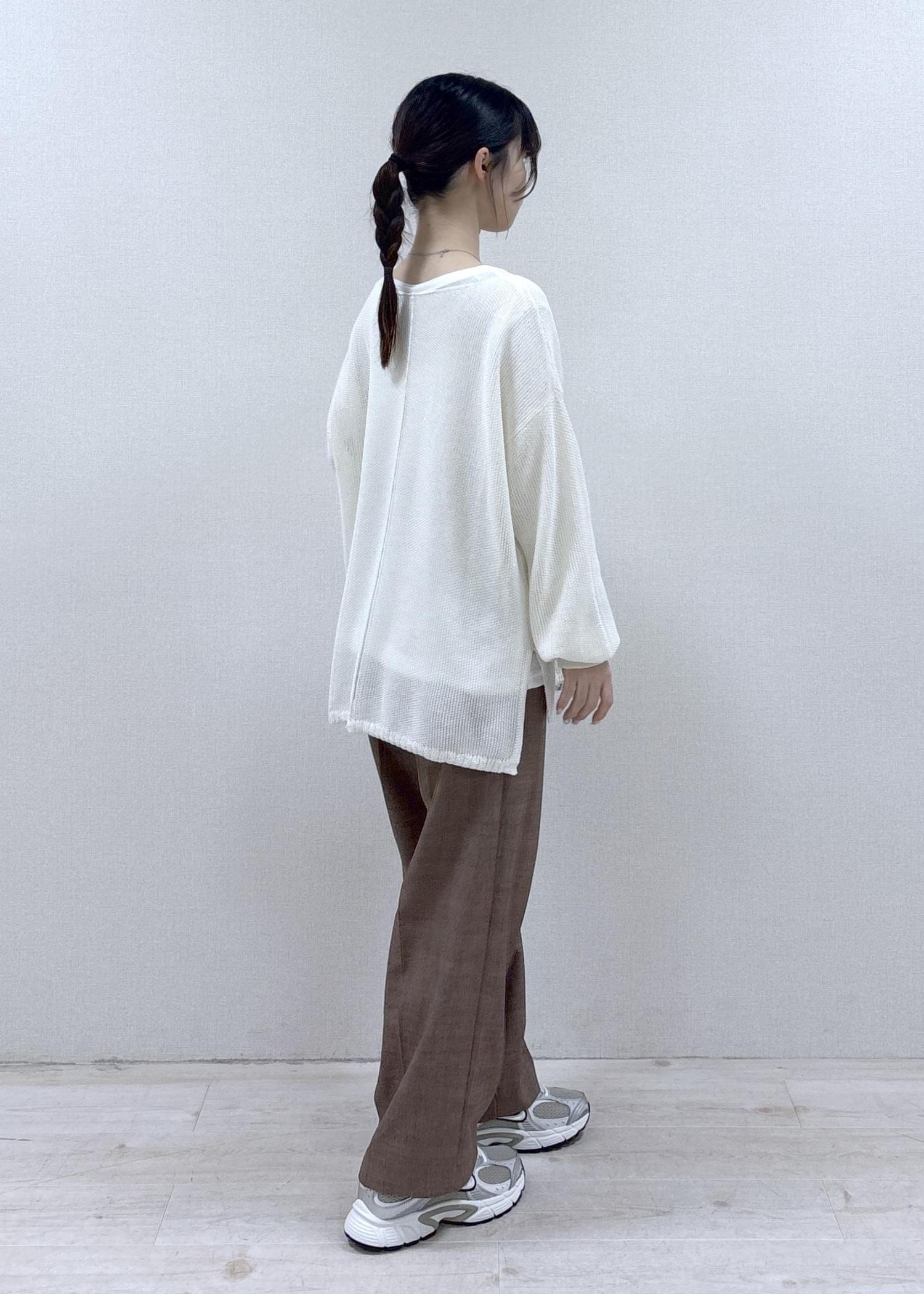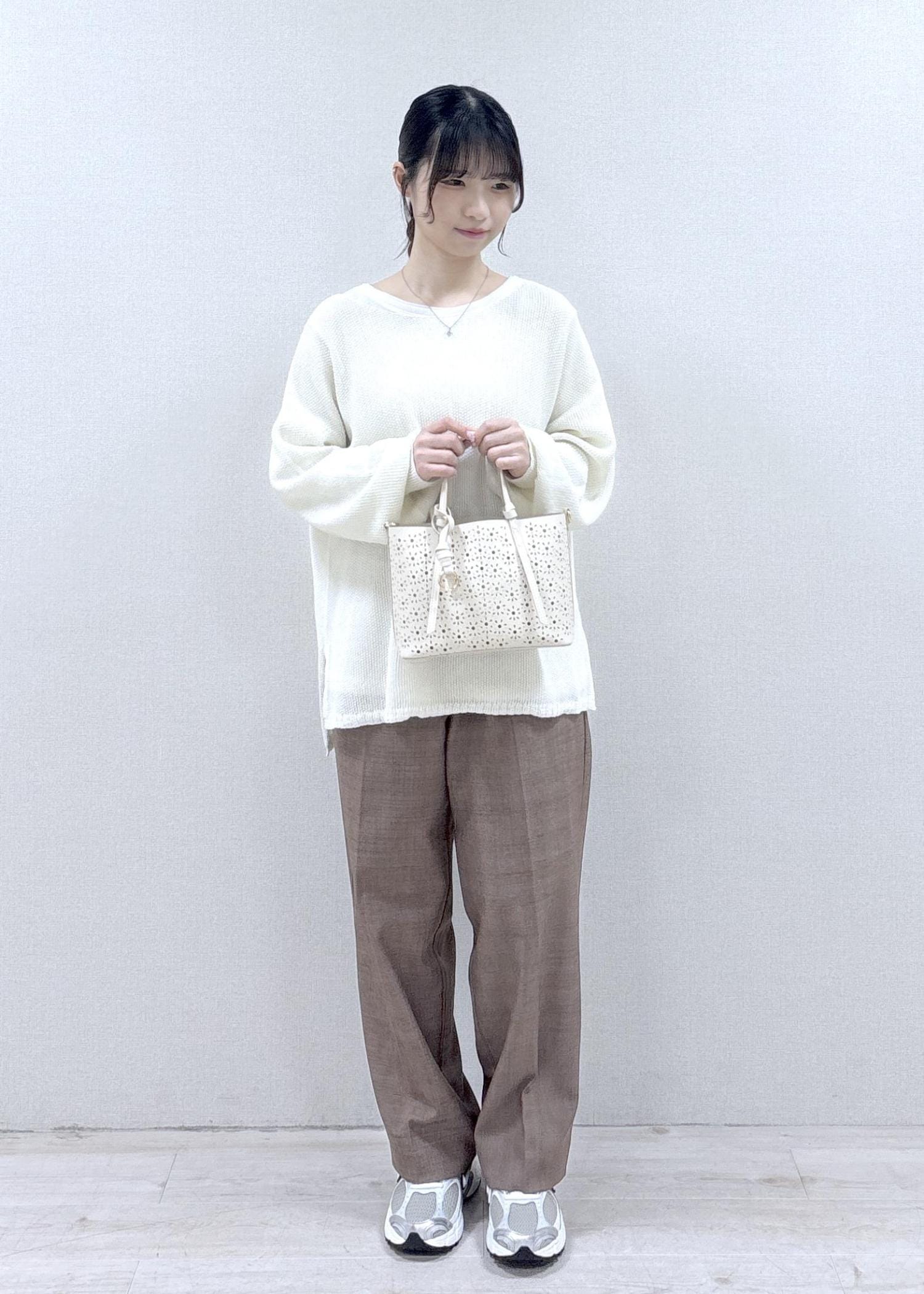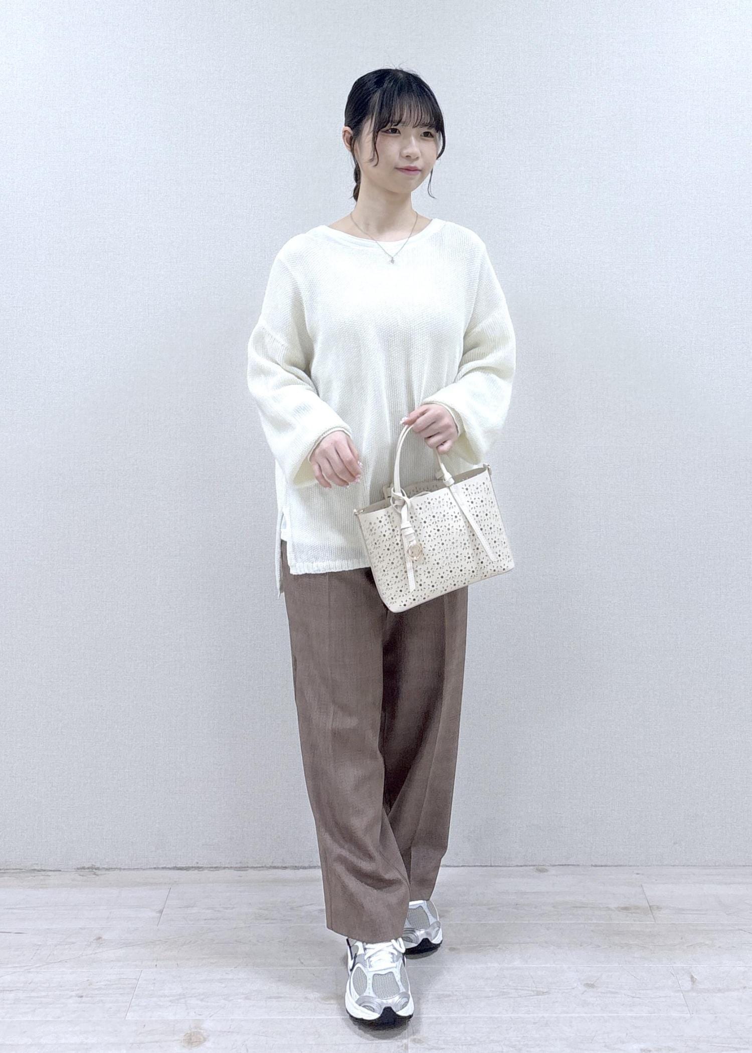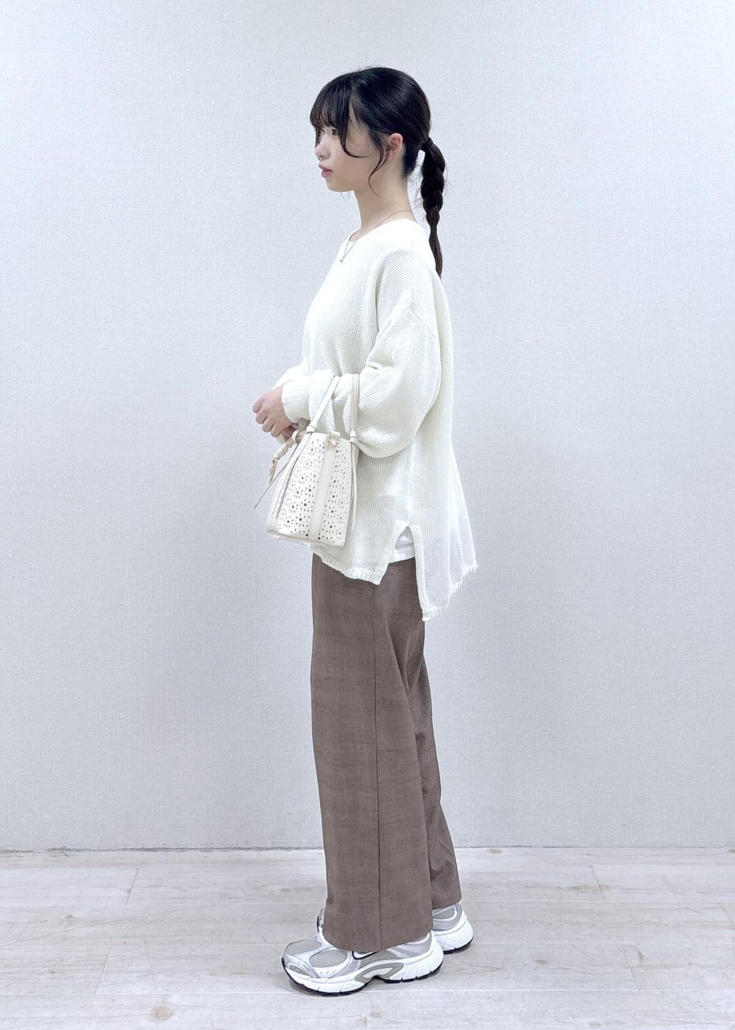 さり気ないキラキラが可愛いデイリー使いしやすいコーディネートです。どのアイテムも軽さのある素材感で、季節を選ばない色味なので、春夏〜秋もさらっと楽に着ていただけます。