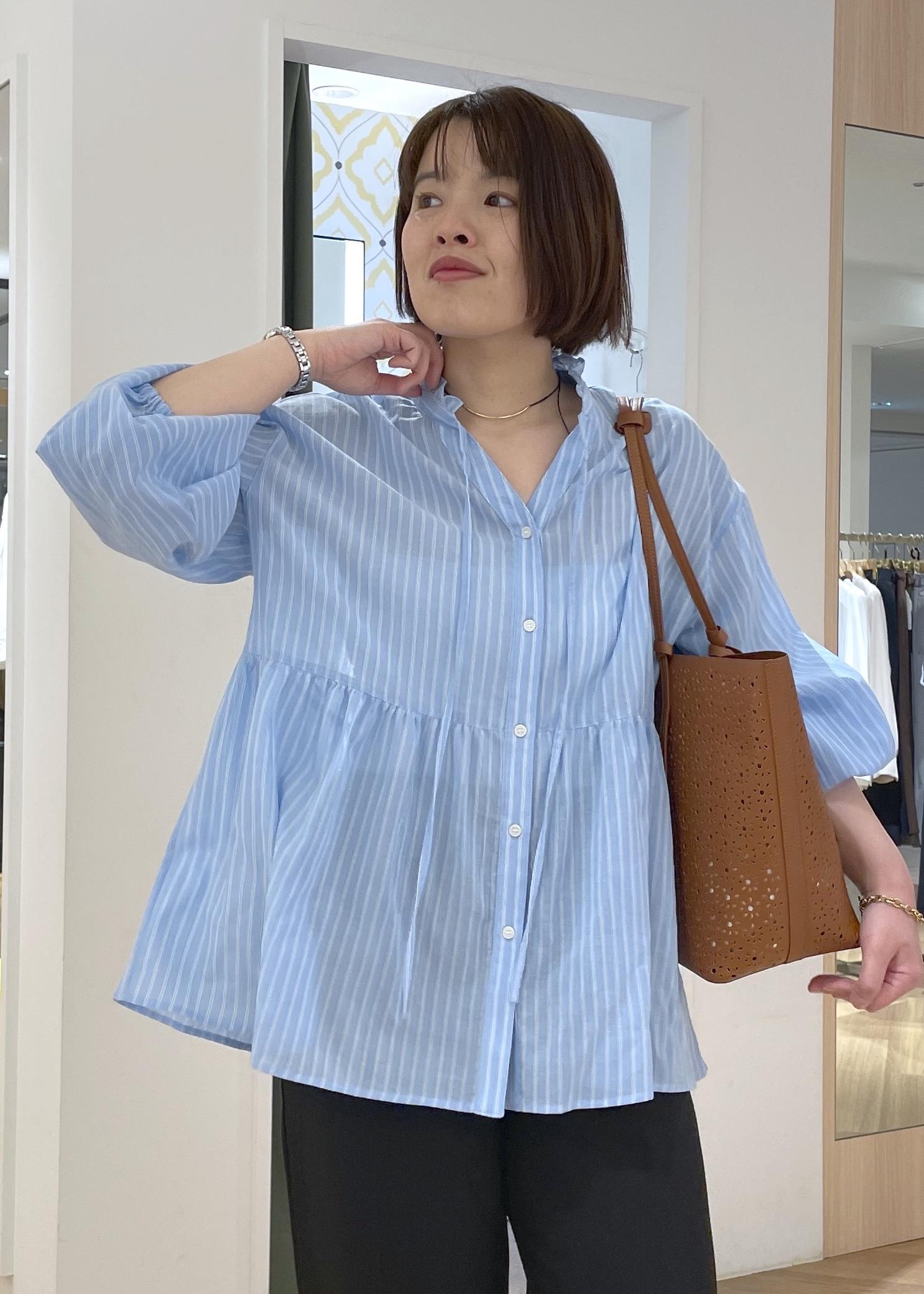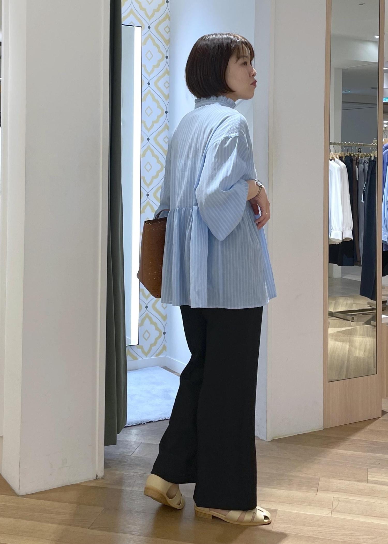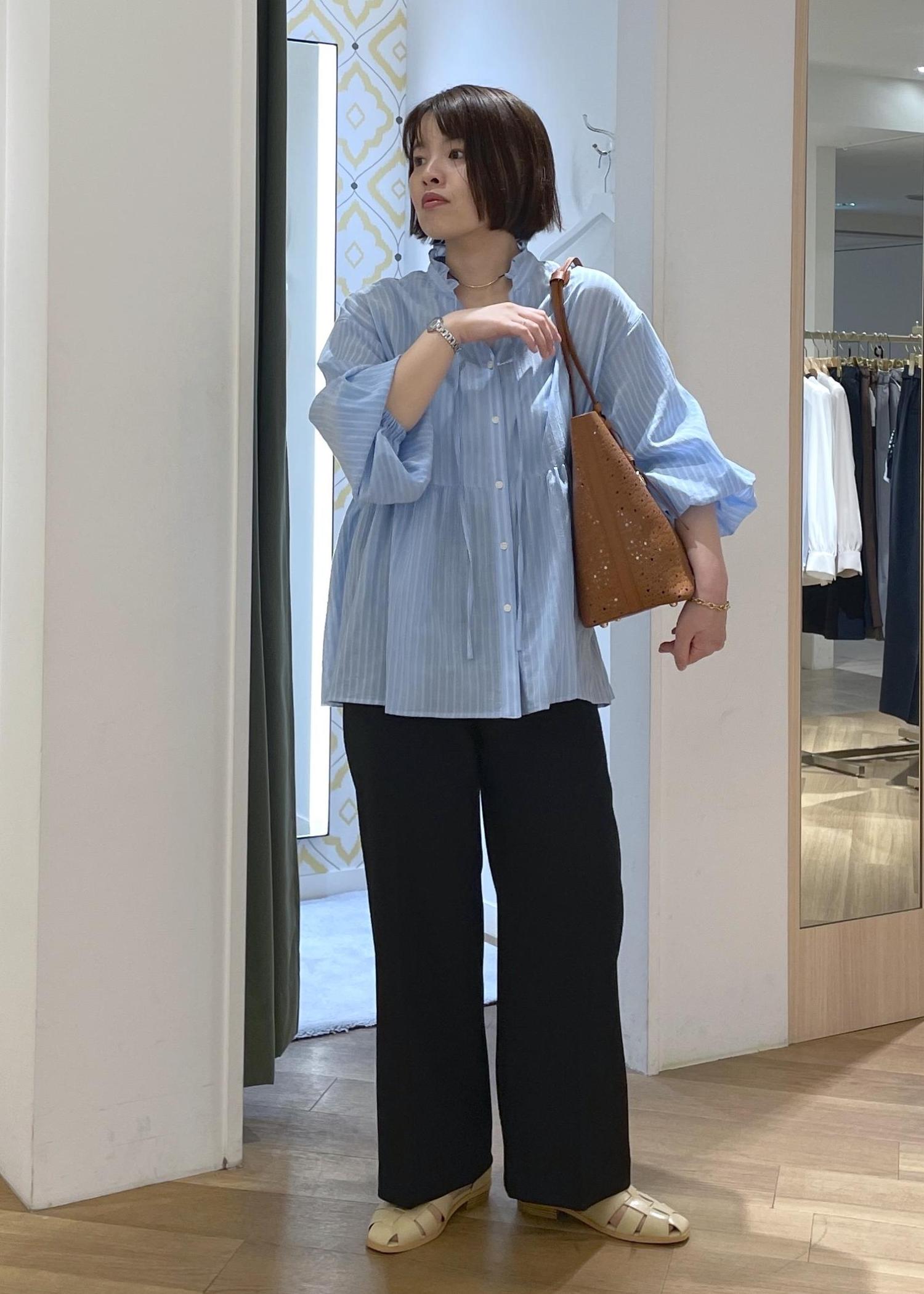 爽やかなストライプのスタンドフリルシャツにブラックのパンツを合わせた大人カジュアルコーデです!